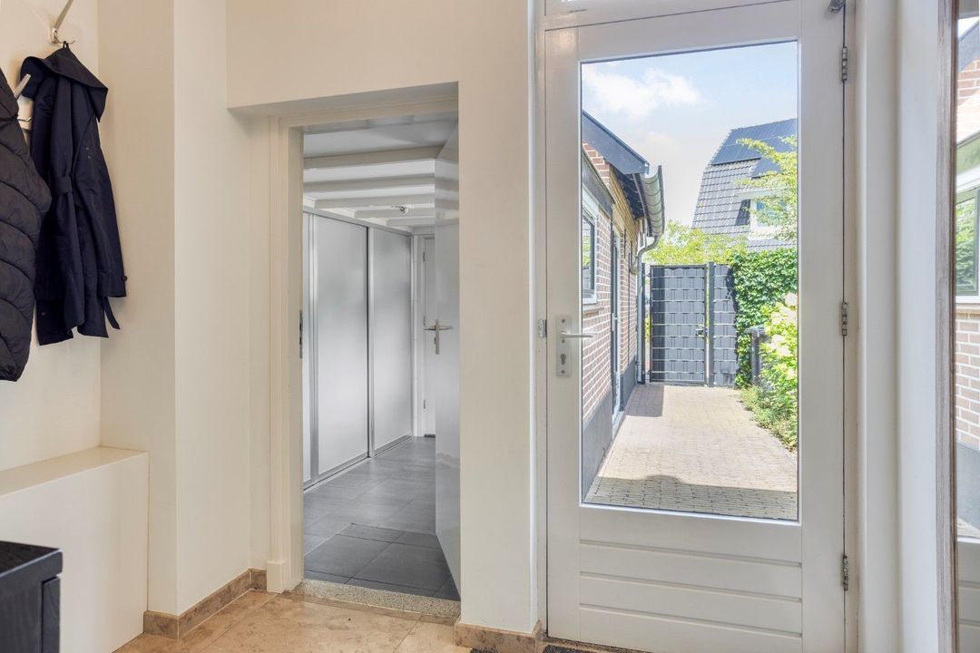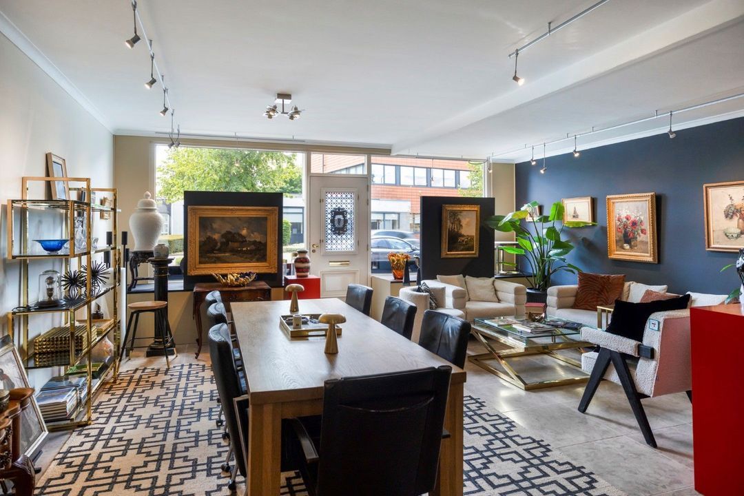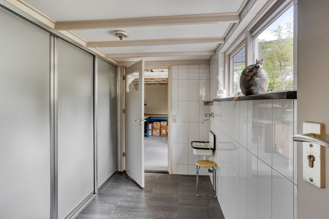 De entree van de winkel-/bedrijfsruimte bevindt zich aan de voorzijde. De open, lichte ruimte is royaal opgezet en flexibel in te delen, ideaal voor een winkel, atelier, praktijk of kantoor aan huis. Deze ruimte beschikt over een eigen pantry en toilet.