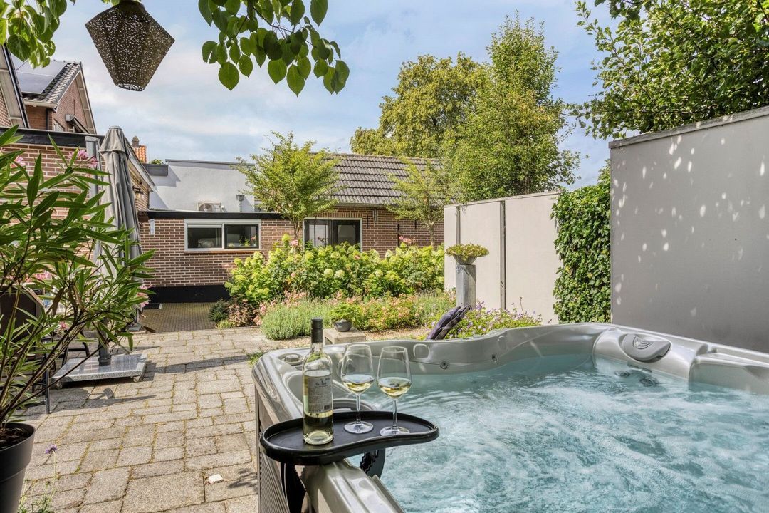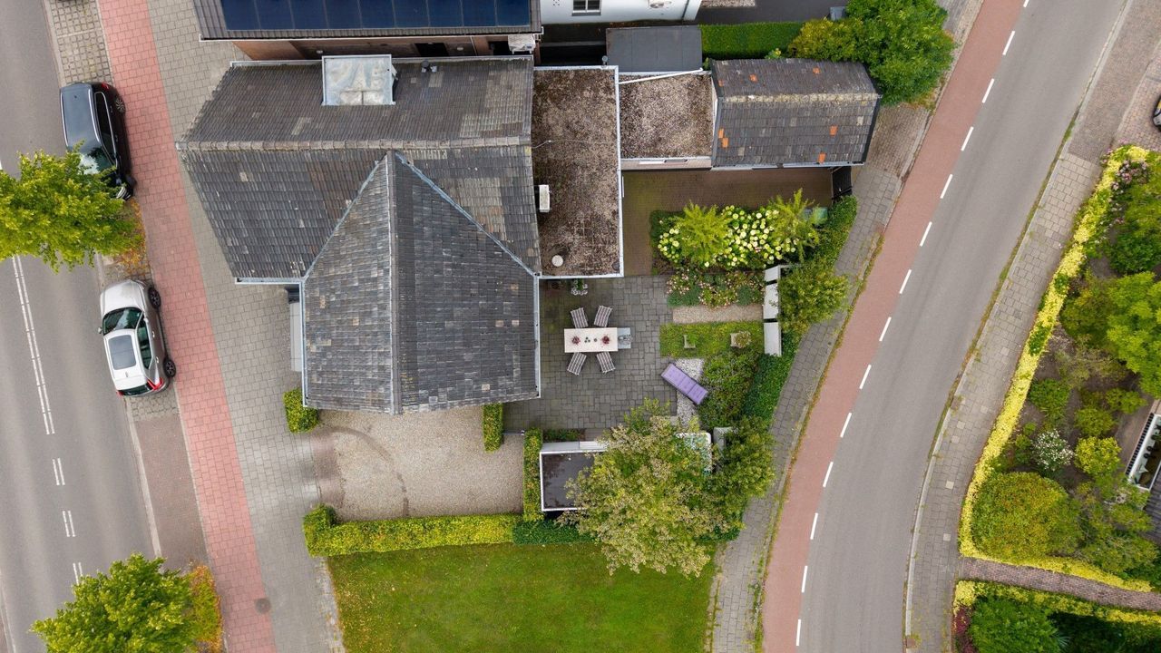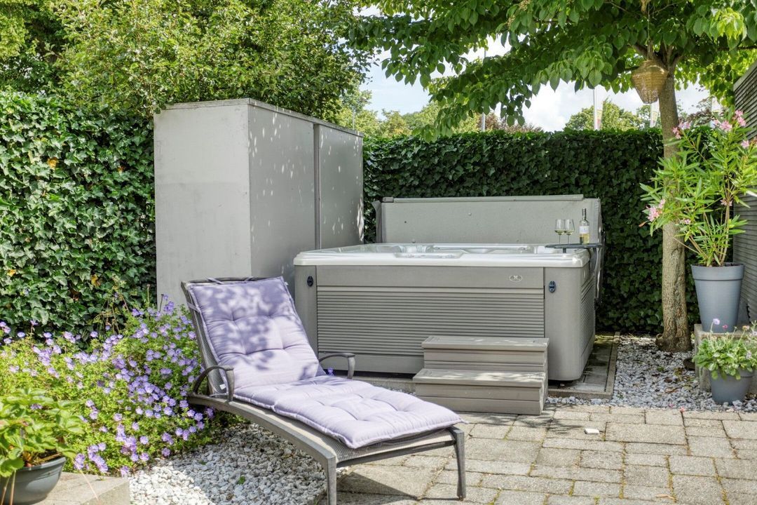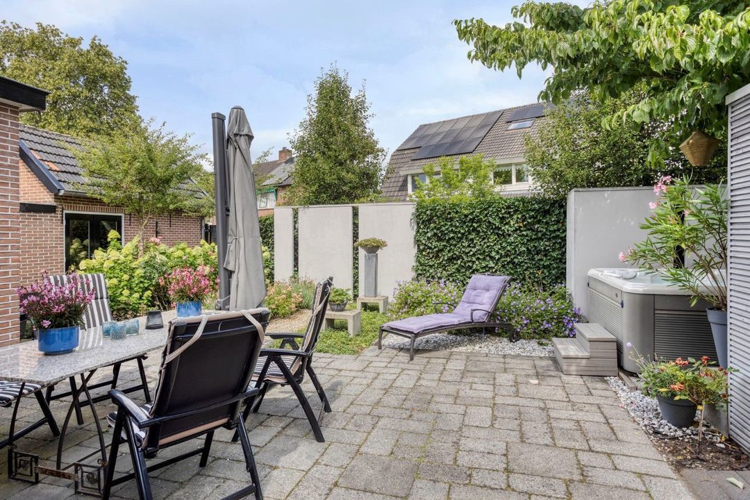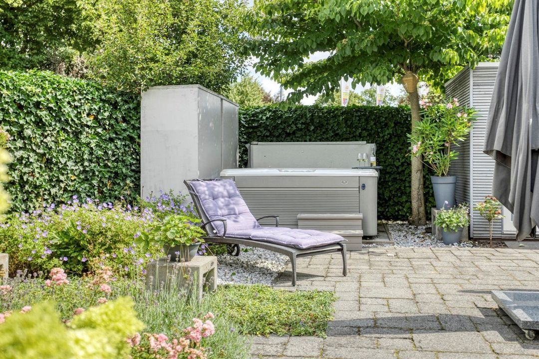 De onder architectuur aangelegde tuin biedt volop privacy en sfeer, met meerdere terrassen om van de zon te genieten. Daarnaast is er een vrijstaande berging en een eigen parkeerplaats op het perceel – comfortabel én praktisch.