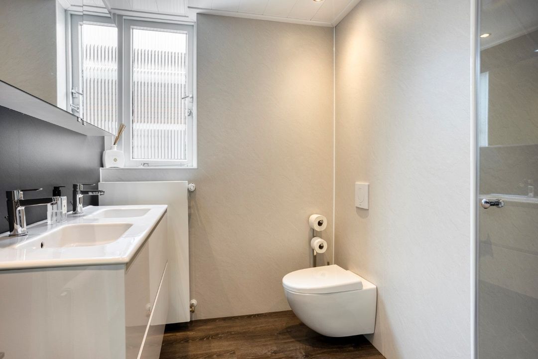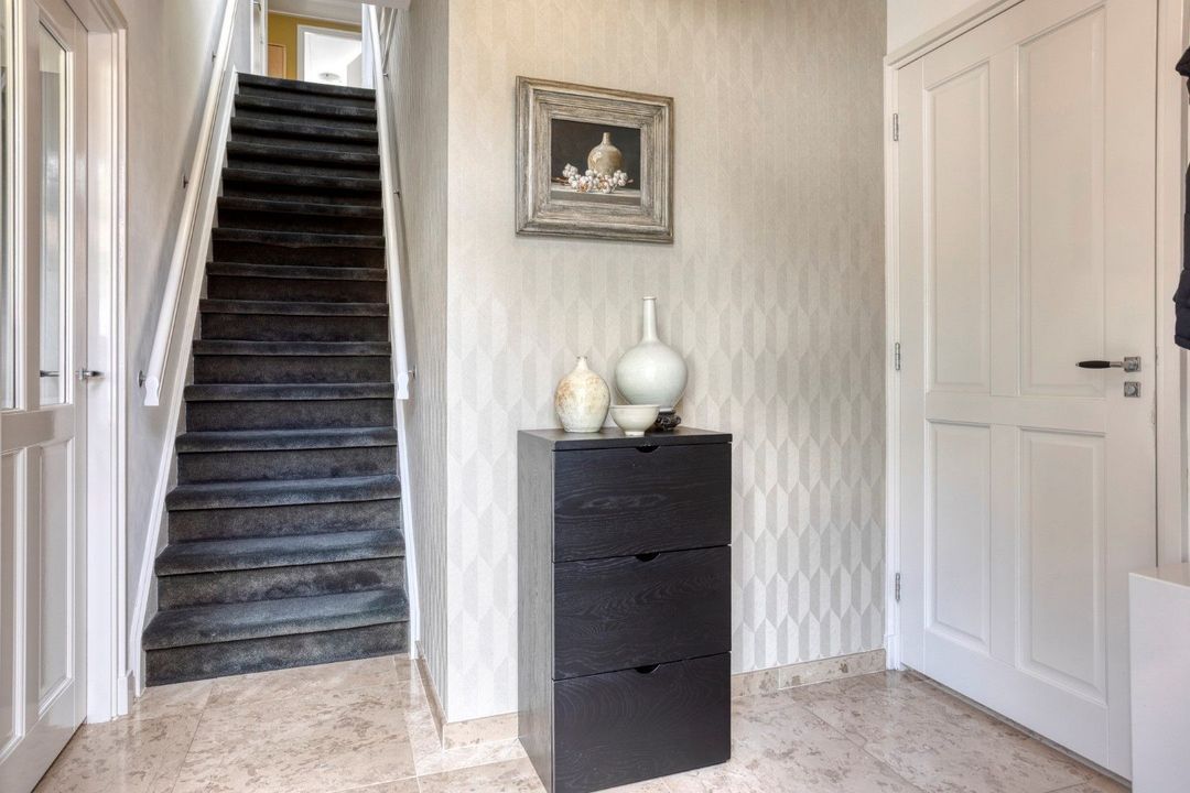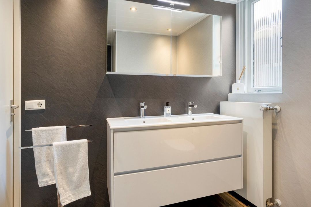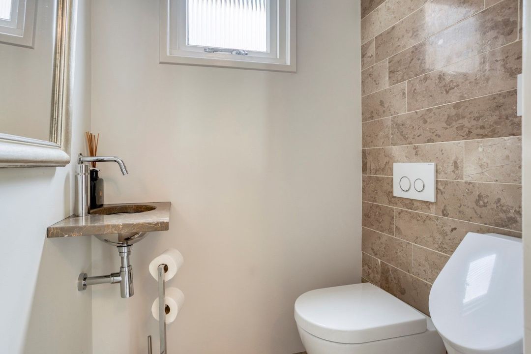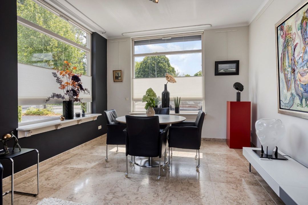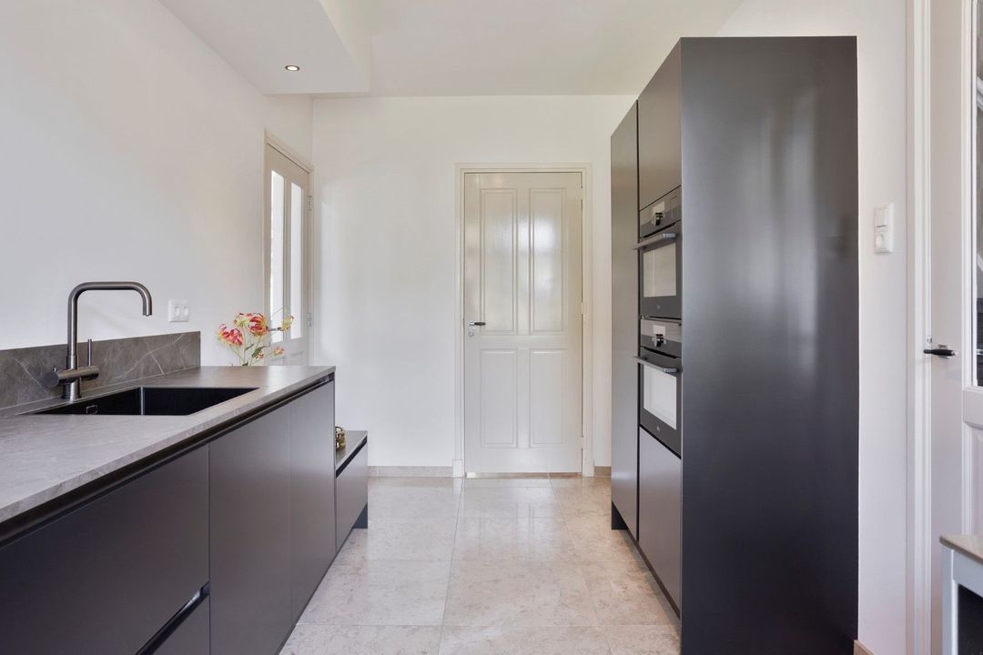 Aansluitend betreed je het woongedeelte. De ruime woonkamer is een oase van licht, met openslaande deuren naar de tuin, een marmeren vloer met vloerverwarming en elektrisch bedienbare raambekleding. De moderne keuken (2020) is voorzien van alle gewenste inbouwapparatuur en vormt een stijlvolle spil in het geheel. Verder vind je op de begane grond een bijkeuken, inpandige berging, een moderne toiletruimte met fonteintje en een hal met trapopgang naar de eerste verdieping.
