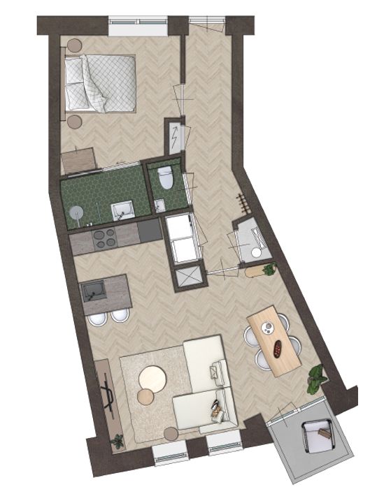 worden uitgerust met een vloerverwarming. Dit vloersysteem zorgt in de zomer voor het verkoelen van de appartementen. De energiezuinige warmtepomp regelt het verwarmingswater