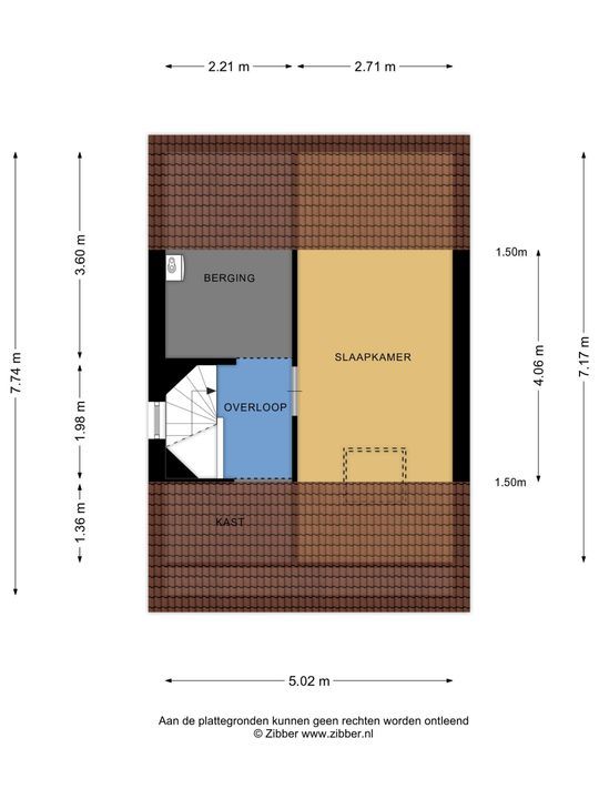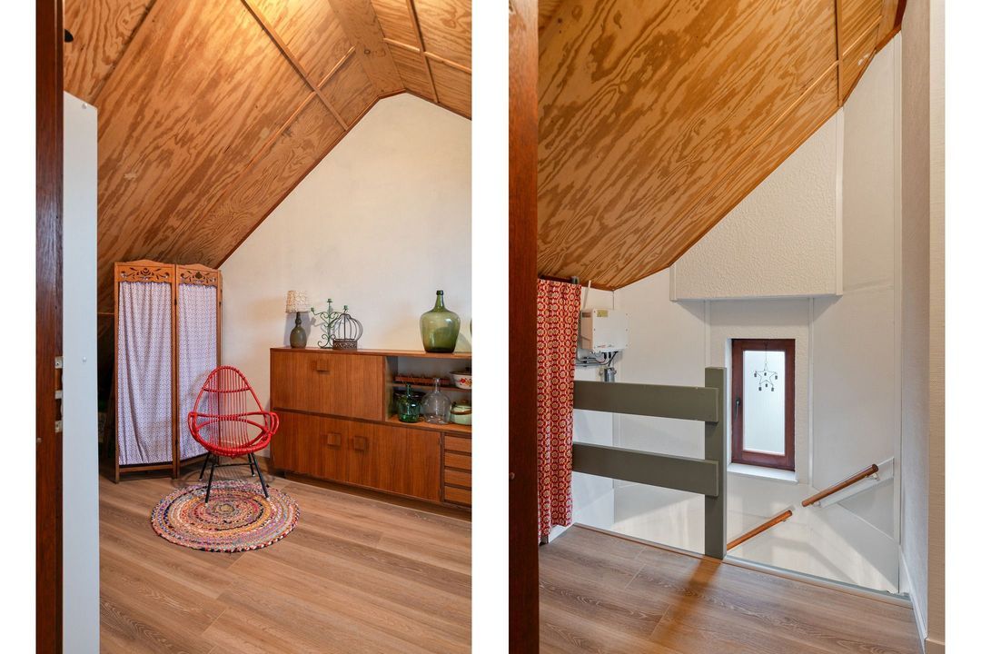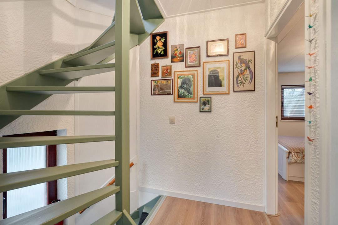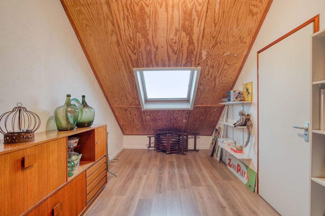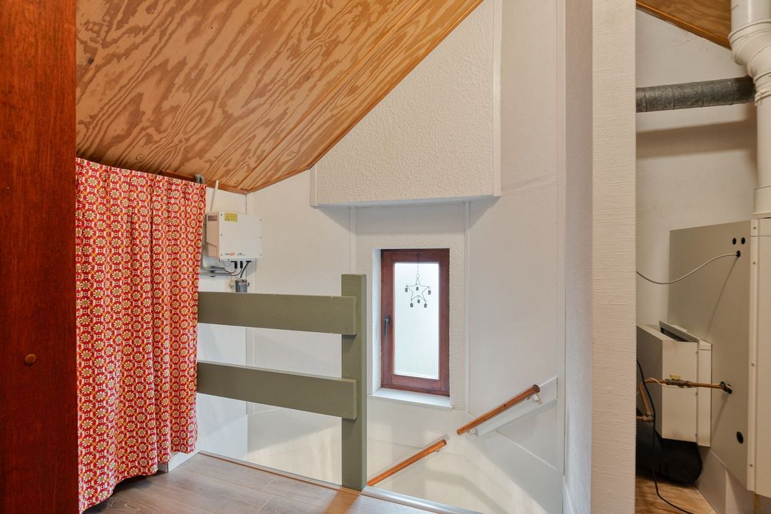 Overloop met veel bergruimte en opstelling van de heteluchtverwarming en een geiser voor warm water. Op deze verdieping bevindt zich tevens een ruime slaapkamer met dakraam.