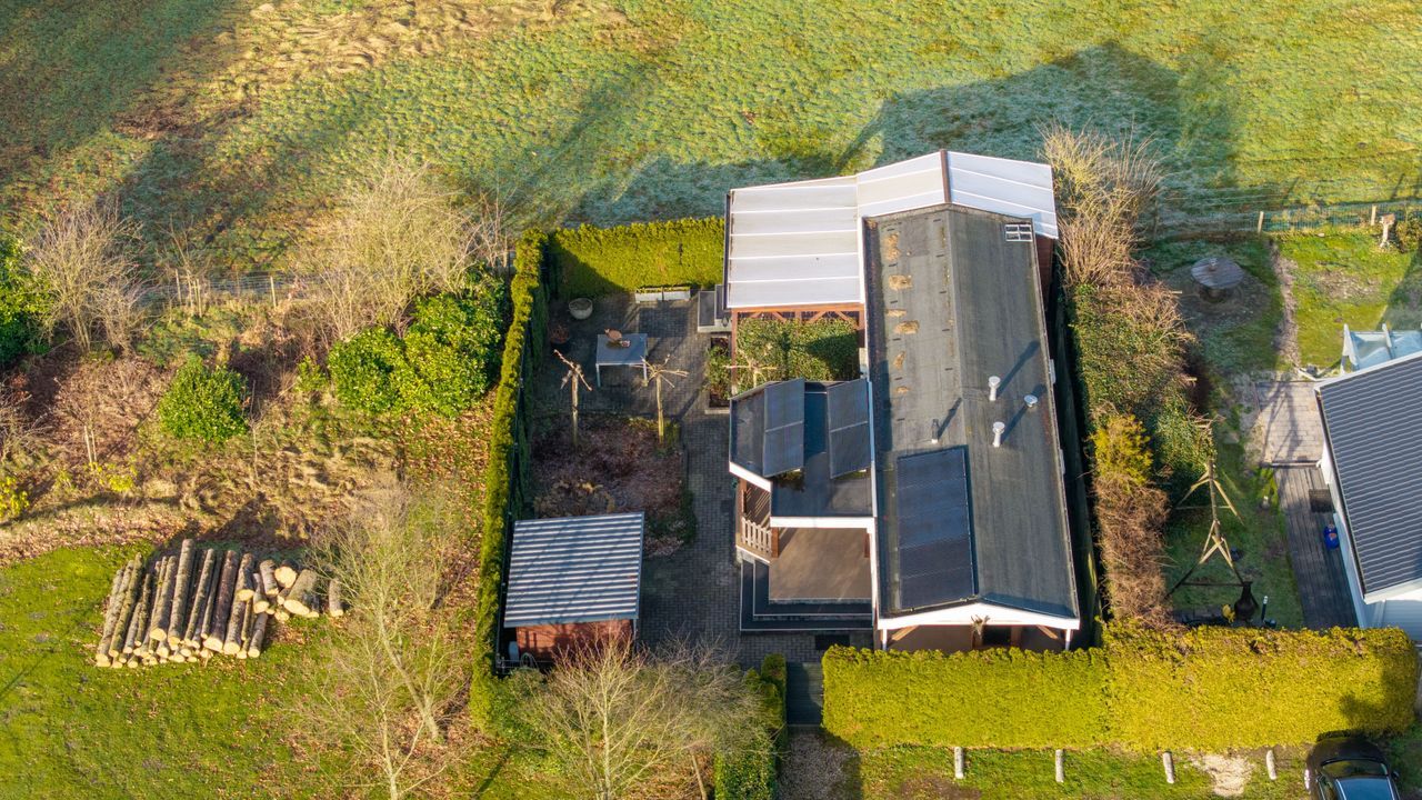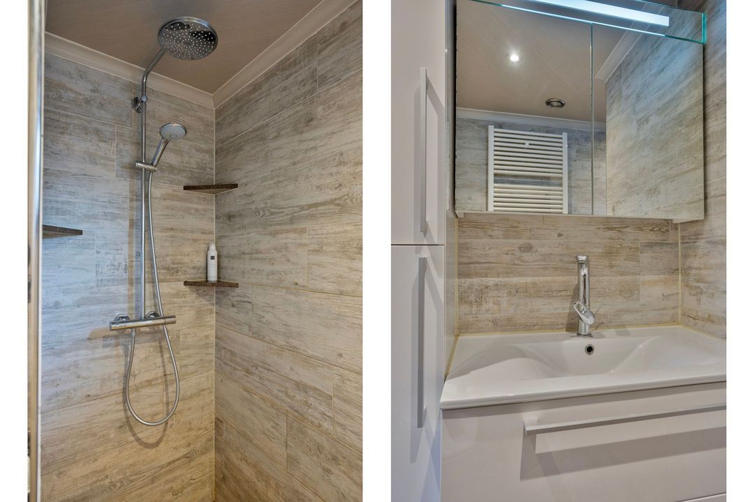 Het chalet is volledig geïsoleerd en voorzien van airconditioning en 9 zonnepanelen, waardoor u het gehele jaar door comfortabel kunt verblijven. De indeling is praktisch en sfeervol en bestaat uit een entree met hal, een moderne badkamer, een slaapkamer met vaste kastenwand en een royale woonkamer met keuken in hoekopstelling voorzien van diverse inbouwapparatuur. Tevens is er een prachtige houten vloer aanwezig. Dankzij de grote raampartijen geniet u van veel lichtinval en een directe verbinding met de natuur.