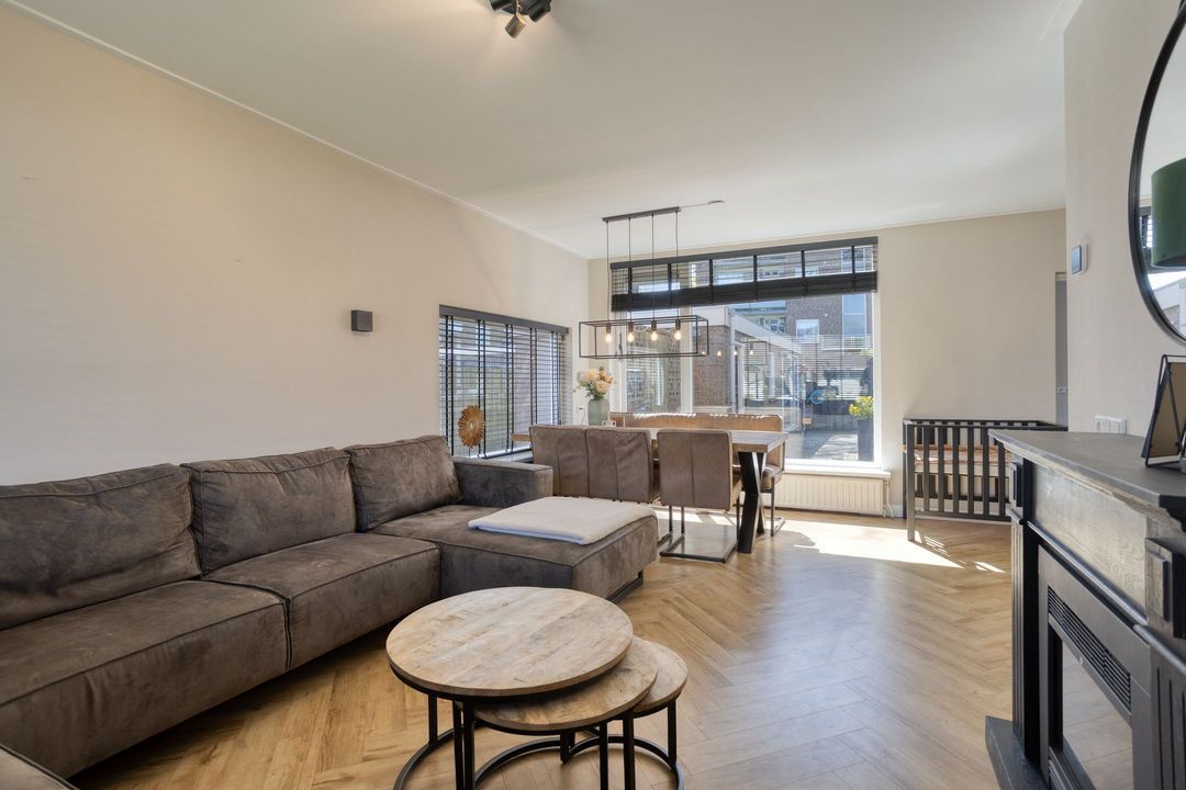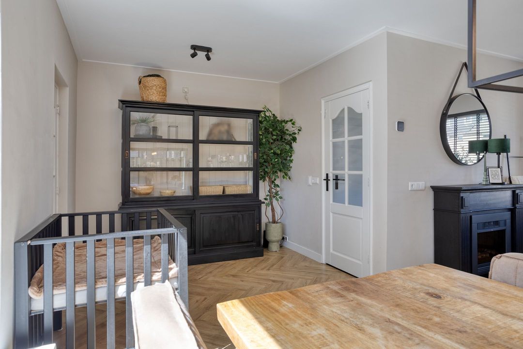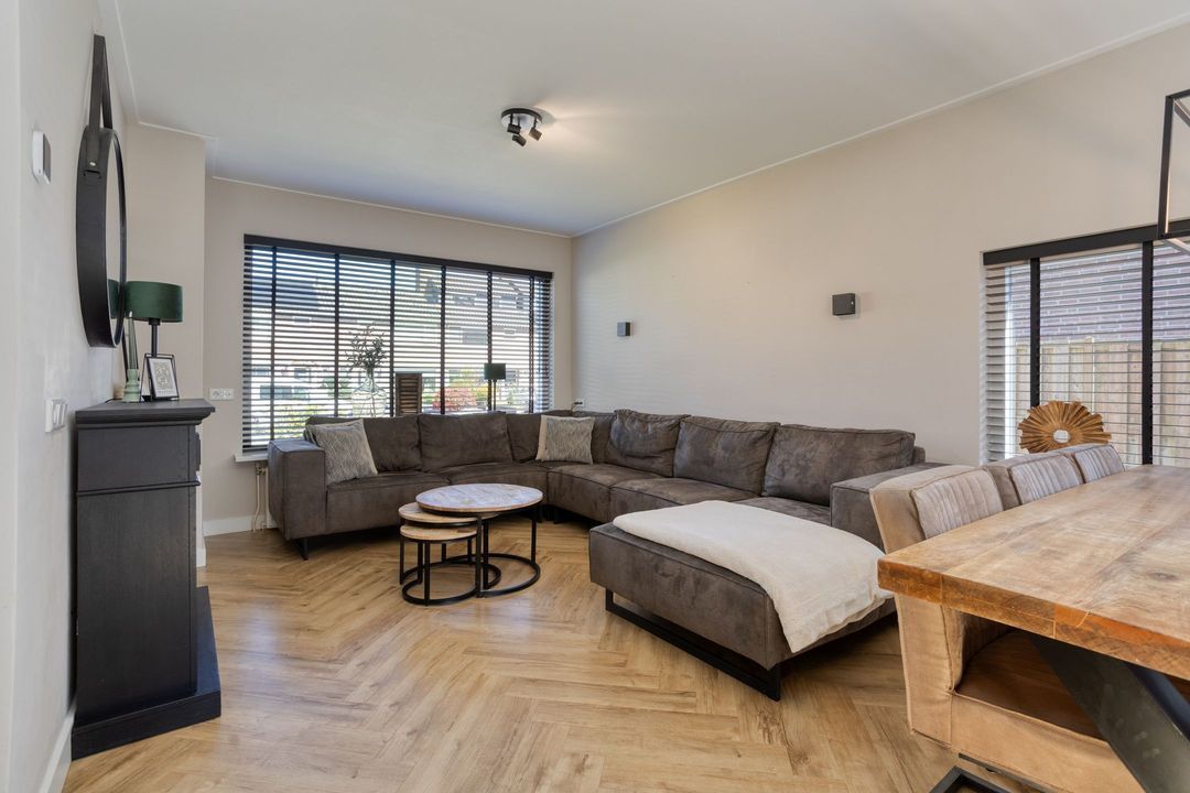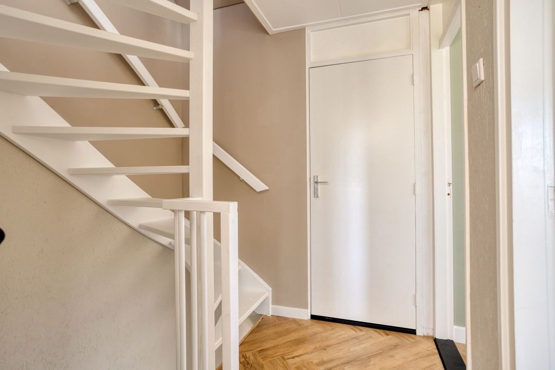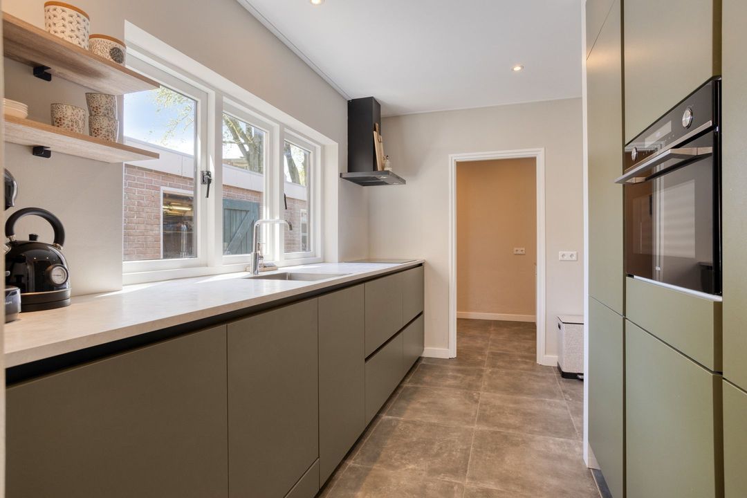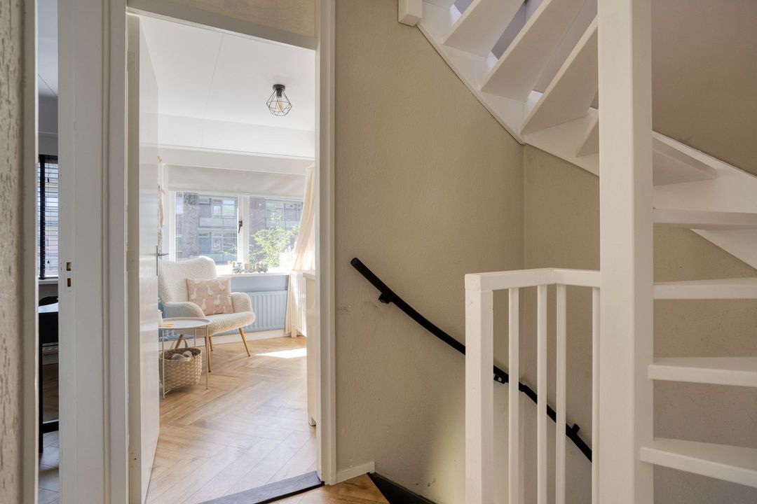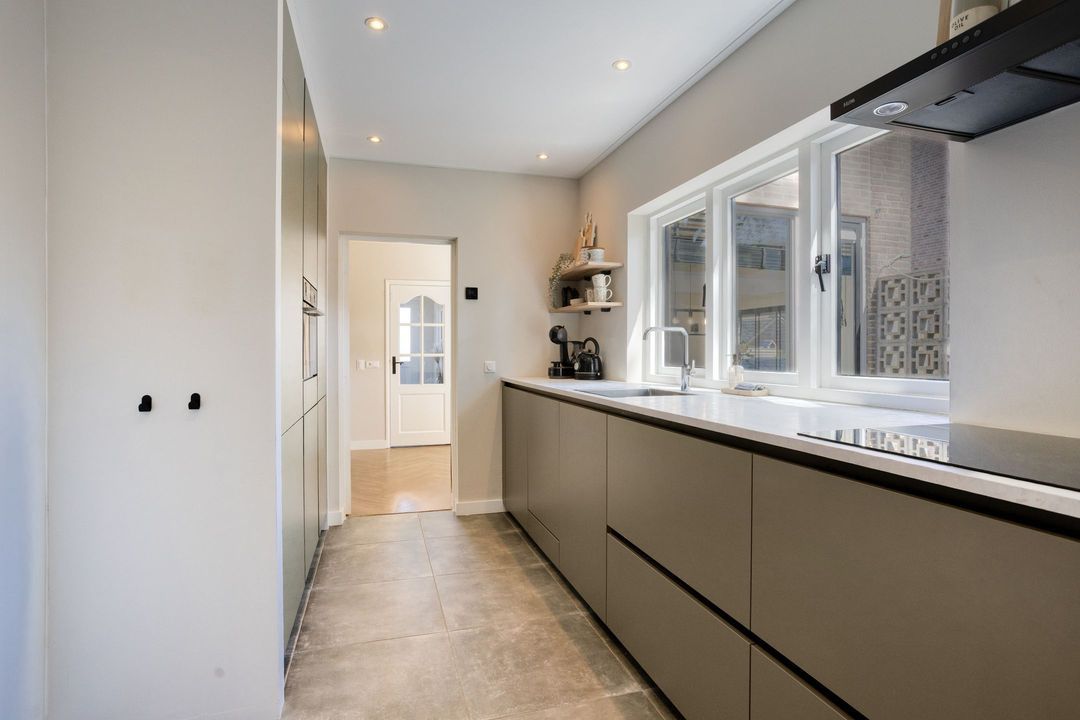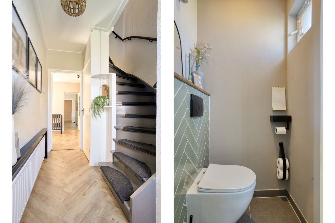Via de entree komt u in de hal met modern toilet, trapopgang en praktische trapkast. De lichte woonkamer valt direct op door de grote raampartijen die zorgen voor een prettige lichtinval en een ruimtelijk gevoel. De keurige visgraat laminaatvloer geeft het geheel een moderne en warme uitstraling. Aan de achterzijde, in de uitbouw, bevindt zich de moderne keuken (2023), die is voorzien van alle gewenste inbouwapparatuur. Aansluitend vindt u de bijkeuken/achterentree met toegang tot de achtertuin.