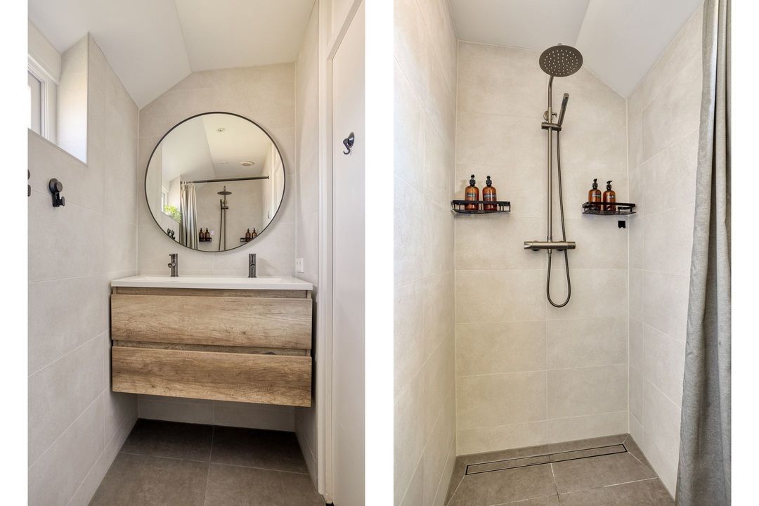 De overloop geeft toegang tot drie keurig afgewerkte slaapkamers. De moderne badkamer (2023) is keurig ingericht en voorzien van een douche en een vaste wastafel met meubel.