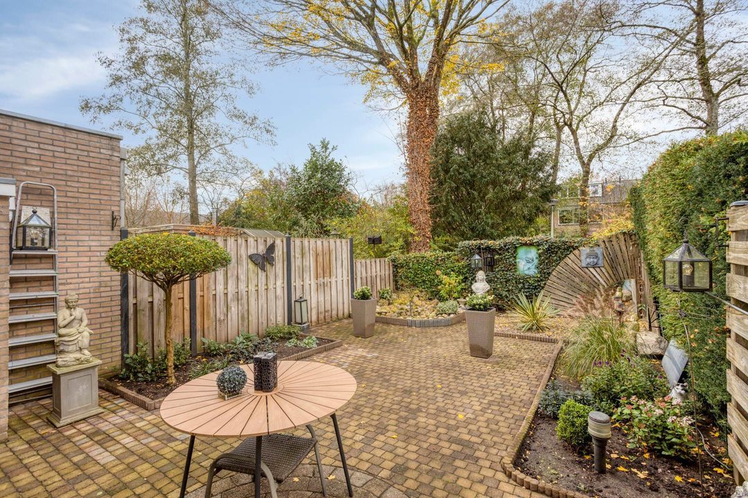 De achtertuin is gelegen op het westen en is verzorgd aangelegd met een ruim terras, groot zonnescherm en een achterom. Dankzij de ligging aan een groenstrook biedt de tuin veel privacy.