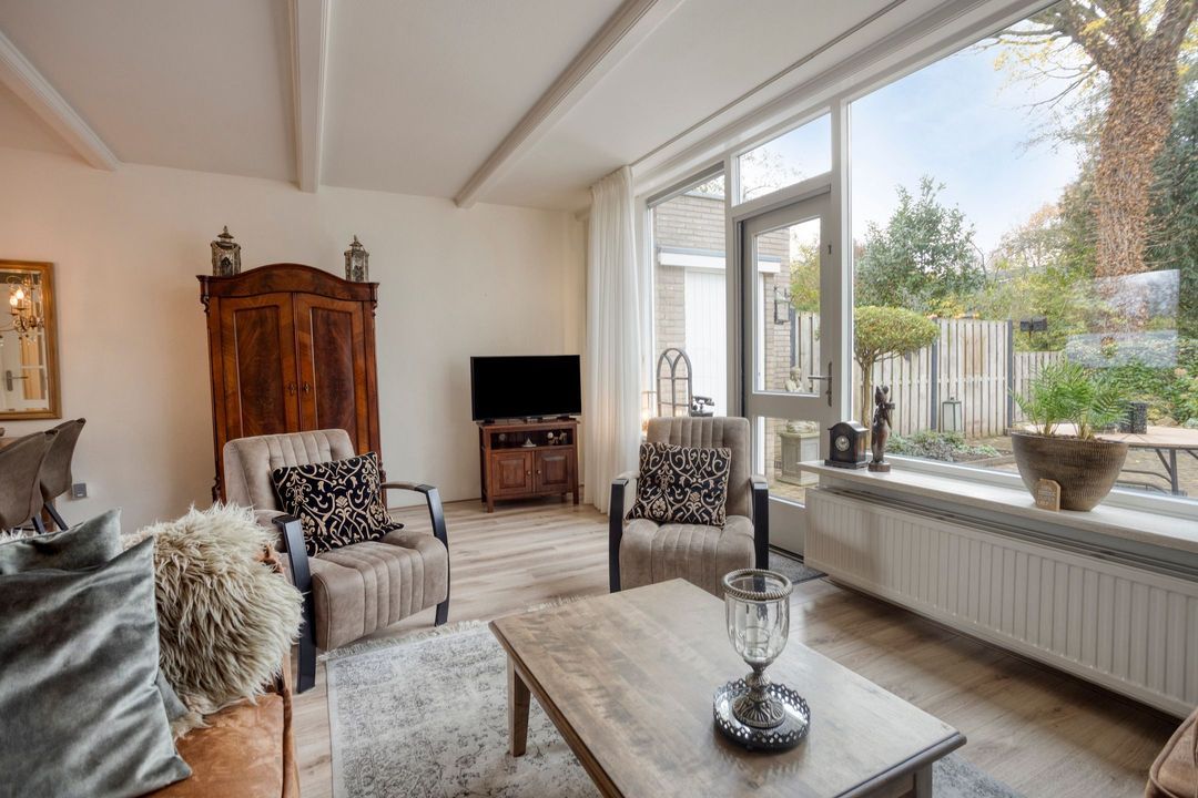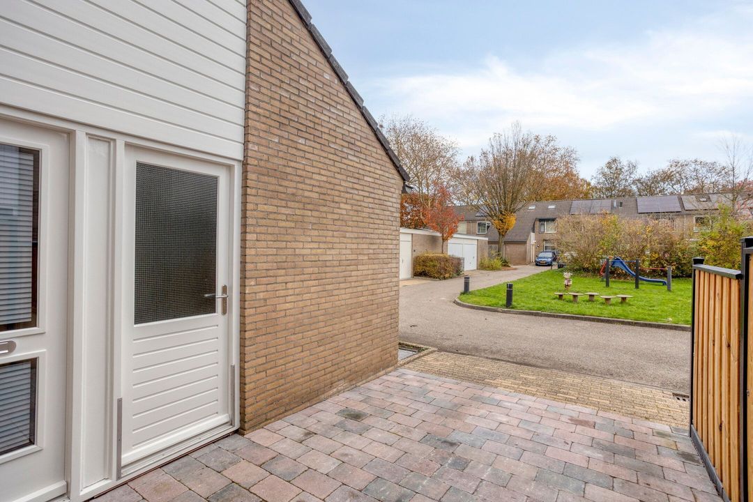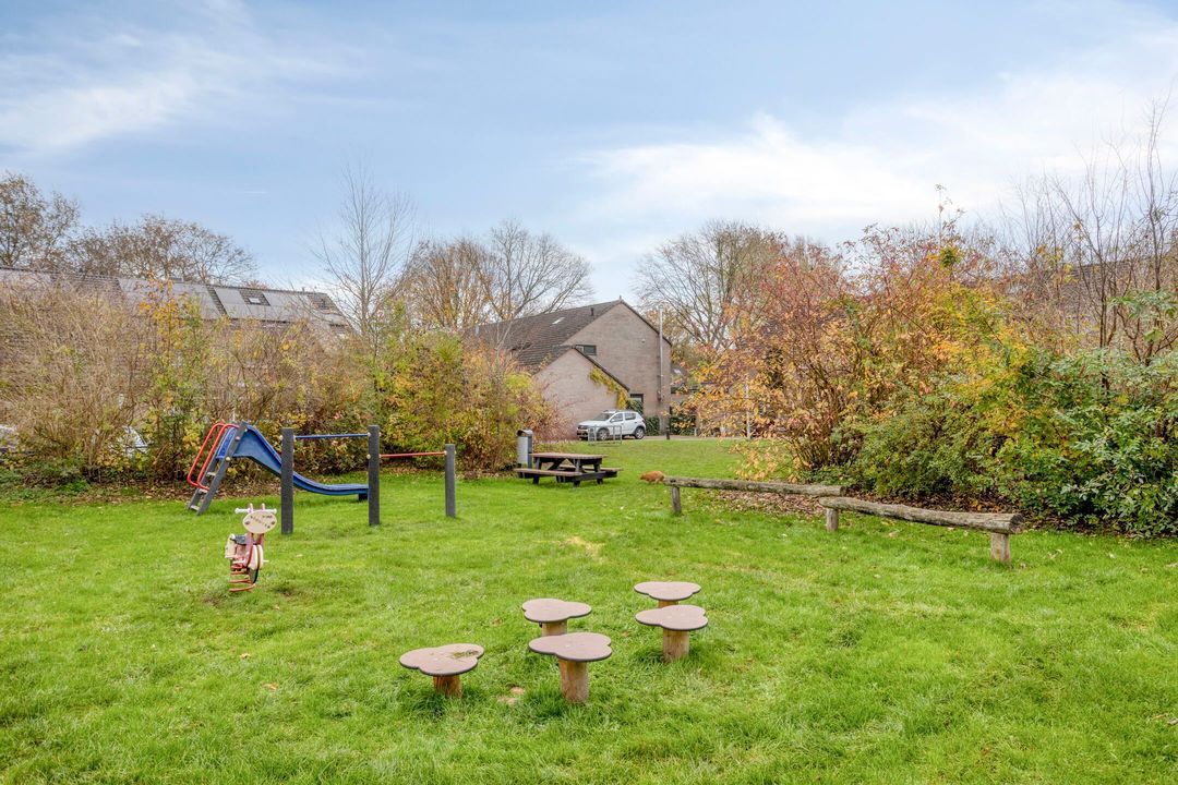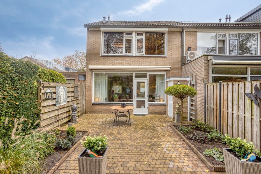 De achtertuin is gelegen op het westen en is verzorgd aangelegd met een ruim terras, groot zonnescherm en een achterom. Dankzij de ligging aan een groenstrook biedt de tuin veel privacy.