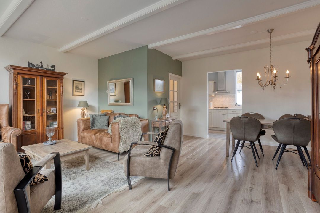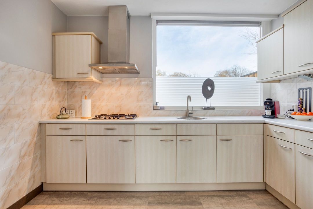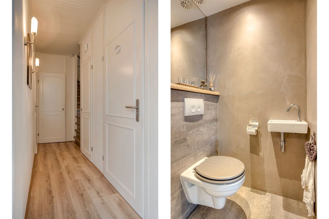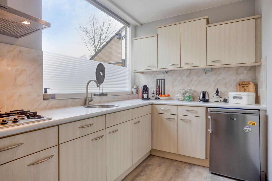 Entree met ruime hal, modern toilet met fonteintje (2024) en een praktische voorraadkast. De keuken, in hoekopstelling, bevindt zich aan de voorzijde van de woning en kijkt uit over het speelveld. De tuingerichte woonkamer heeft veel lichtinval, een nette laminaatvloer en keurig afgewerkte wanden en plafonds. Via de deur aan de achterzijde is de tuin bereikbaar.