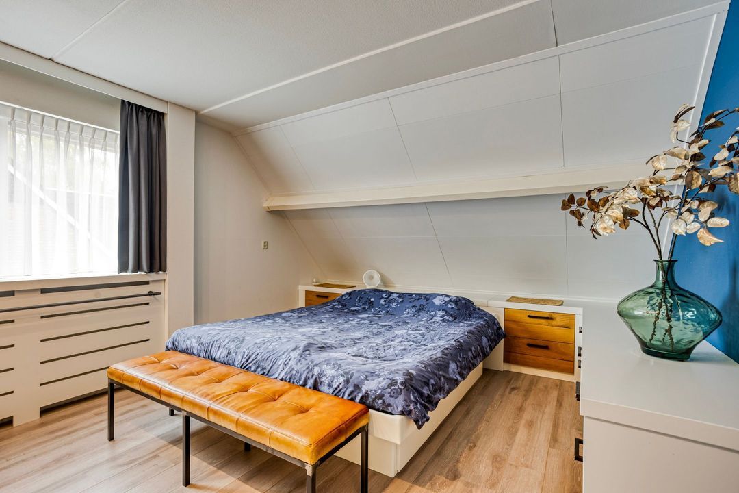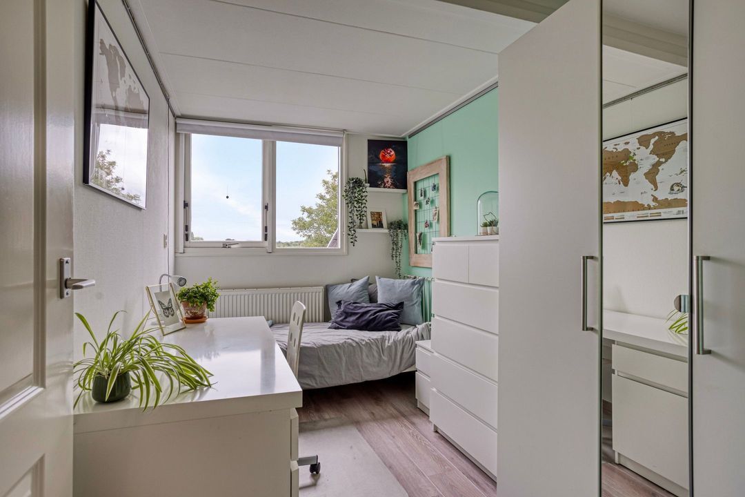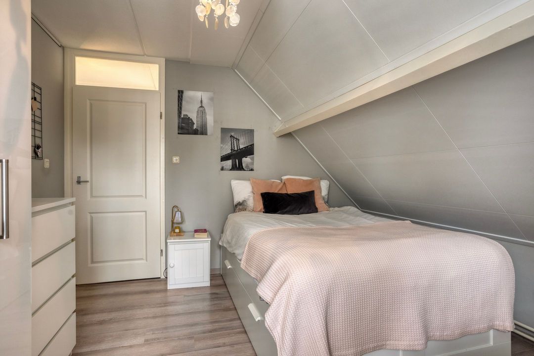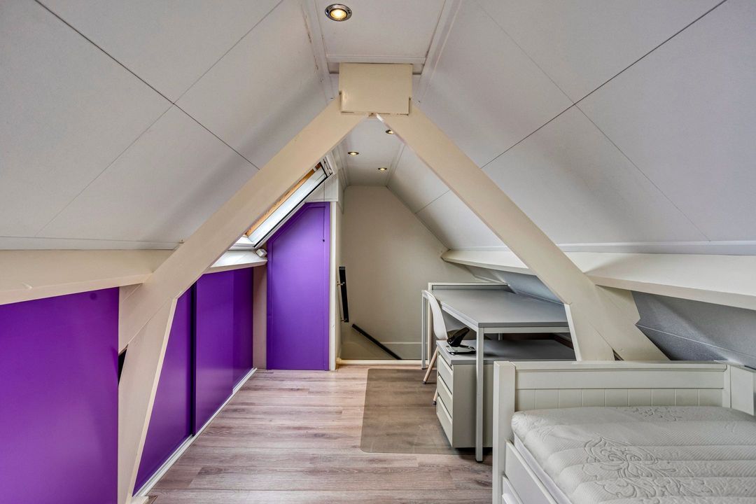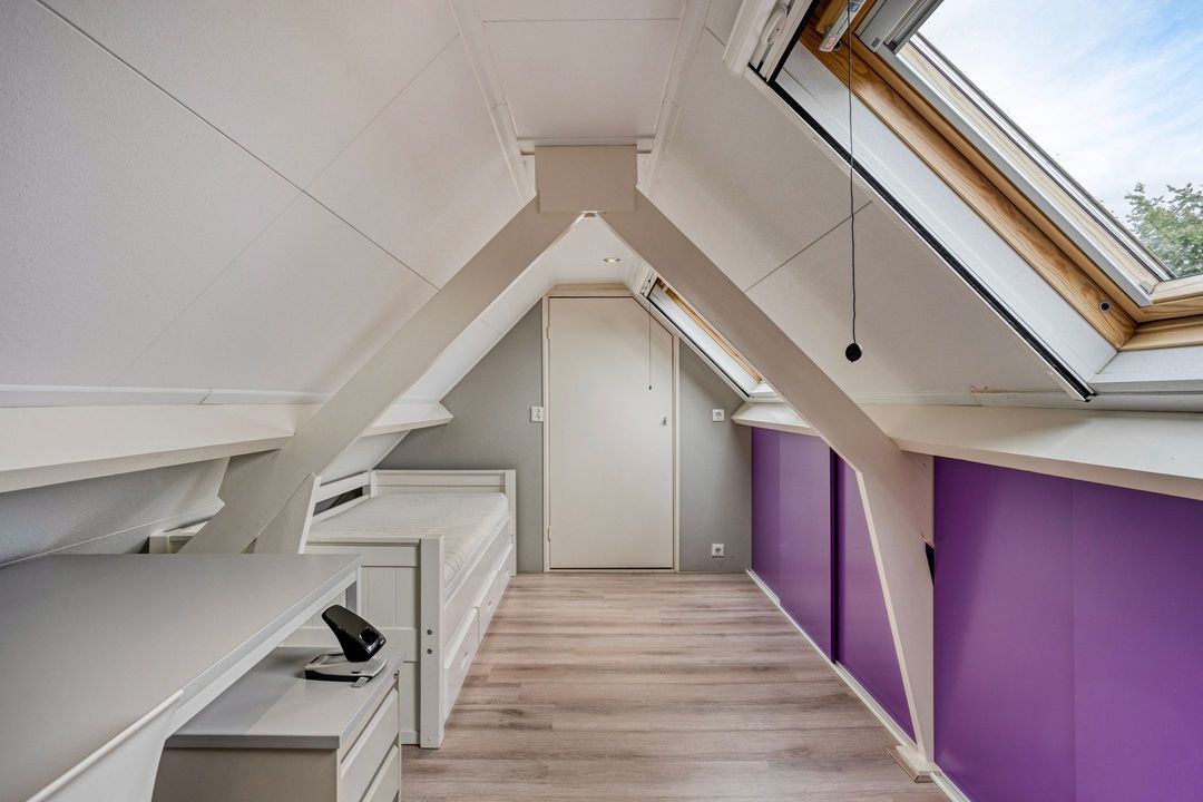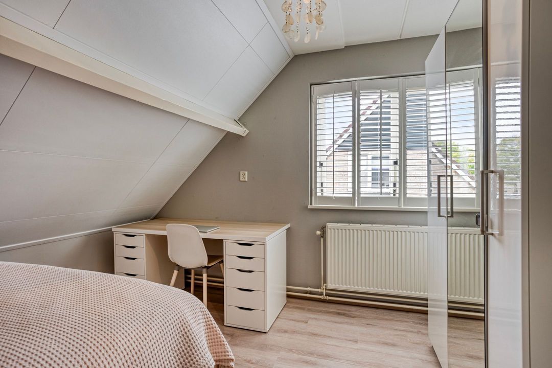De tweede verdieping biedt een extra kamer, thans in gebruik als werkkamer, voorzien van inbouwkasten, twee dakramen en bergruimte met de opstelling van de cv-ketel.