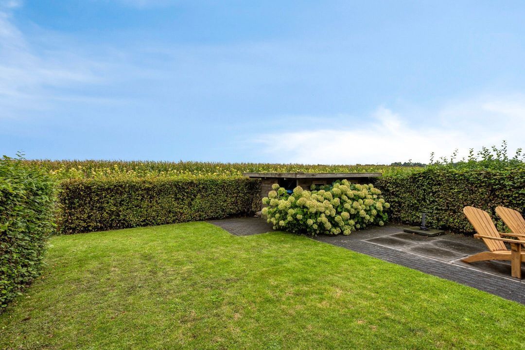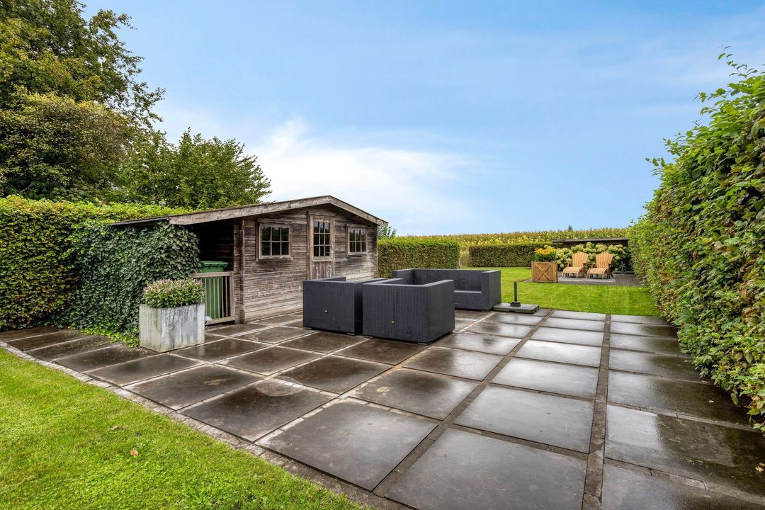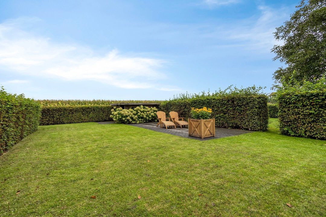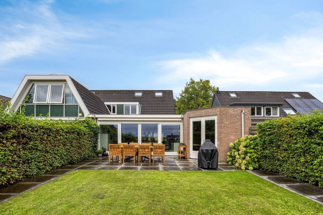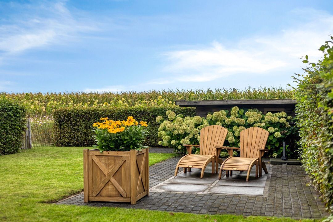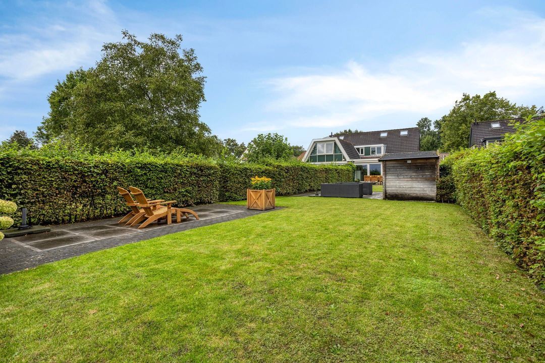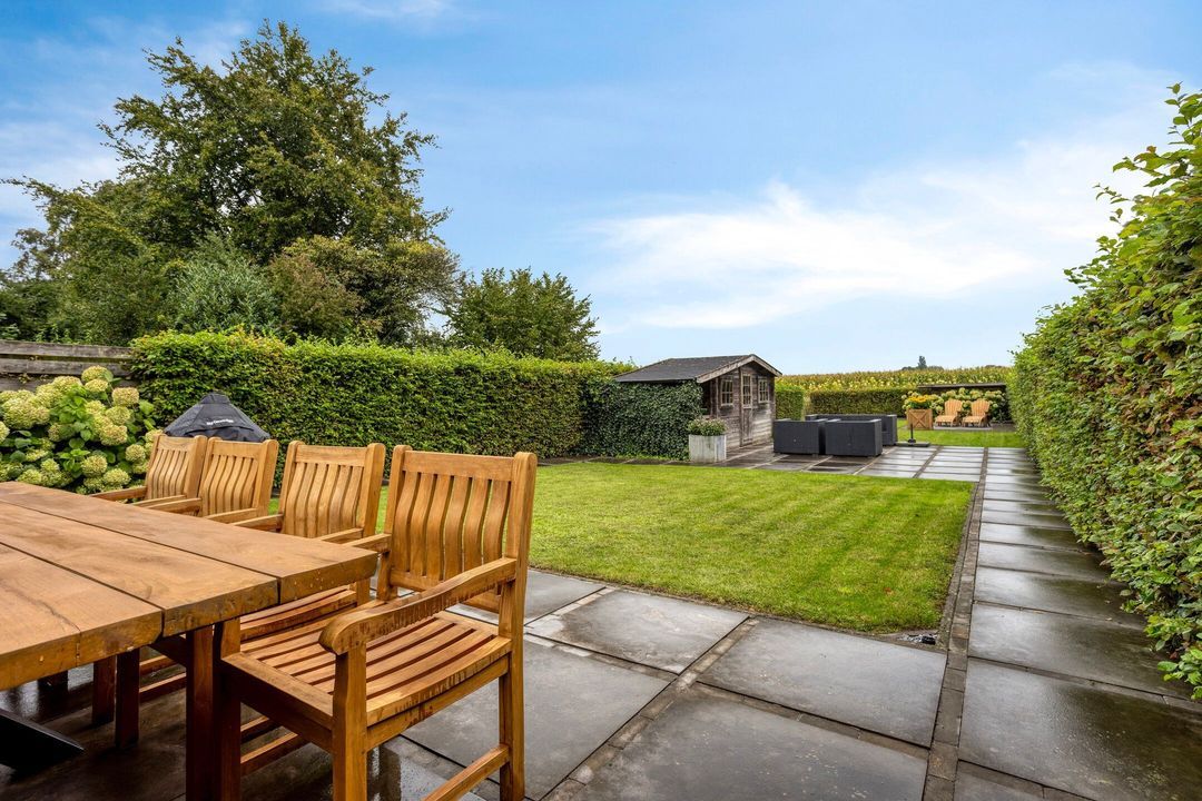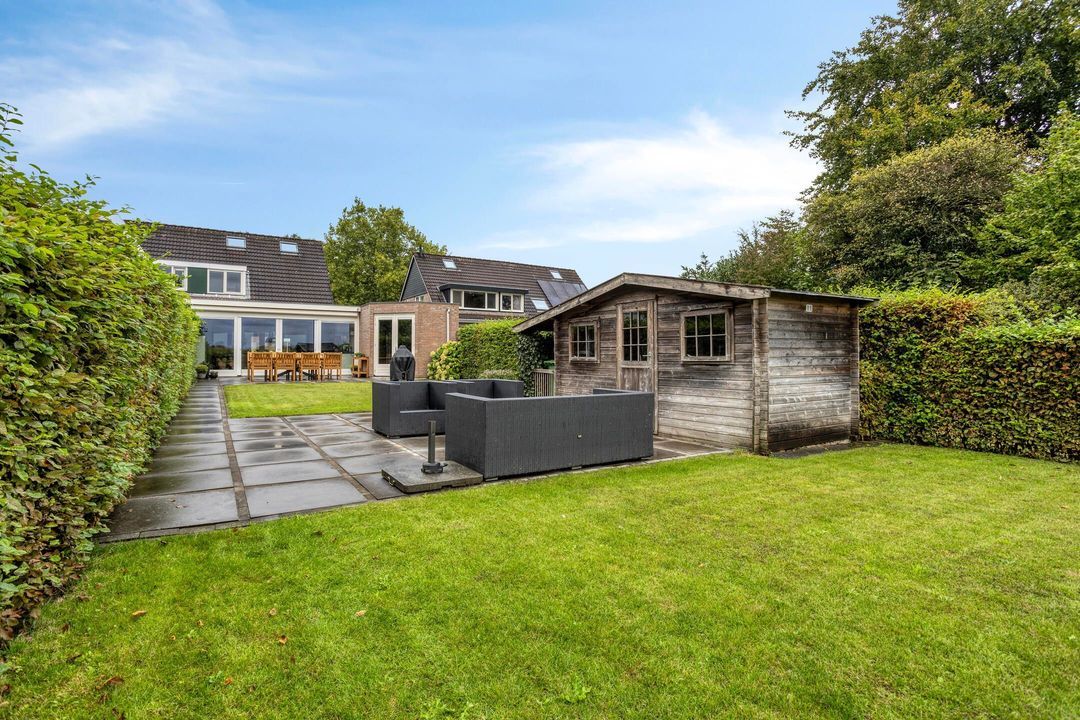 De tuin is zowel aan de voor- als achterzijde verzorgd aangelegd en biedt volop mogelijkheden om te genieten van het buitenleven. De diepe achtertuin beschikt over meerdere terrassen, twee houten bergingen en een prachtig weids uitzicht over de omliggende weilanden.