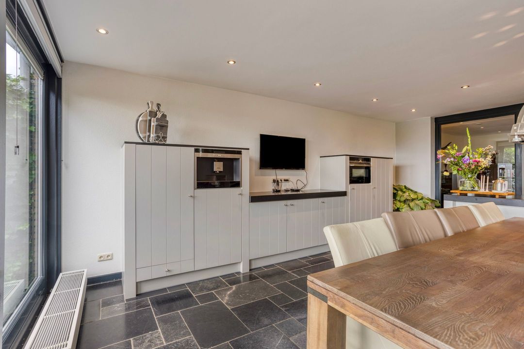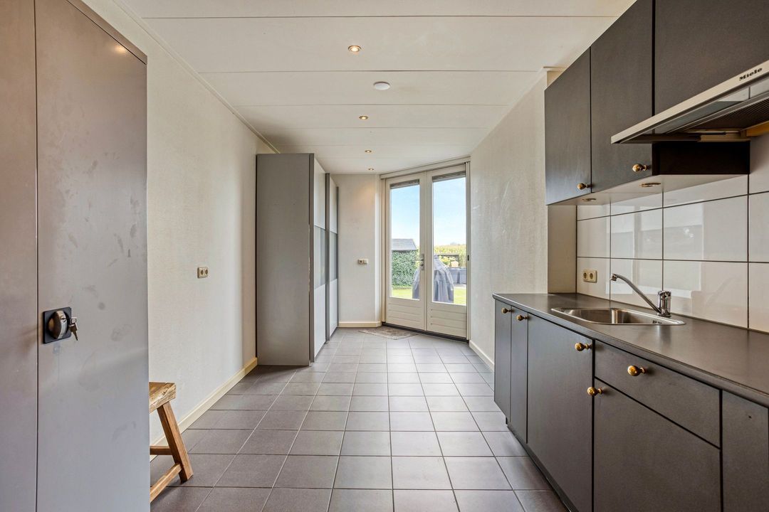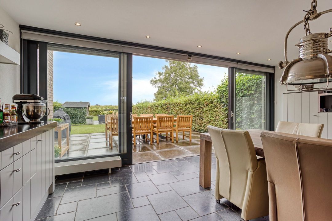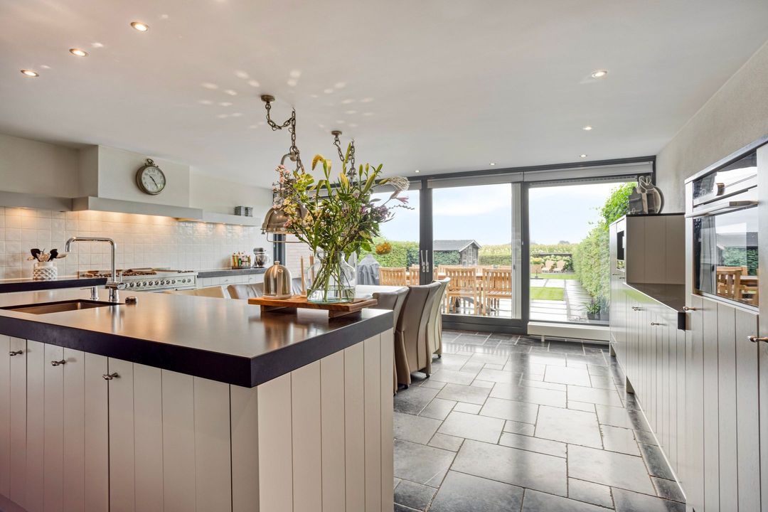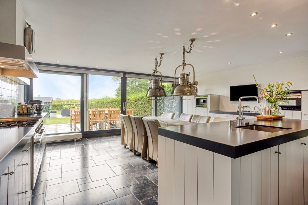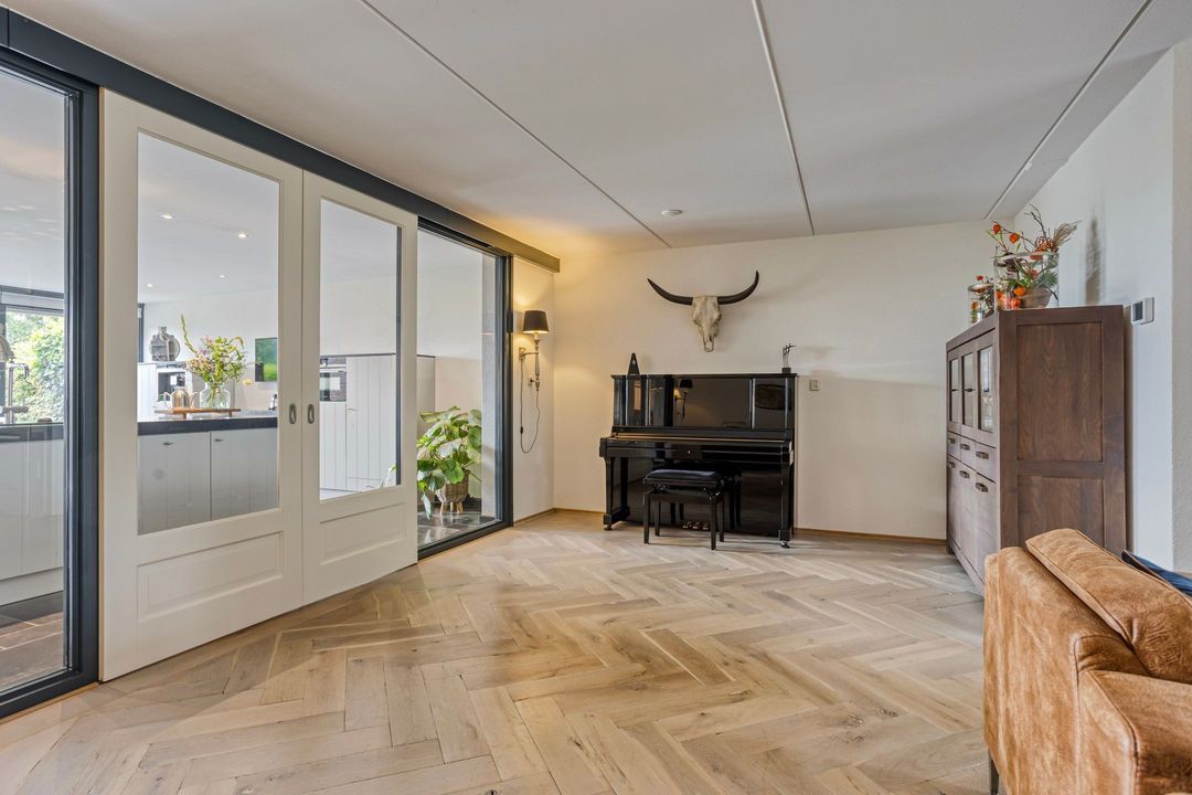 Op de begane grond treft u een ruime hal met toilet en meterkast. De royale L-vormige woonkamer is voorzien van een fraaie eiken visgraatvloer en biedt via schuifdeuren toegang tot de woonkeuken van circa 38 m². Deze luxe keuken is uitgerust met een moderne opstelling, hoogwaardige inbouwapparatuur – waaronder een Boretti gascomfort met dubbele oven – en een royaal spoeleiland. Vanuit de keuken geven schuifpuien toegang tot de diepe achtertuin met prachtig uitzicht over de weilanden. Aan de zijkant bevindt zich een praktische berging met aansluitingen voor wasapparatuur, een bijkeuken met extra keukenopstelling en aan de voorzijde een fietsenberging met vaste kastenwand. De gehele uitbouw is voorzien van vloerverwarming en een elektrisch uitvalscherm.