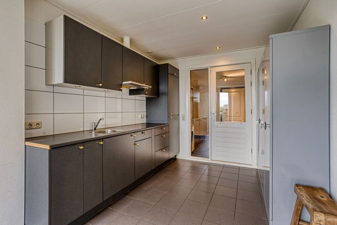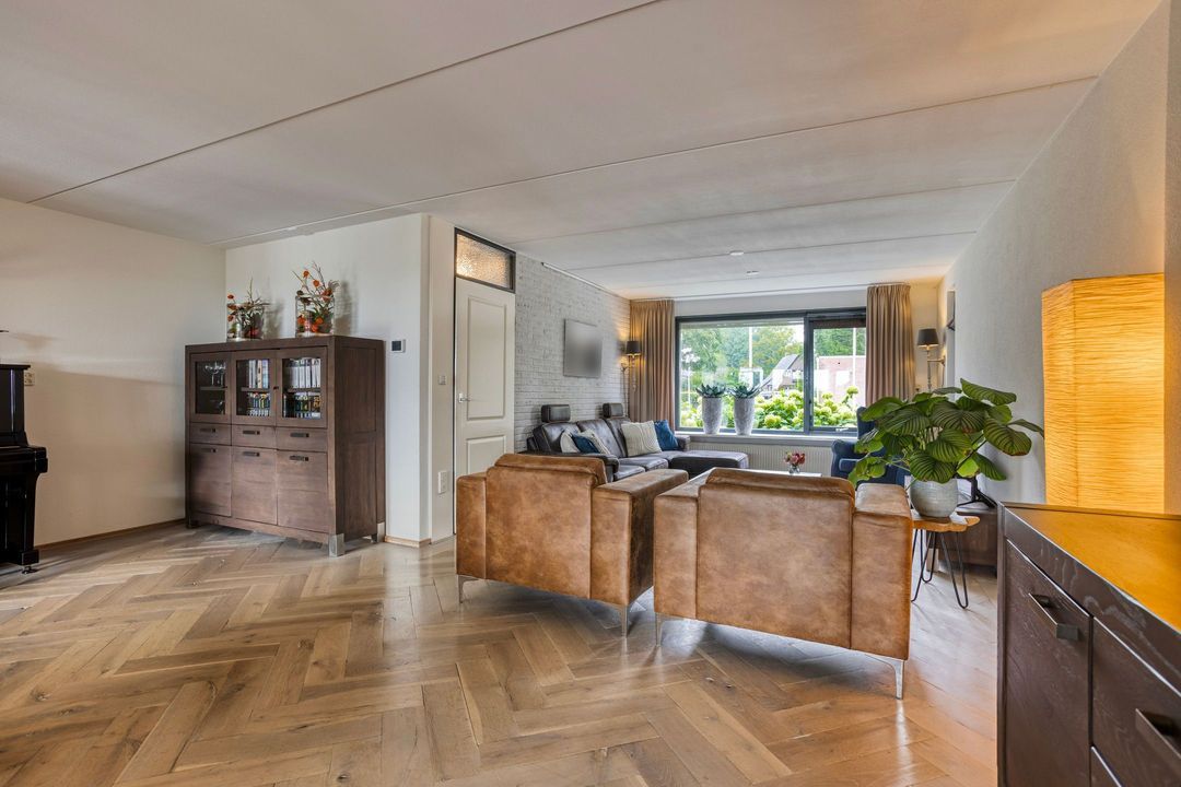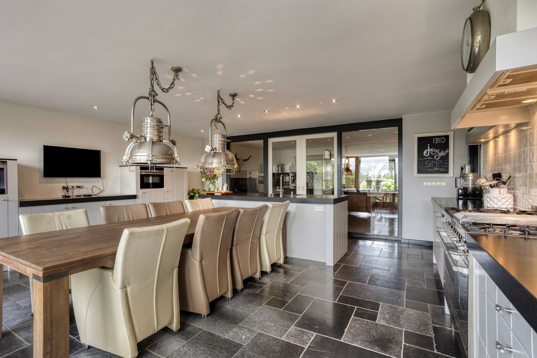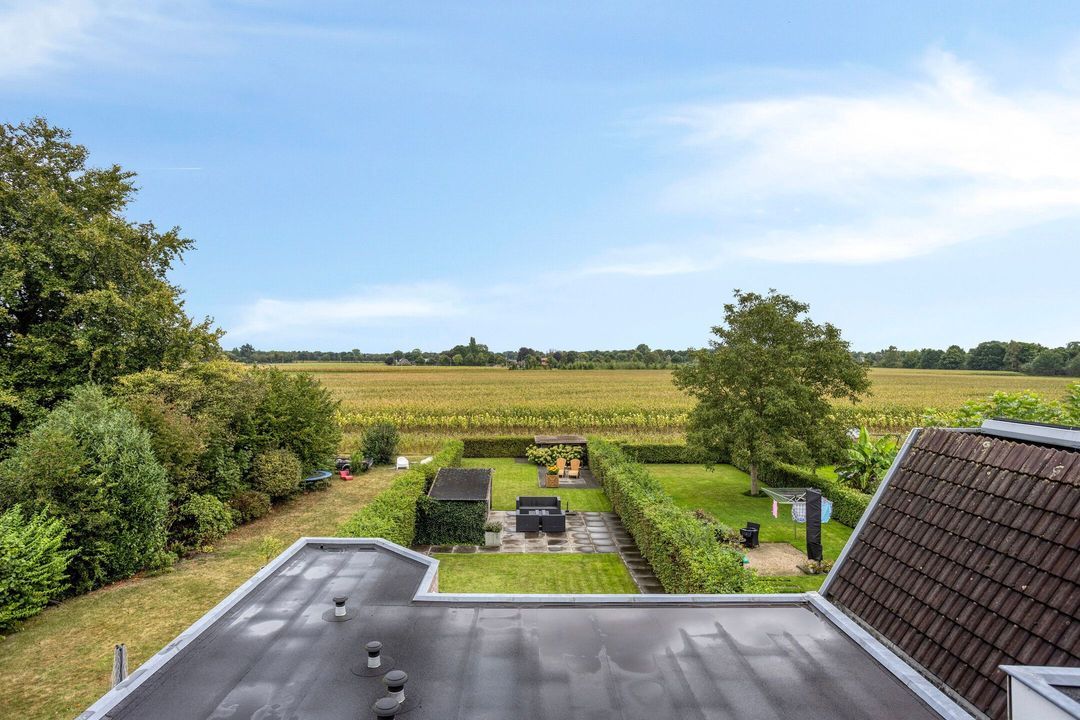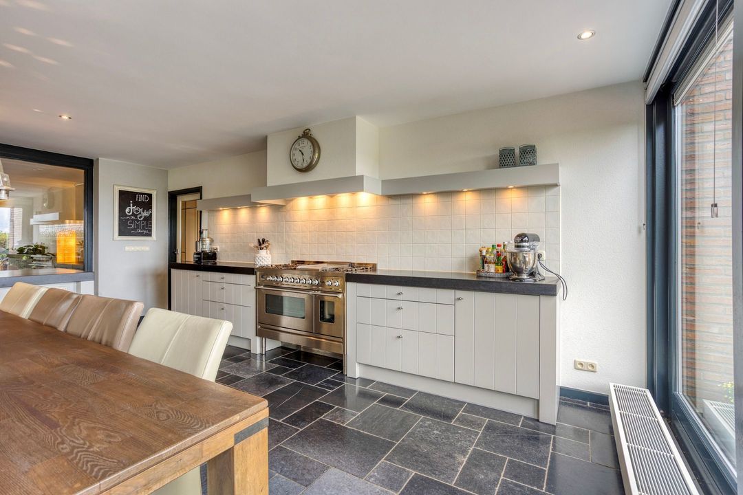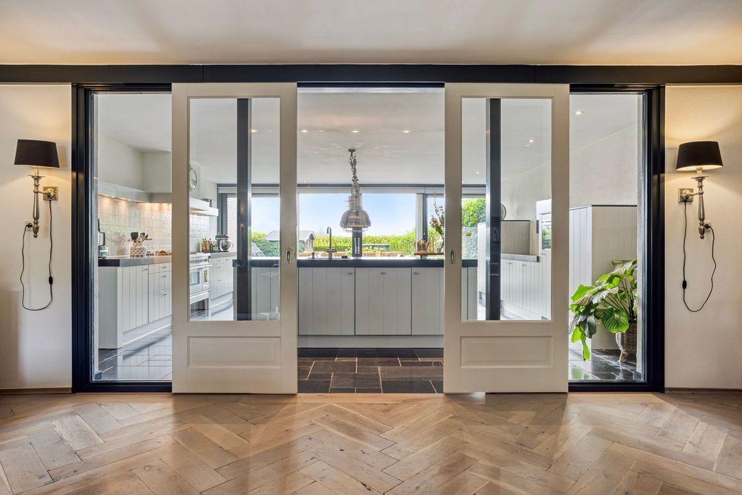 Op de begane grond treft u een ruime hal met toilet en meterkast. De royale L-vormige woonkamer is voorzien van een fraaie eiken visgraatvloer en biedt via schuifdeuren toegang tot de woonkeuken van circa 38 m². Deze luxe keuken is uitgerust met een moderne opstelling, hoogwaardige inbouwapparatuur – waaronder een Boretti gascomfort met dubbele oven – en een royaal spoeleiland. Vanuit de keuken geven schuifpuien toegang tot de diepe achtertuin met prachtig uitzicht over de weilanden. Aan de zijkant bevindt zich een praktische berging met aansluitingen voor wasapparatuur, een bijkeuken met extra keukenopstelling en aan de voorzijde een fietsenberging met vaste kastenwand. De gehele uitbouw is voorzien van vloerverwarming en een elektrisch uitvalscherm.