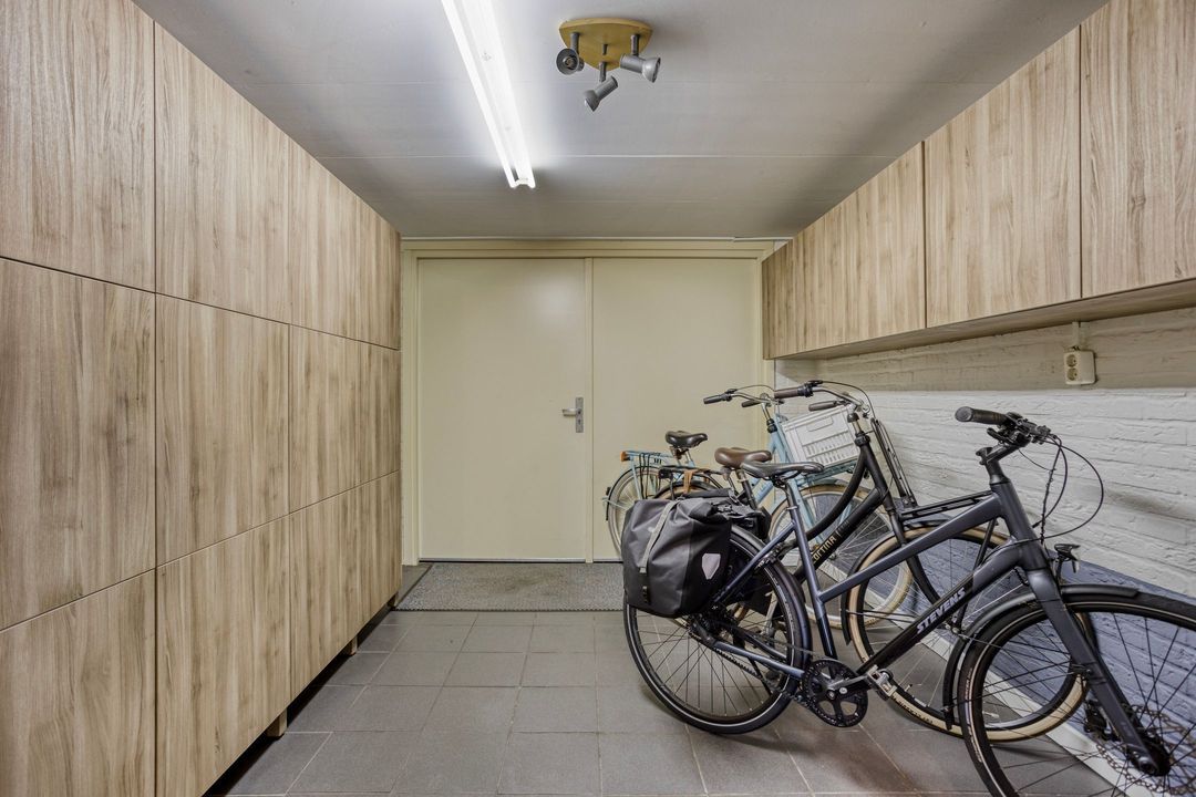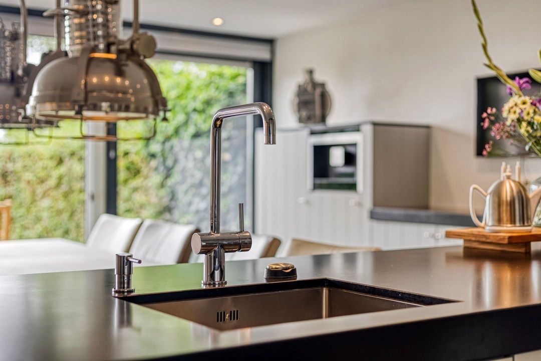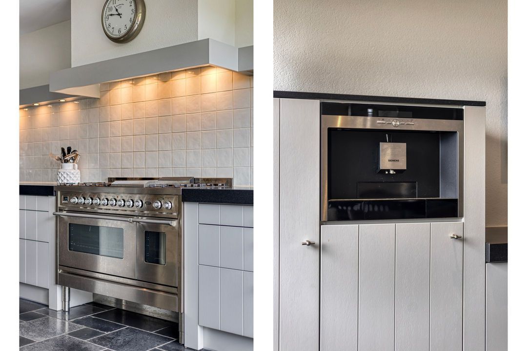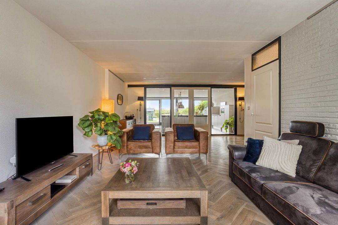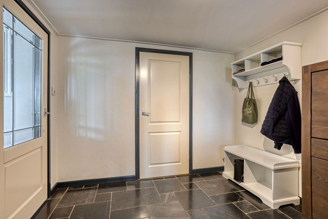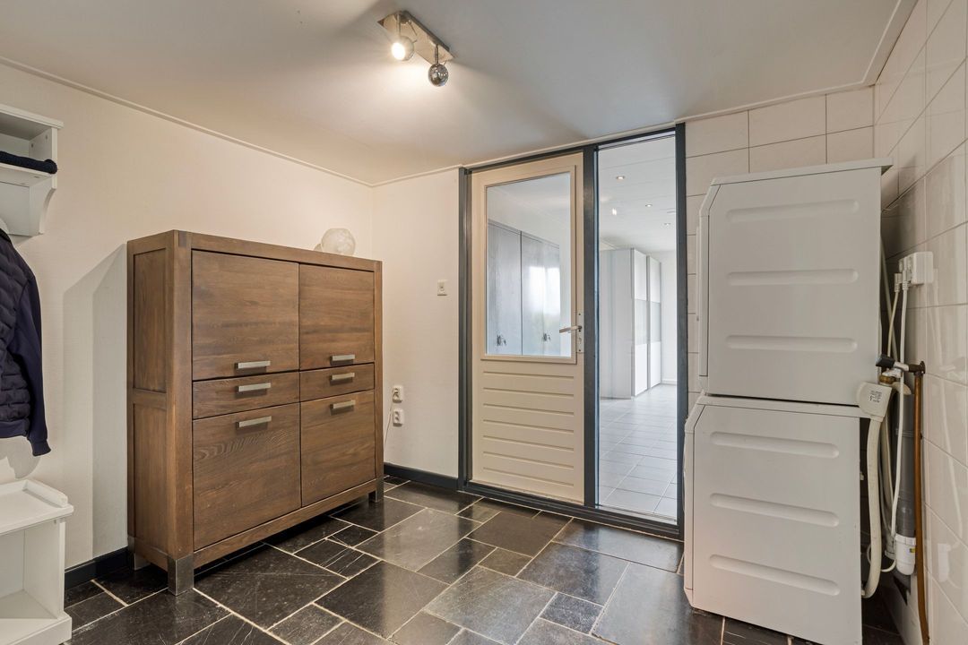 Op de begane grond treft u een ruime hal met toilet en meterkast. De royale L-vormige woonkamer is voorzien van een fraaie eiken visgraatvloer en biedt via schuifdeuren toegang tot de woonkeuken van circa 38 m². Deze luxe keuken is uitgerust met een moderne opstelling, hoogwaardige inbouwapparatuur – waaronder een Boretti gascomfort met dubbele oven – en een royaal spoeleiland. Vanuit de keuken geven schuifpuien toegang tot de diepe achtertuin met prachtig uitzicht over de weilanden. Aan de zijkant bevindt zich een praktische berging met aansluitingen voor wasapparatuur, een bijkeuken met extra keukenopstelling en aan de voorzijde een fietsenberging met vaste kastenwand. De gehele uitbouw is voorzien van vloerverwarming en een elektrisch uitvalscherm.
