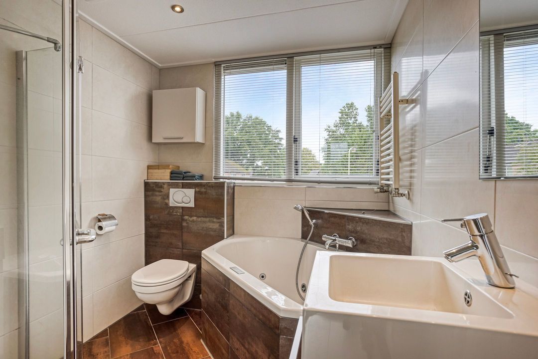 Op de eerste verdieping zijn drie ruime slaapkamers, waarvan de grootste met inbouwkasten, en een complete badkamer met inloopdouche, wastafelmeubel, toilet en ligbad.