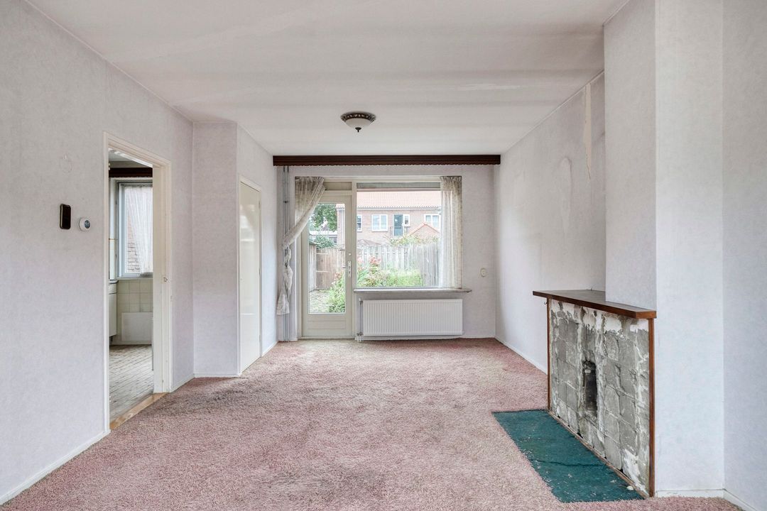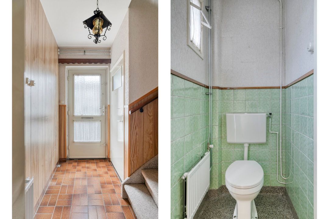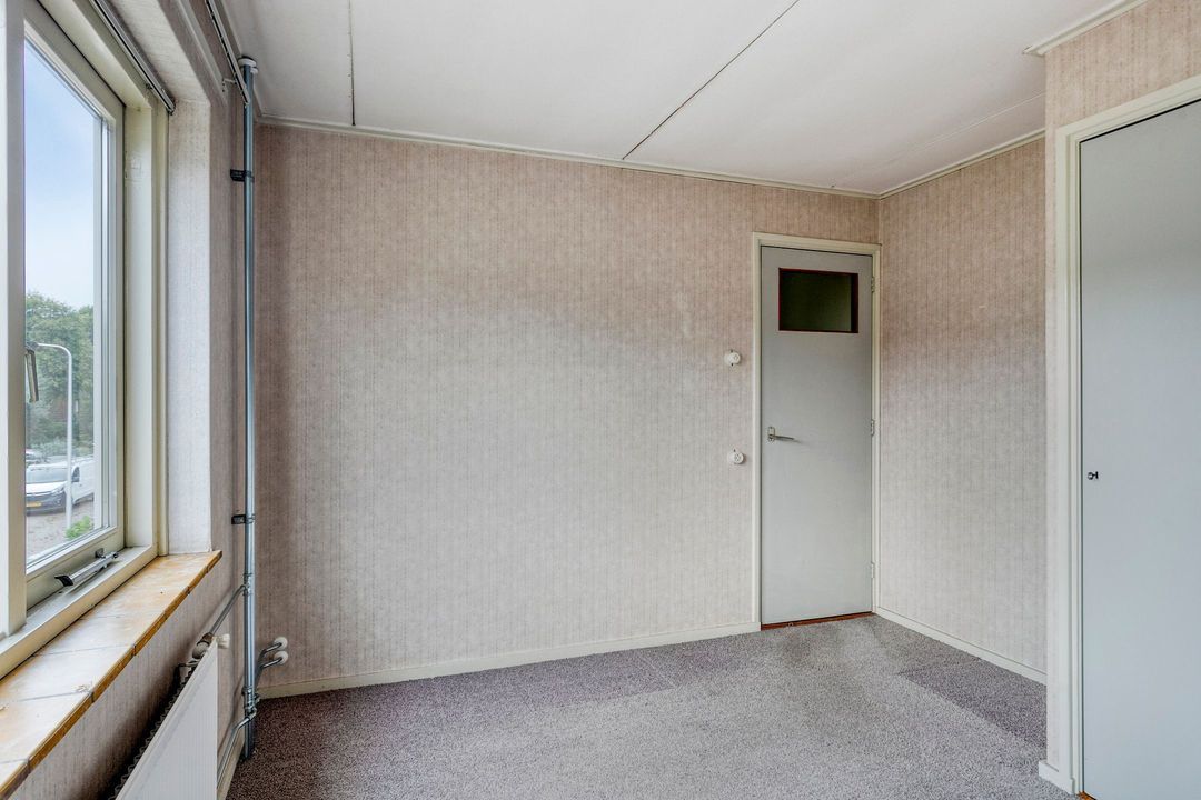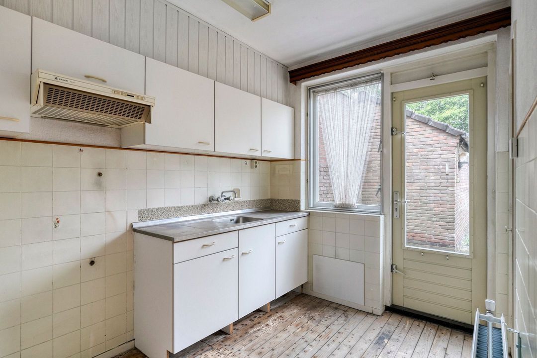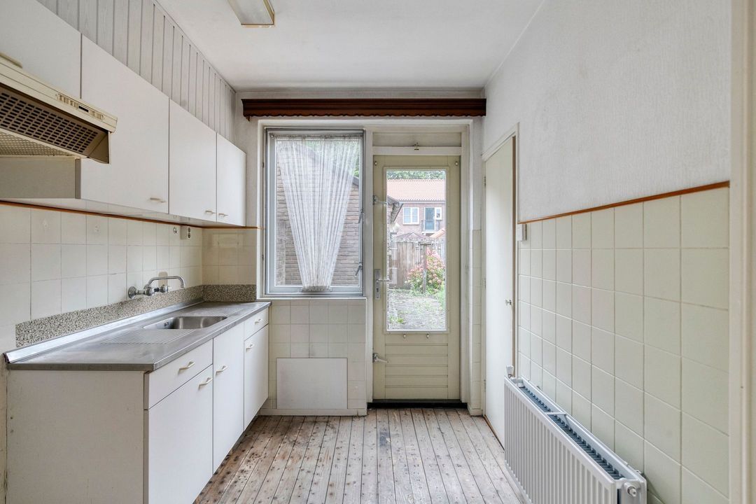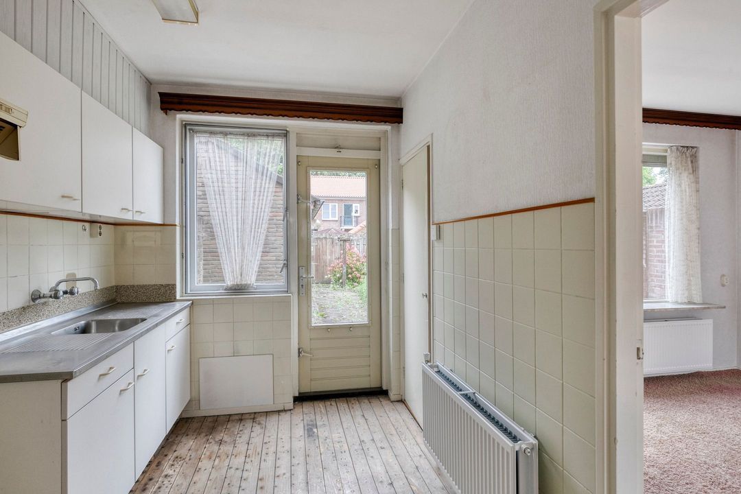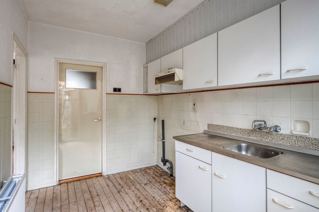 Entree, hal met trapopgang, toilet, trapkast en meterkast. Doorzon woonkamer en een dichte keuken voorzien van eenvoudig keukenblok zonder apparatuur. Deur naar achtertuin.