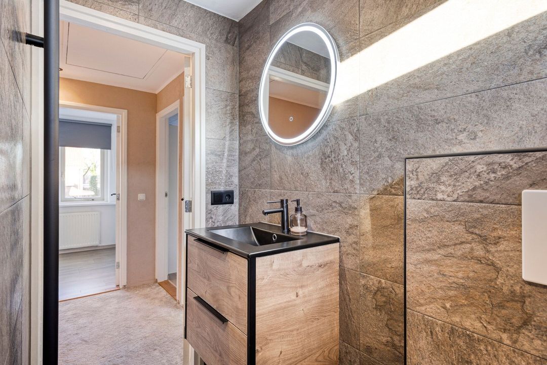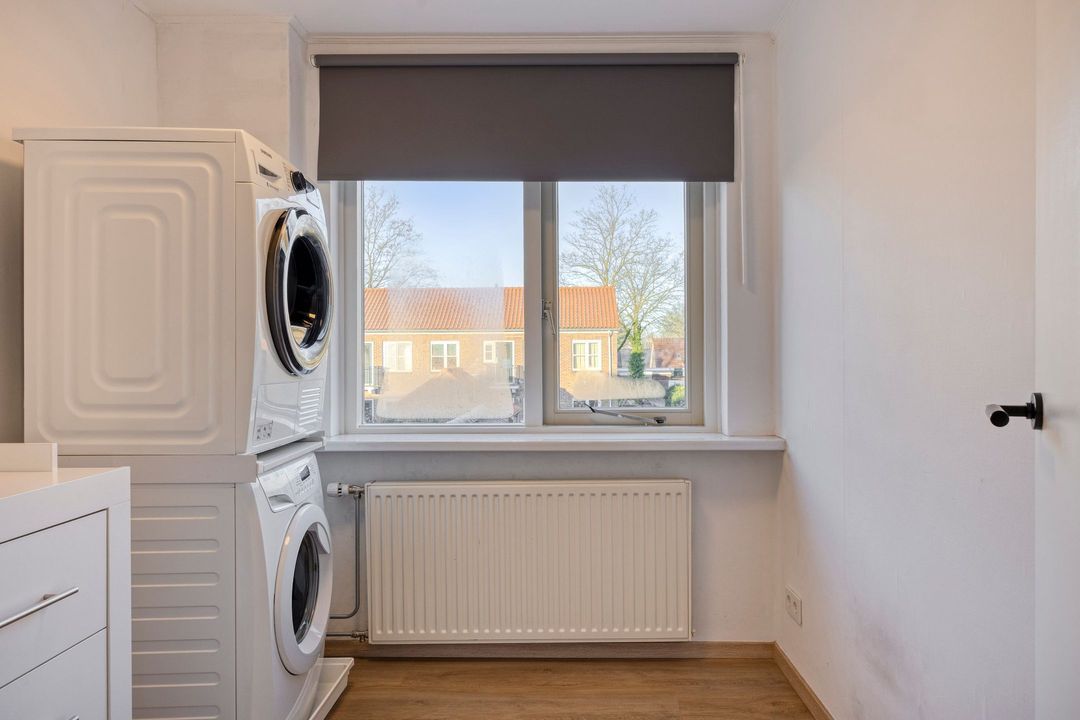 De eerste verdieping beschikt over drie slaapkamers, waarvan één in gebruik is als wasruimte. Een moderne badkamer met douche, wastafelmeubel, toilet en heeft de overloop een praktische bergkast. Ideaal!