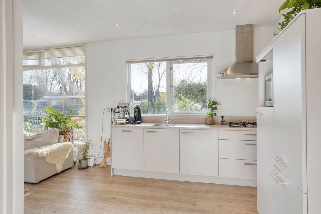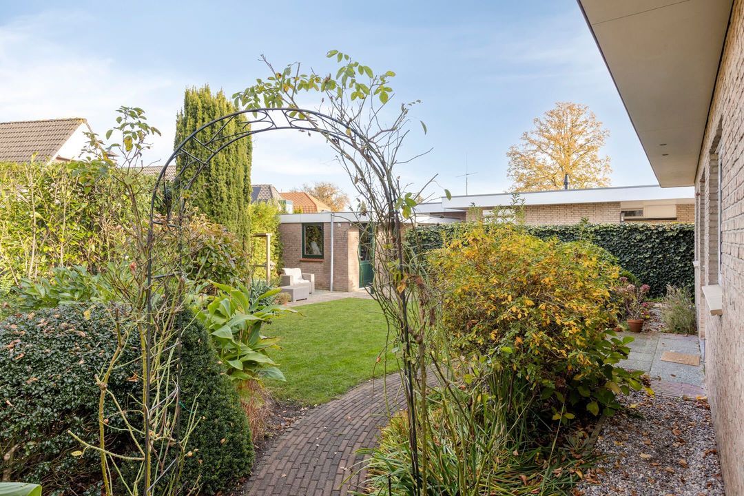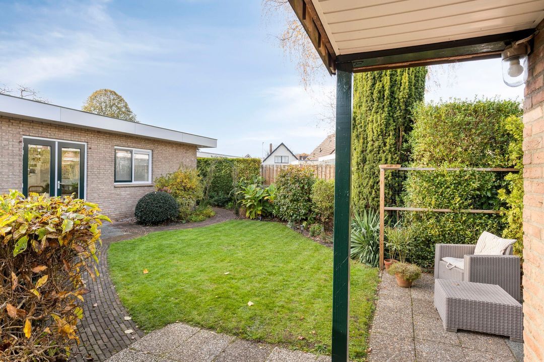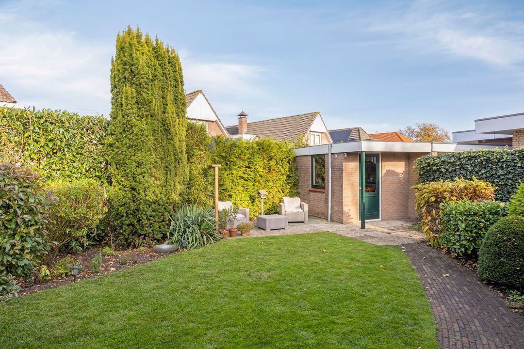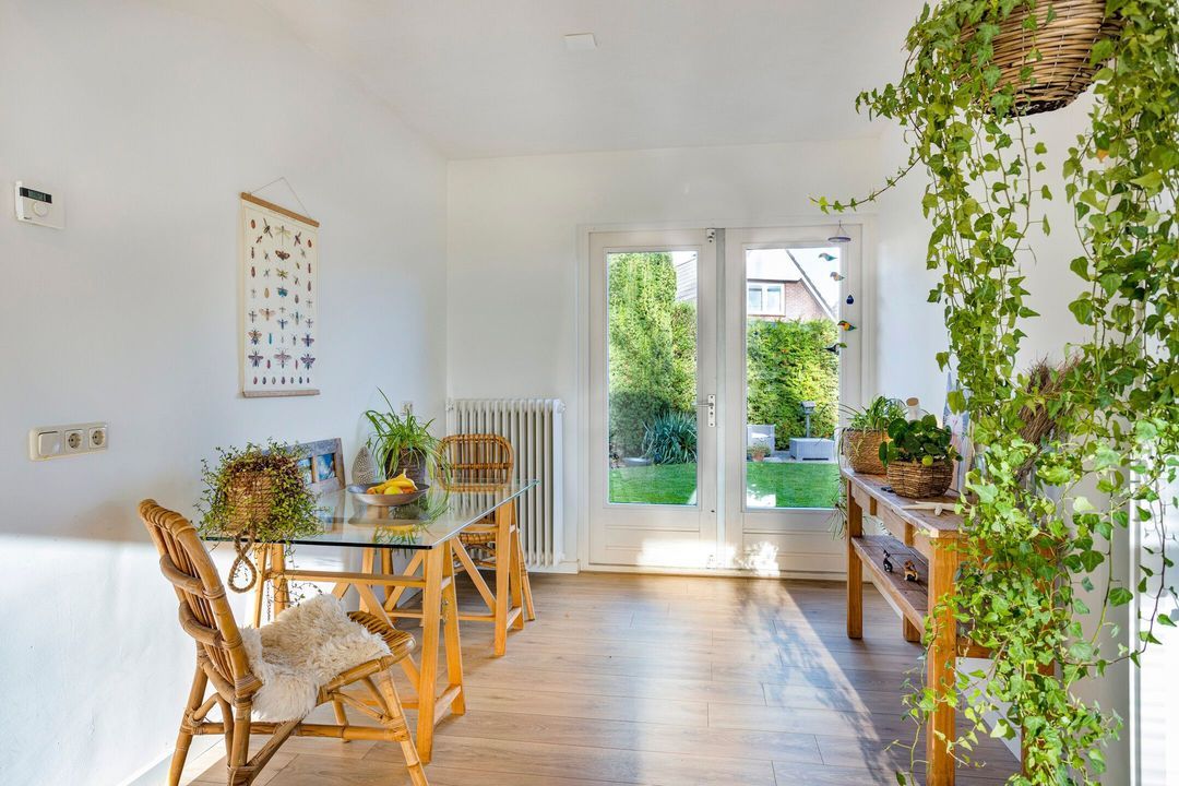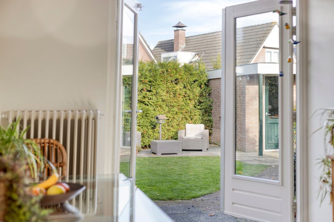 Vanuit zowel de woonkamer als de keuken kunt u genieten van het prachtige uitzicht op de tuin. Deze groene oase is voorzien van meerdere terrassen en een verscheidenheid aan vaste planten, zodat u in alle rust kunt ontspannen en van de buitenlucht kunt genieten.