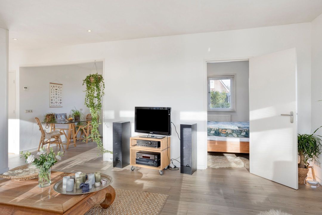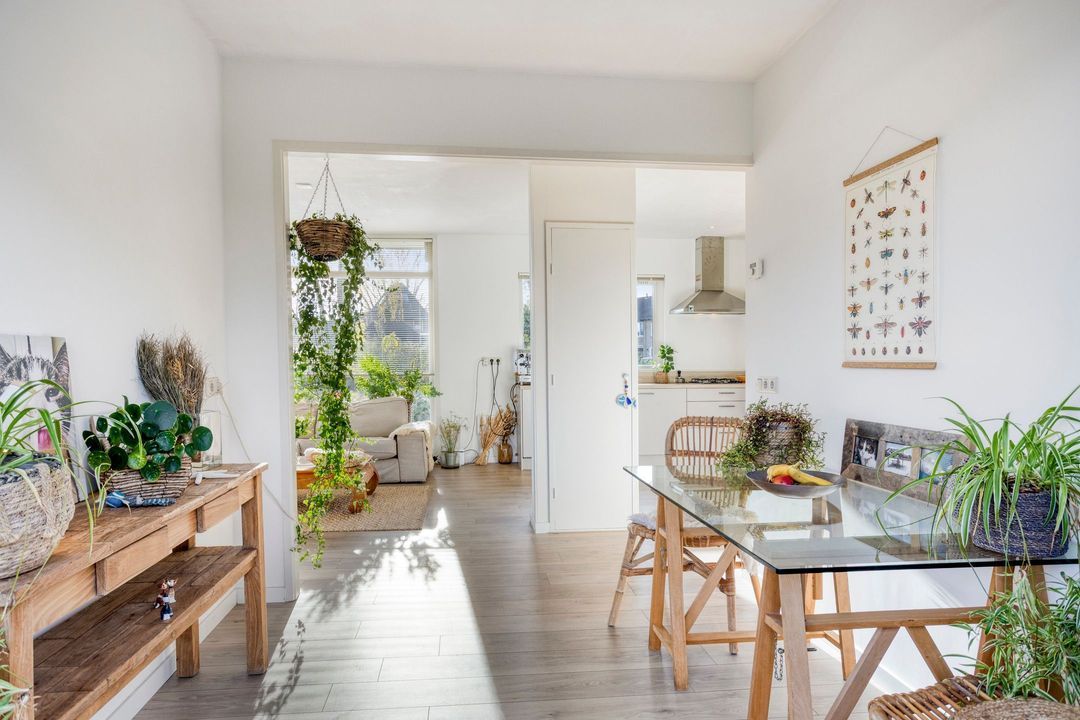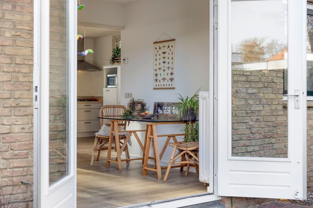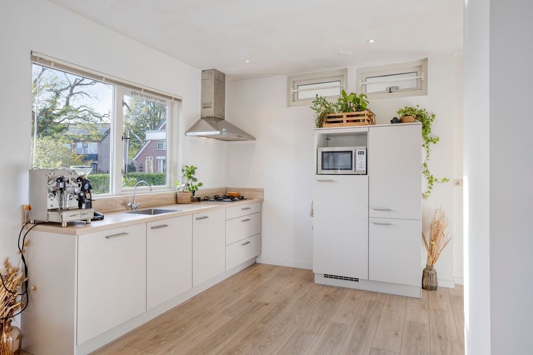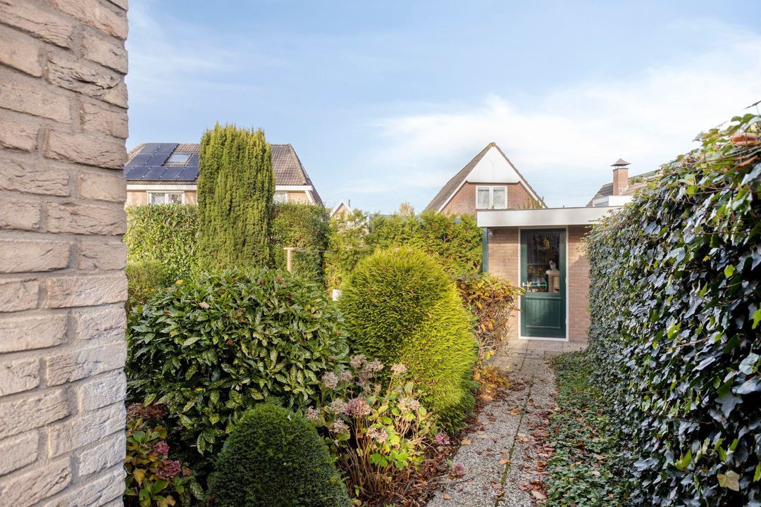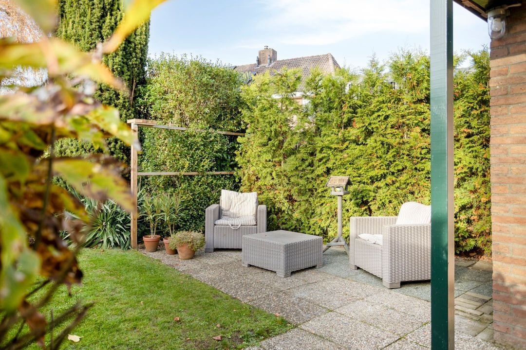 Vanuit zowel de woonkamer als de keuken kunt u genieten van het prachtige uitzicht op de tuin. Deze groene oase is voorzien van meerdere terrassen en een verscheidenheid aan vaste planten, zodat u in alle rust kunt ontspannen en van de buitenlucht kunt genieten.