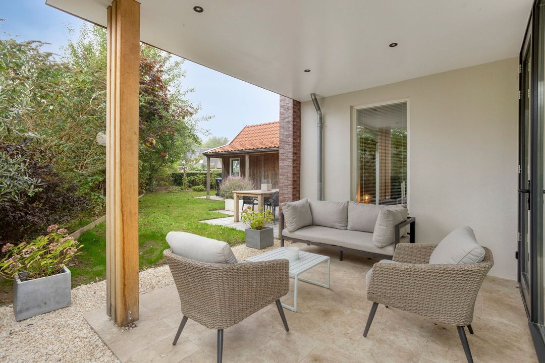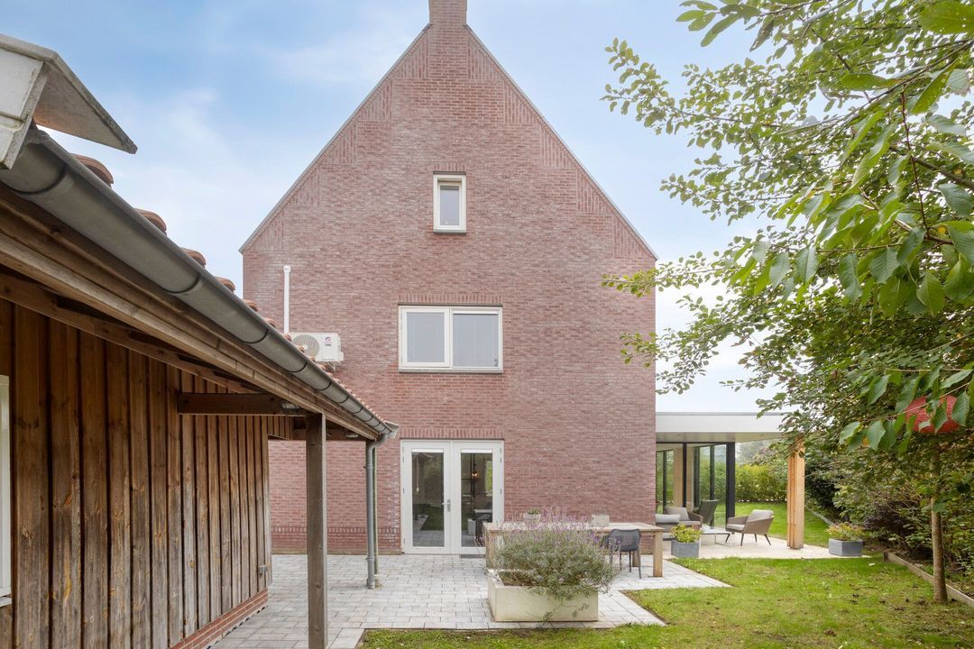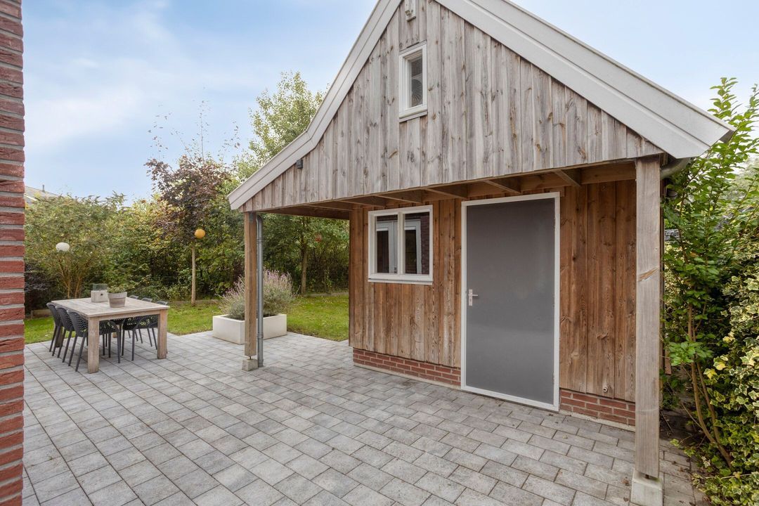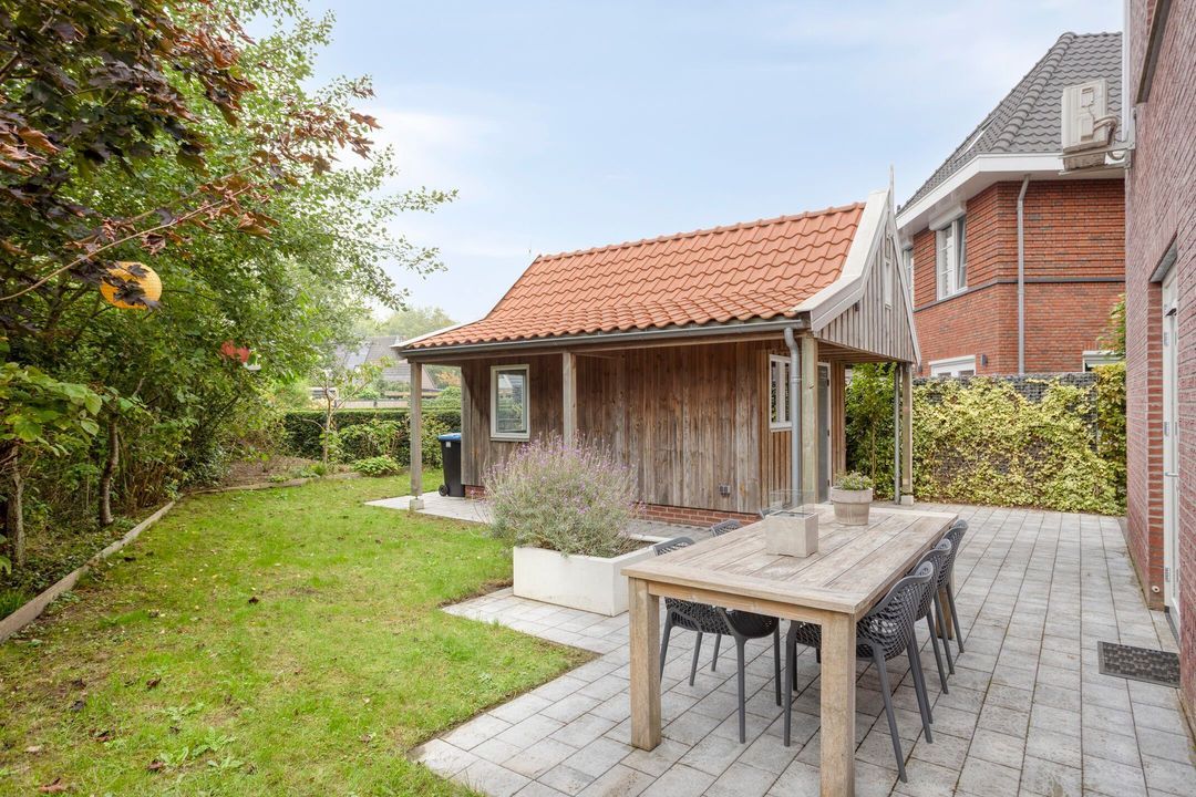 Achter de woning staat een houten berging van circa 18 m² met zoldertje en een overdekt terras. Aan de zijkant van de woning bevindt zich een sfeervolle veranda met zicht op de tuin en de groenstrook. De tuin zelf is gesitueerd op het zuidwesten, grenst aan de Klaarbeek en biedt veel privacy.