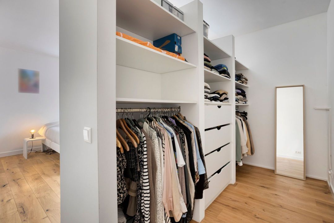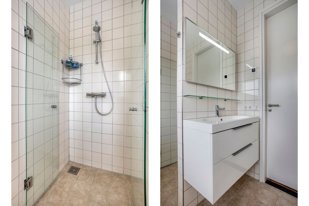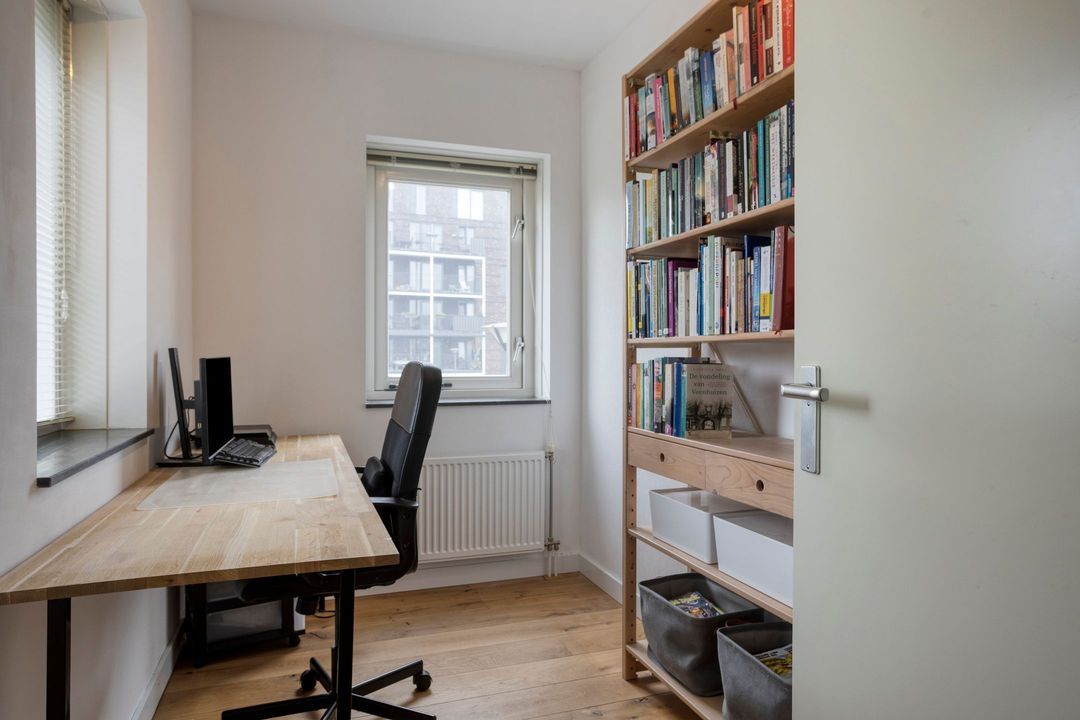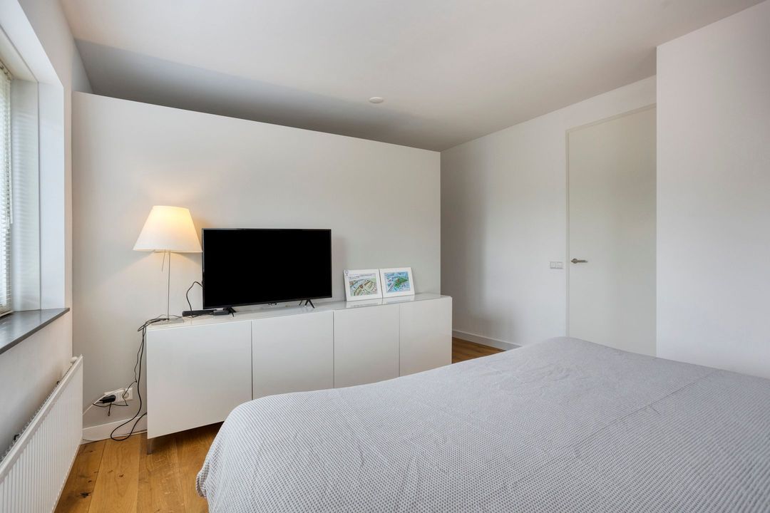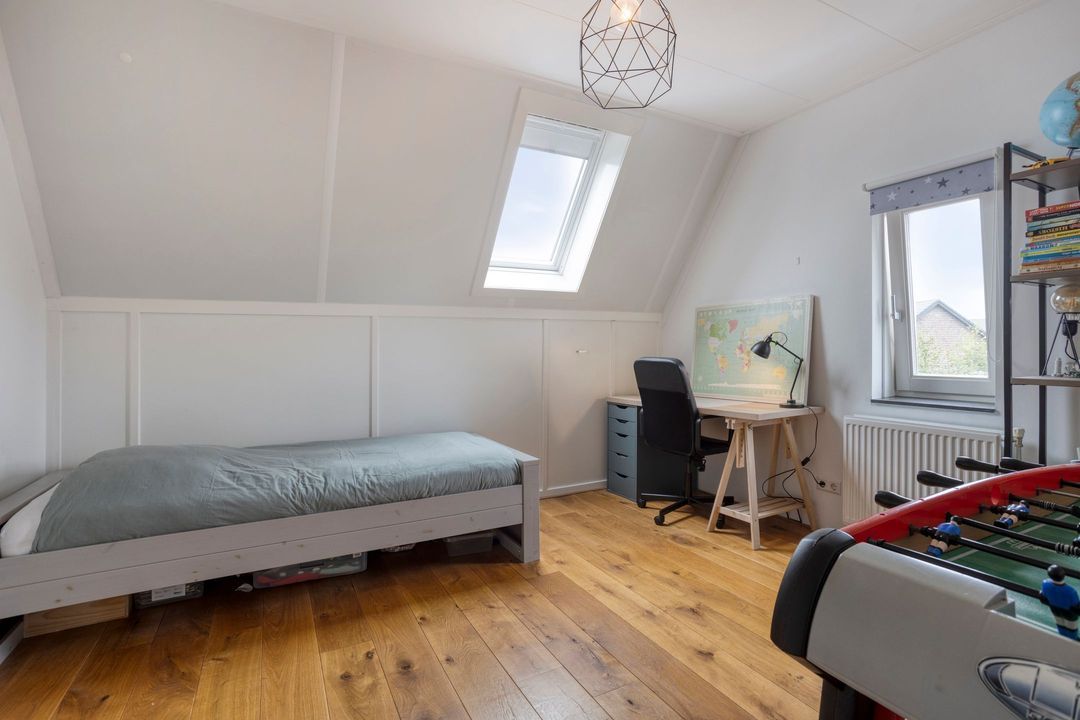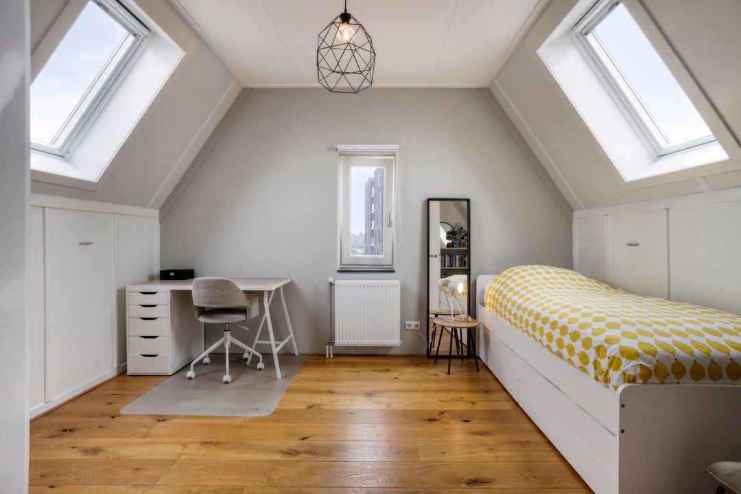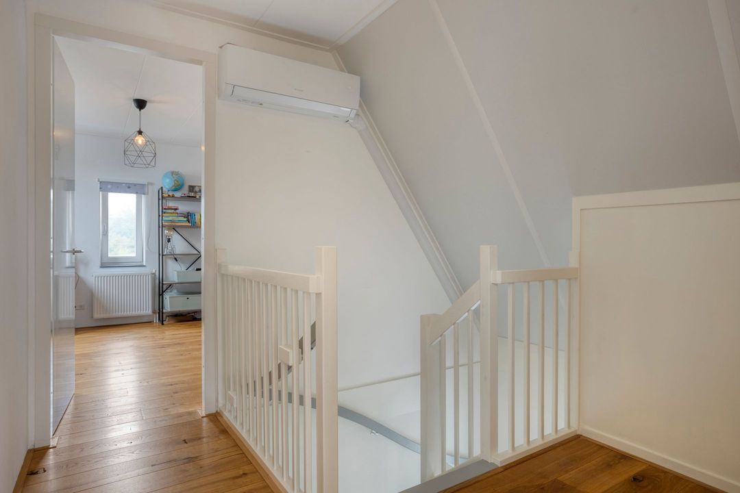 De tweede verdieping biedt een overloop, twee ruime slaapkamers en een royale berging met de opstelling van de CV-ketel en airco. Ook deze verdieping is voorzien van een fraaie eiken vloer.
