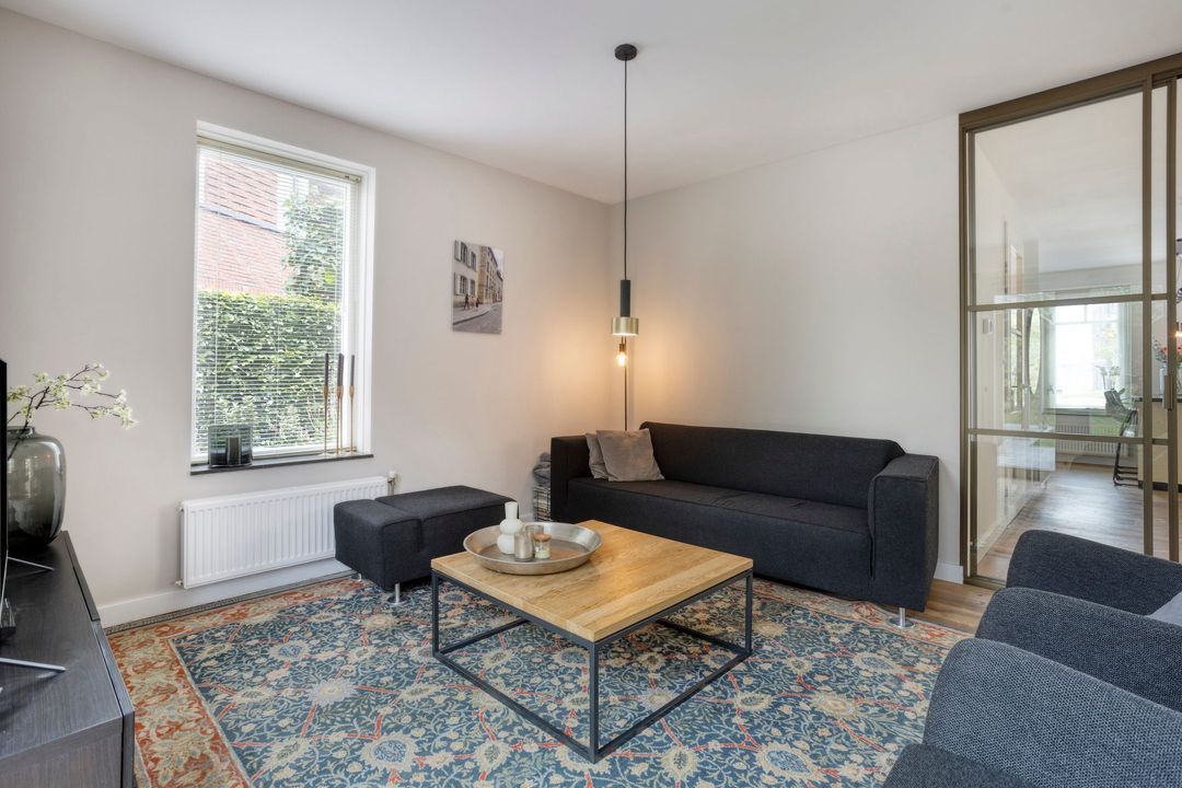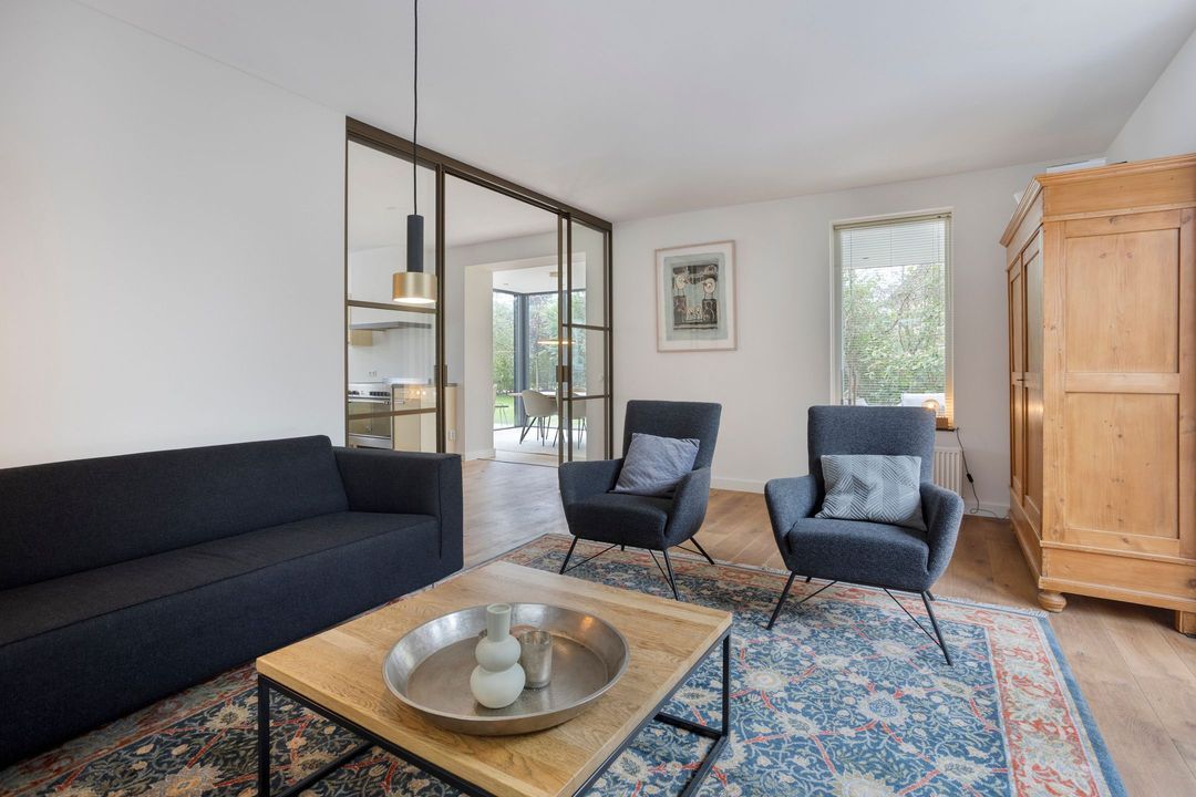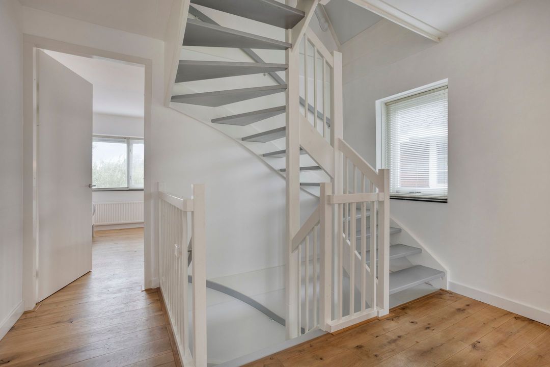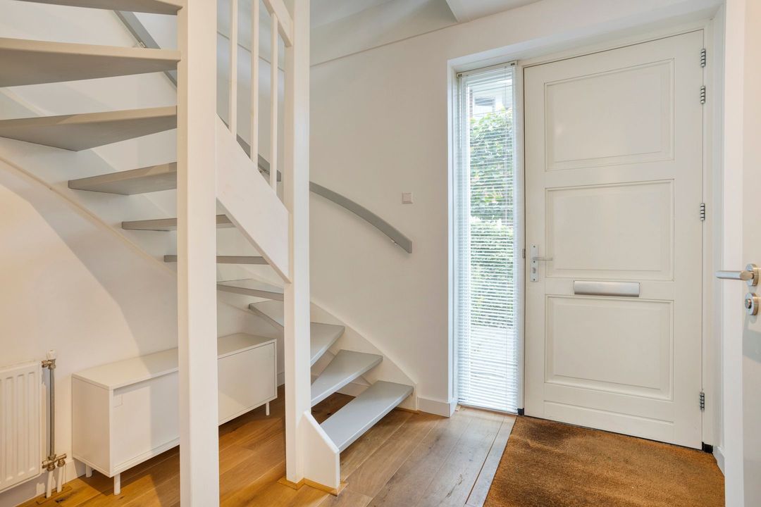 Entree, hal, toilet en een fraai trappenhuis met een zogenaamde “luie trap”. De sfeervolle, lichte L-vormige woonkamer is voorzien van een eiken vloer en een aluminium schuifpui. Er is een open verbinding met de prachtige tuinkamer die uitzicht biedt op de tuin. Aan de achterzijde geven openslaande deuren toegang tot het terras.