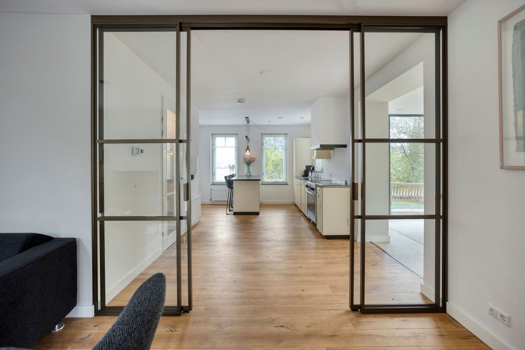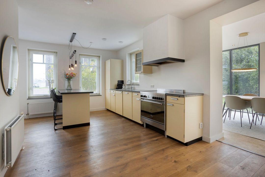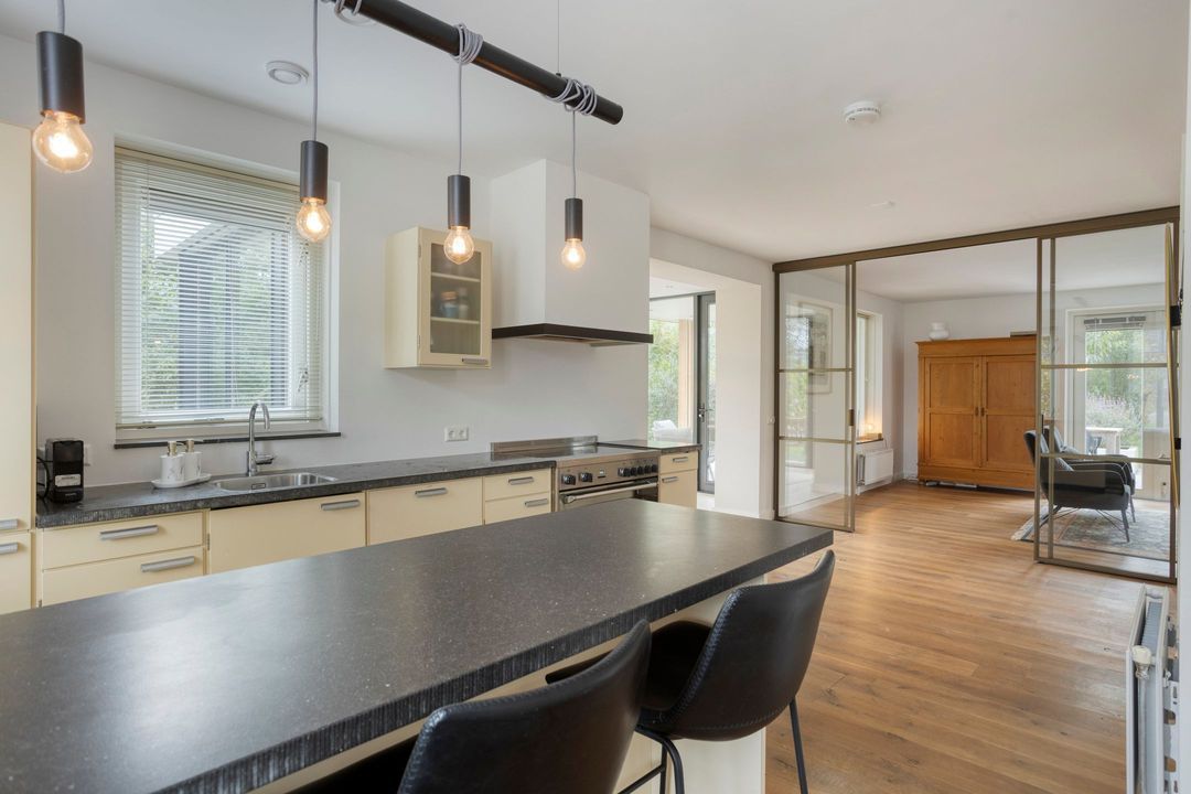 De open keuken is een echte originele Piet Zwart retro keuken, compleet met diverse inbouwapparatuur zoals een gascomfort, afzuigkap, oven, vaatwasser en koel-/vriescombinatie. Het geheel wordt gecompleteerd door een stijlvol eiland waar u gezellig aan kunt zitten. Aansluitend bevindt zich de praktische bijkeuken met aansluitingen voor wasapparatuur en kastruimte.