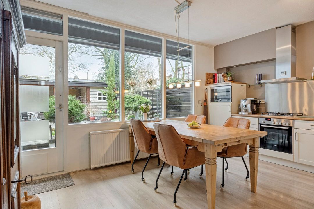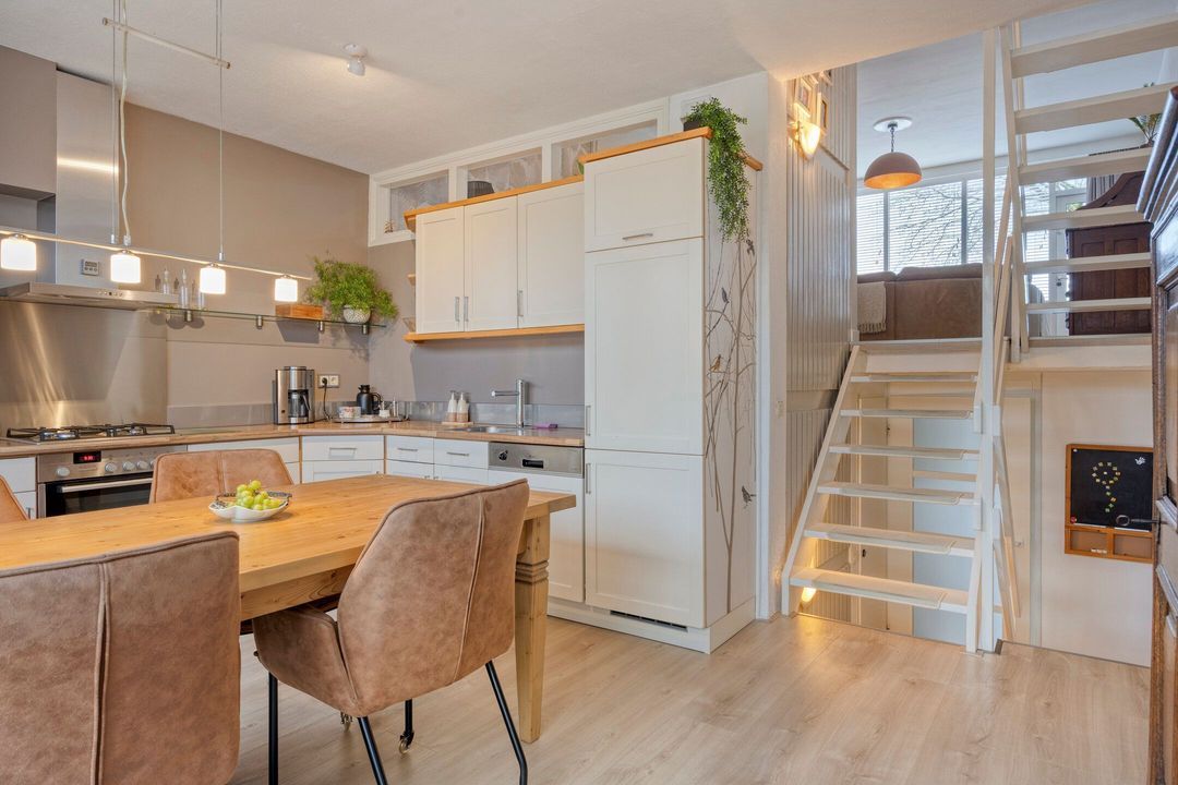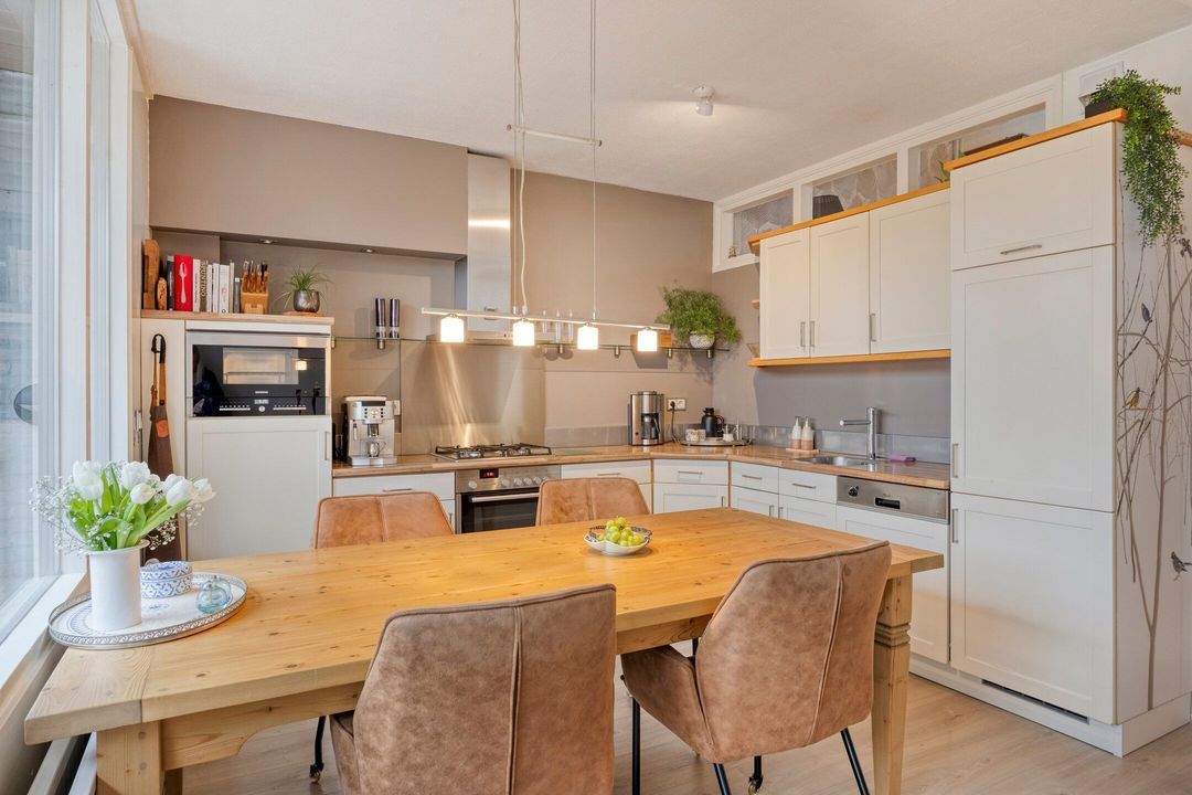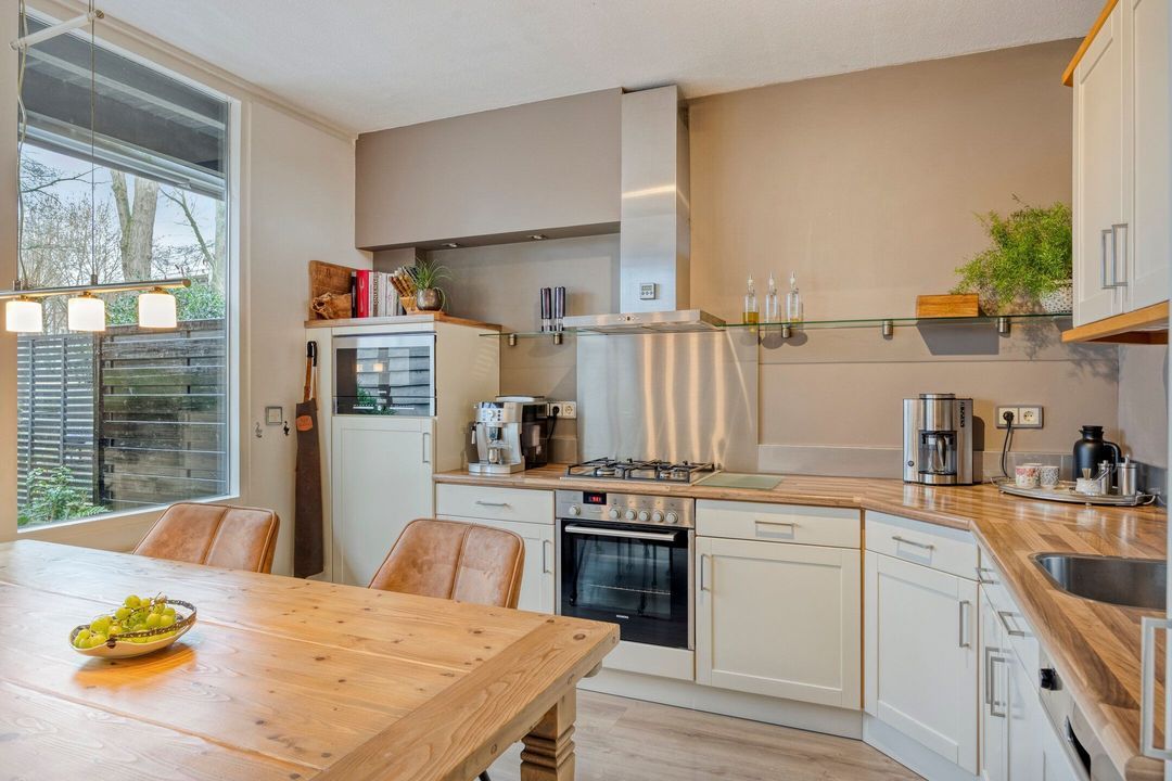De tuingerichte woonkeuken is modern ingericht met een hoekopstelling en diverse inbouwapparatuur, waaronder een combimagnetron, koelkast, vaatwasser, kookplaat en afzuigkap. Vanuit de keuken heeft u direct toegang tot de zonnige achtertuin op het westen.