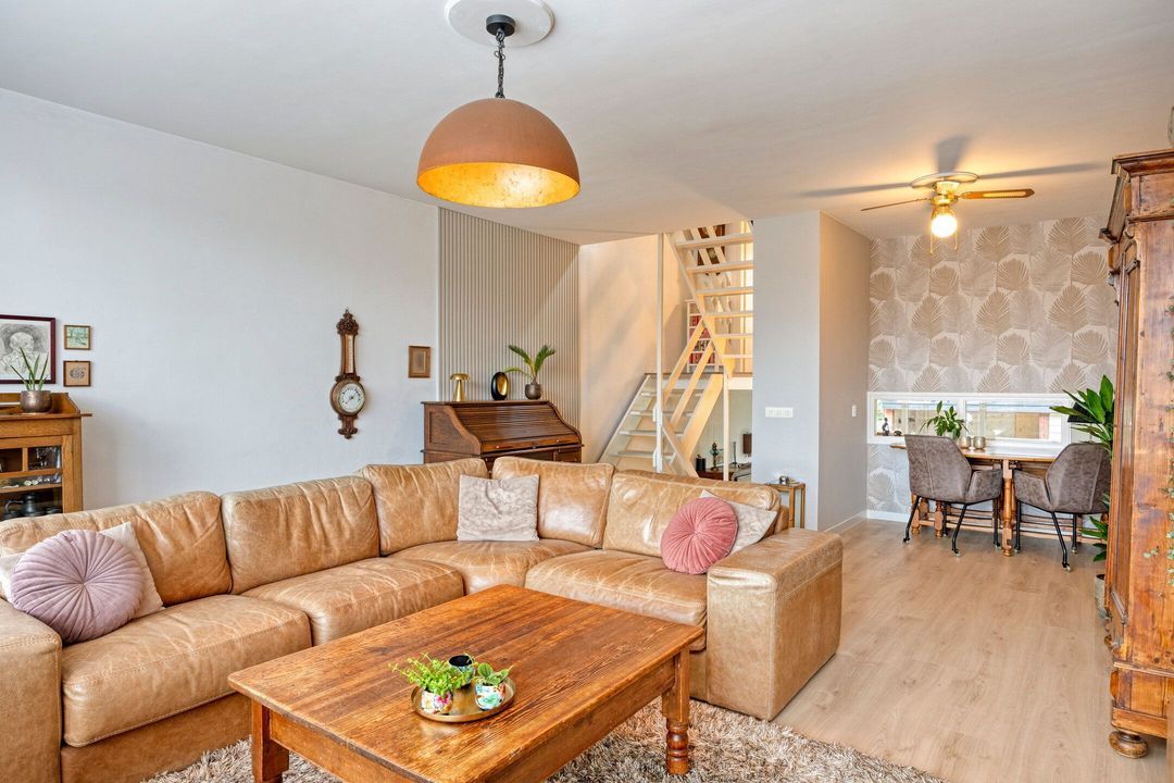 Sfeervolle en ruime woonkamer met een fijne werkplek en toegang tot het balkon aan de voorzijde.