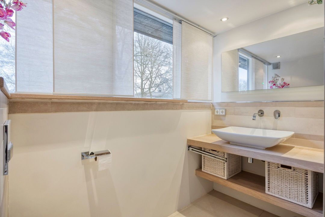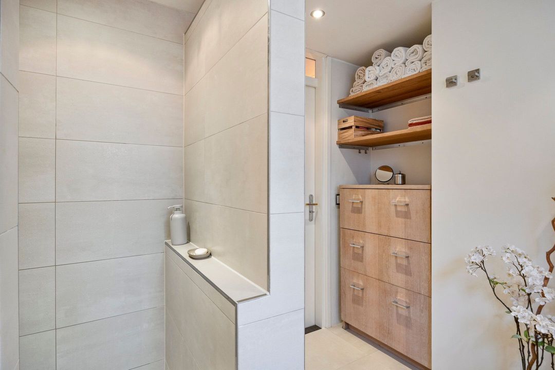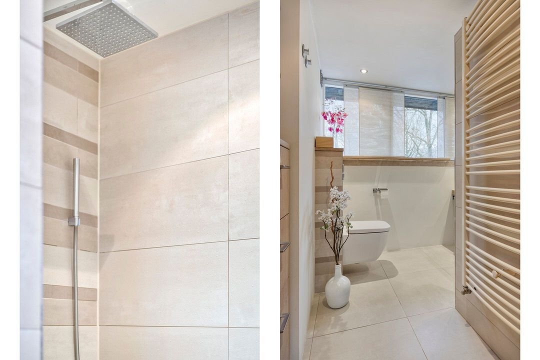 Overloop met inbouwkasten. Royale slaapkamer (voorheen twee kamers, eenvoudig weer te splitsen). De moderne badkamer is compleet uitgevoerd met een inloopdouche, wastafelmeubel, tweede toilet en vloerverwarming.