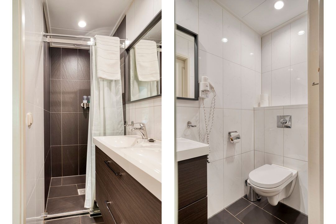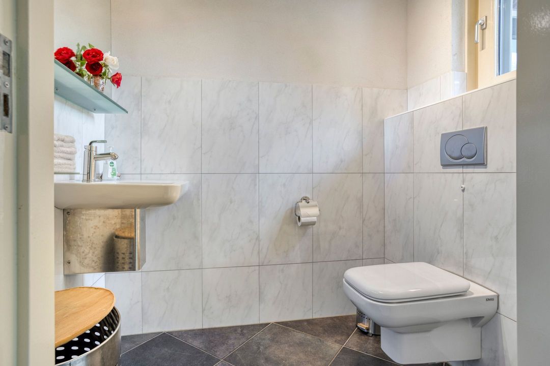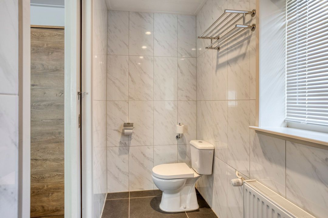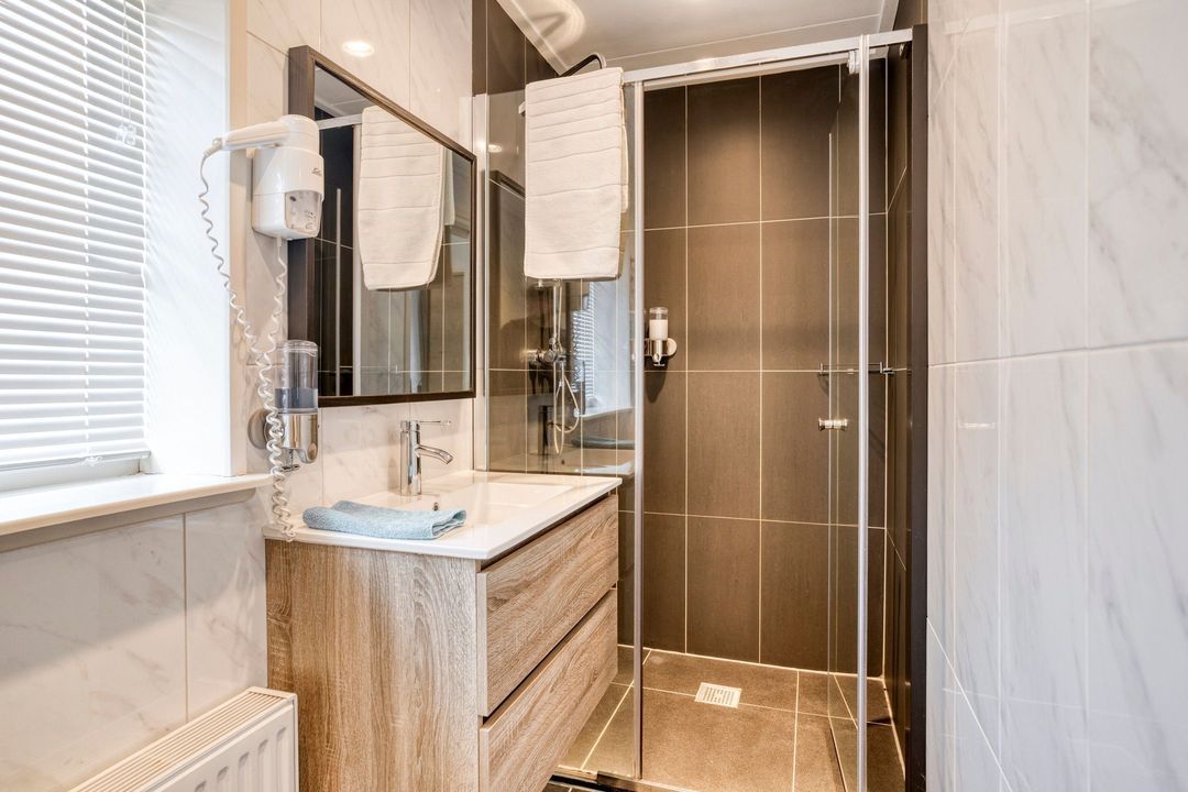 Vanuit de hal bereikt u de verdieping. Deze verdieping biedt twee royale slaapkamers, beide met een eigen badkamer ensuite. Naast de bijkeuken beneden bevindt zich ook een tweede trapopgang met een eigen overloop met een slaapkamer en separaat toiletruimte met wastafel. Aan de andere zijde zit de technische ruimte.