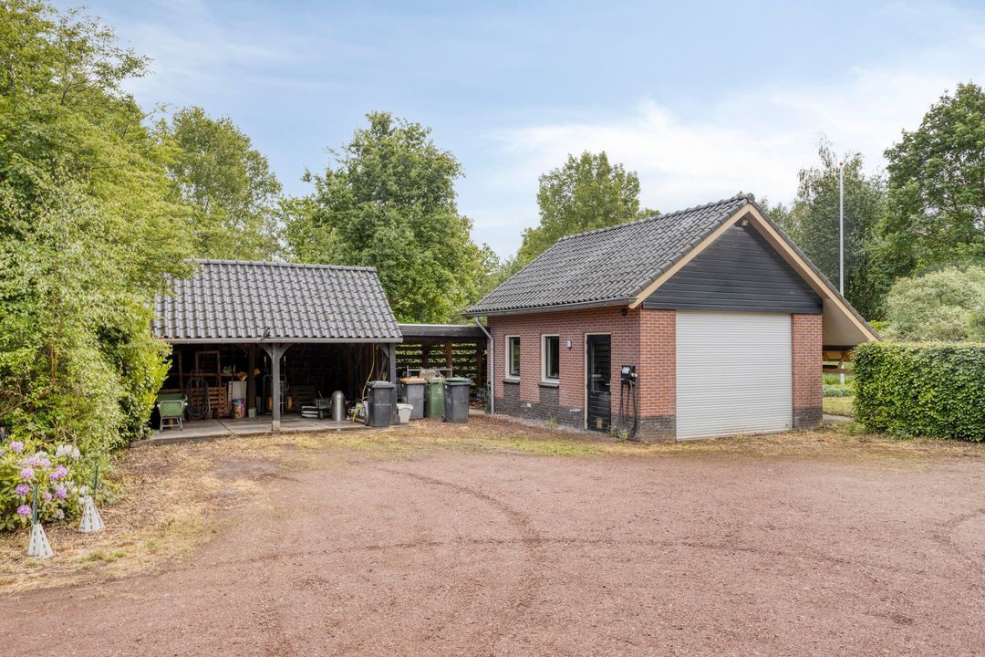 Op het binnenterrein bevindt zich een grote garage met elektrische deur, geheel voorzien van isolatie, dubbel glas en vloerverwarming. Ideaal voor het opbergen van tuinspullen, fietsen en andere benodigdheden. Daarnaast biedt een royale kapschuur parkeerruimte voor twee auto’s en extra opslagmogelijkheden.