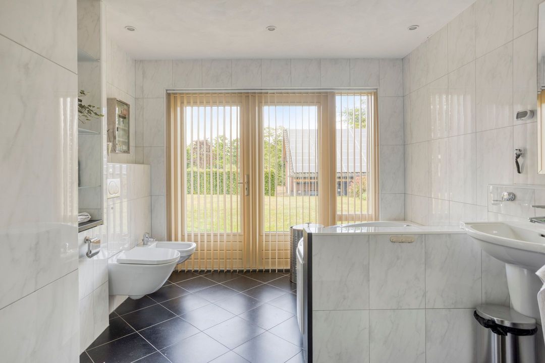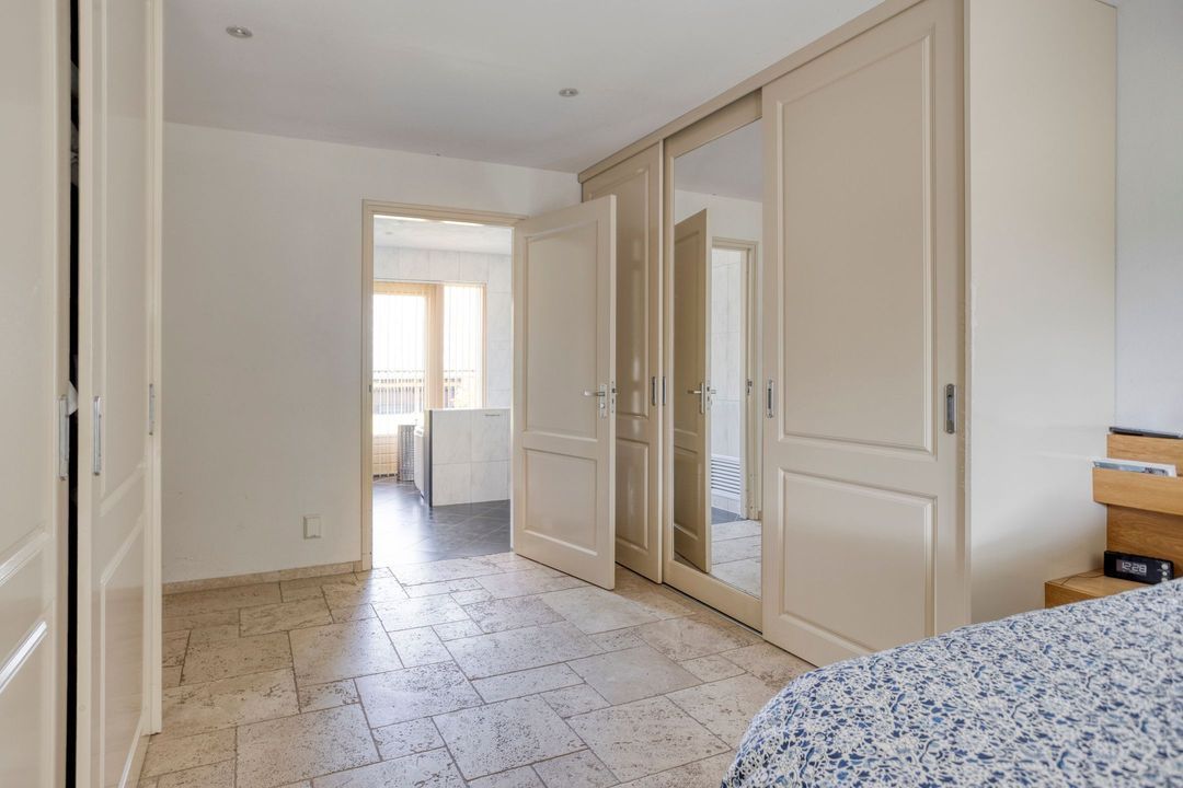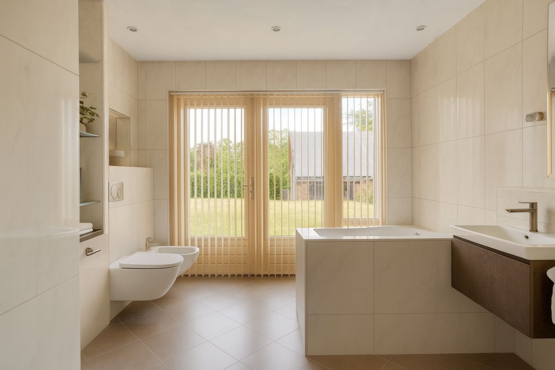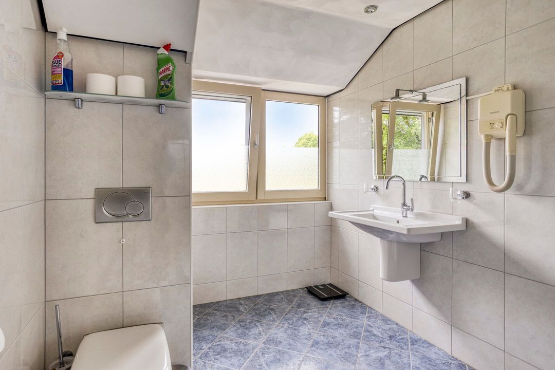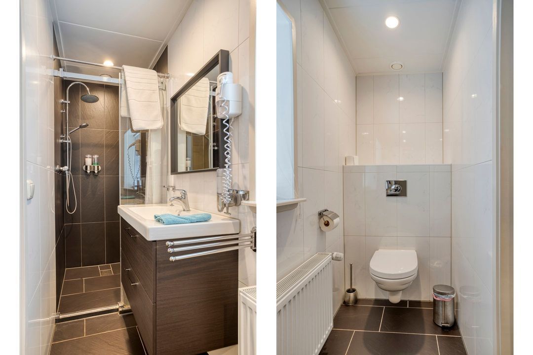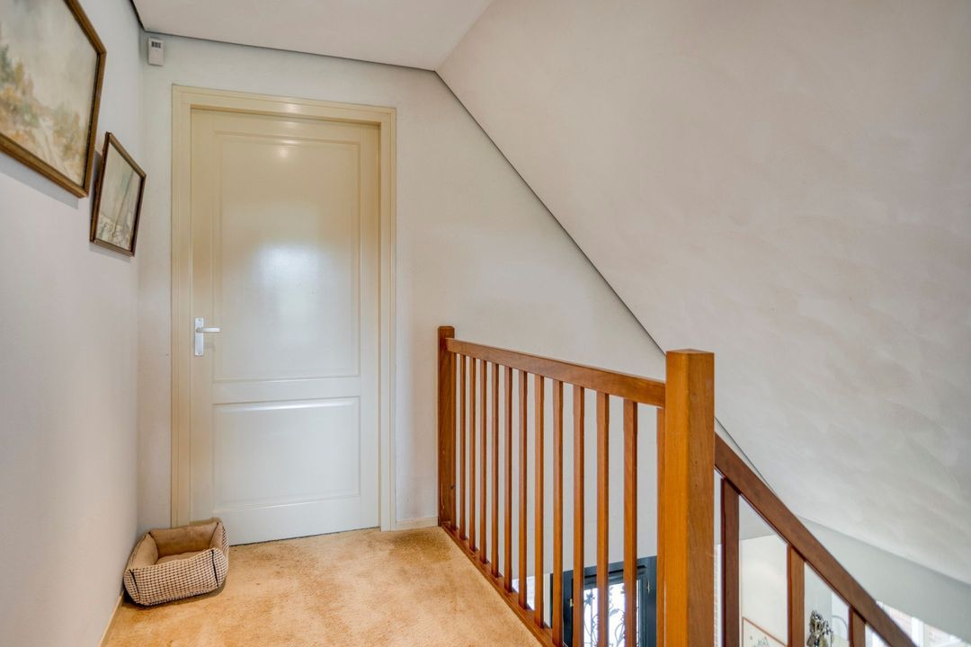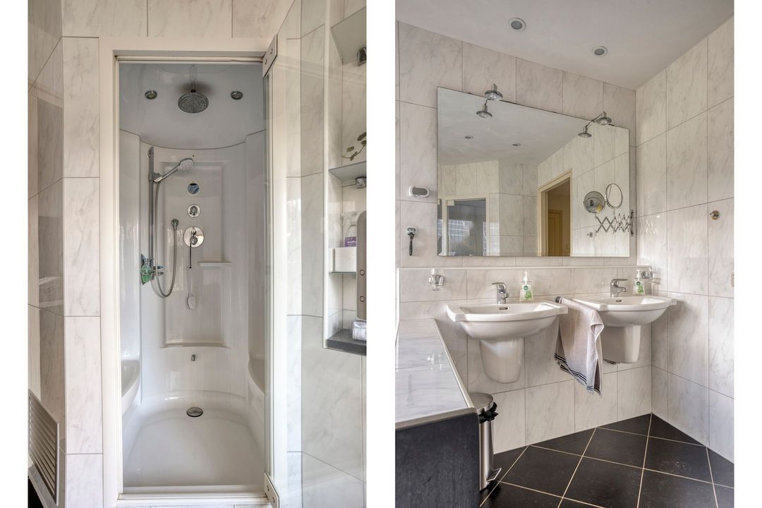 Vanuit de hal bereikt u de verdieping. Deze verdieping biedt twee royale slaapkamers, beide met een eigen badkamer ensuite. Naast de bijkeuken beneden bevindt zich ook een tweede trapopgang met een eigen overloop met een slaapkamer en separaat toiletruimte met wastafel. Aan de andere zijde zit de technische ruimte.