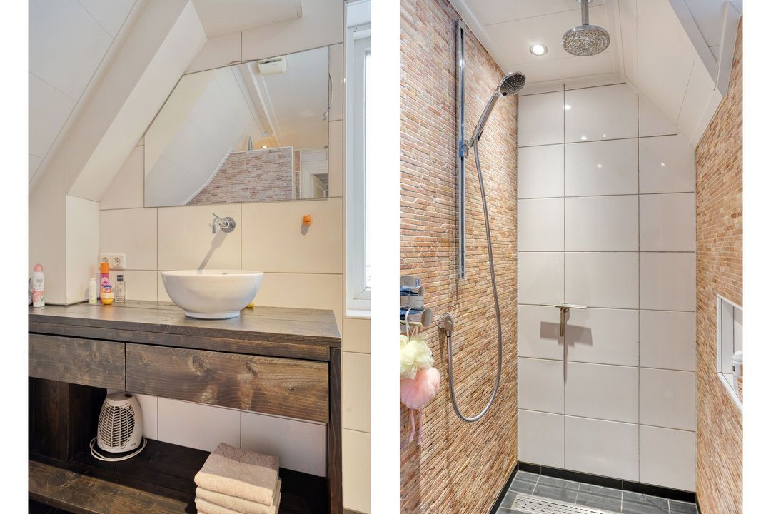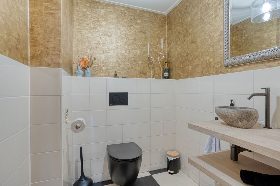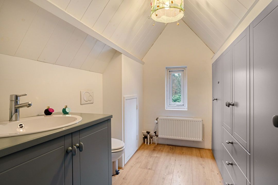De eerste verdieping telt drie slaapkamers en twee moderne badkamers. De mastersuite beschikt over een inloopkast, dakterras, bergzolder en een royale badkamer met dubbele wastafel, inloopdouche en toilet. De overige slaapkamers zijn eveneens ruim en licht, en delen een tweede moderne badkamer met toilet, wastafel en separate inloopdouche.