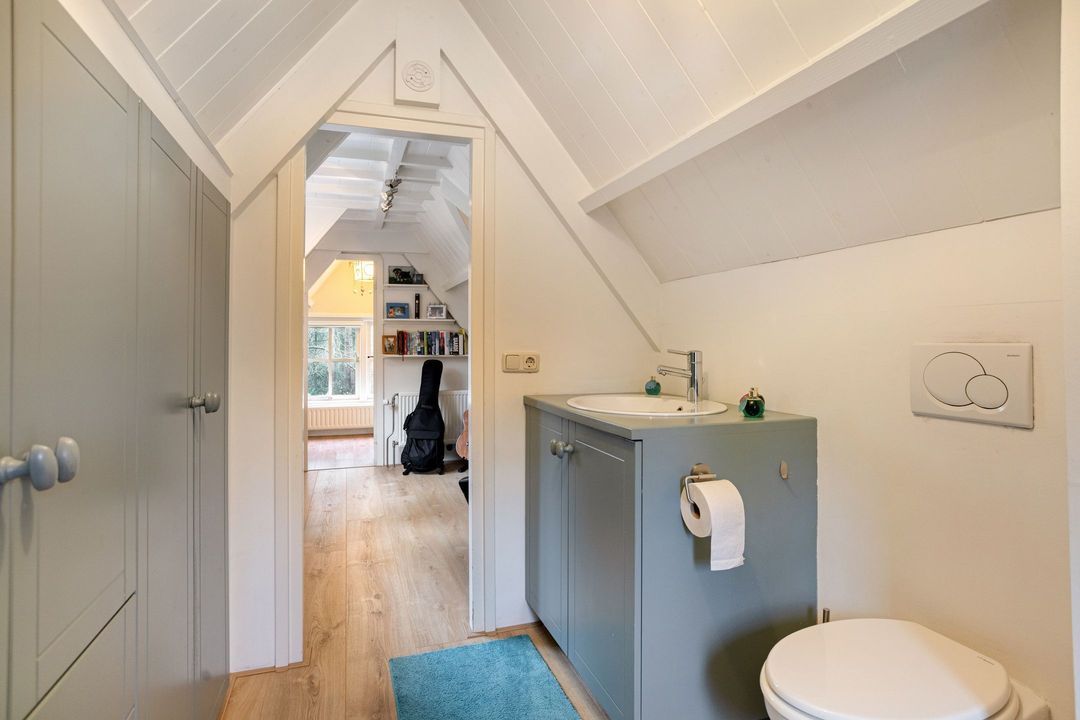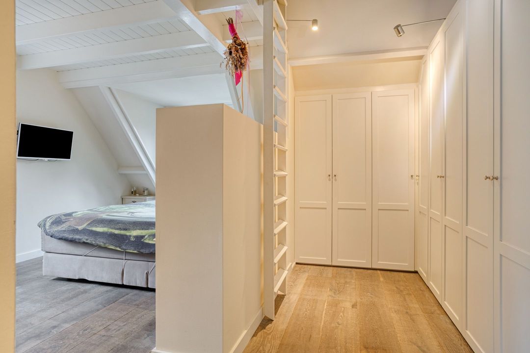 De zolderverdieping is ingericht als riante slaapruimte met ingebouwd tweepersoonsbed, een inloopkast en een eigen wastafel en toilet.