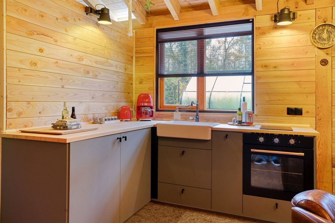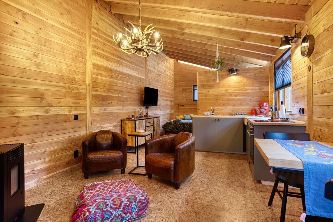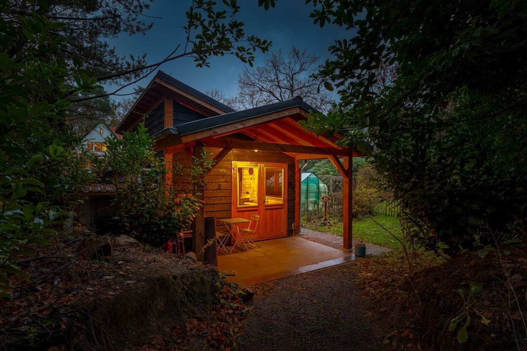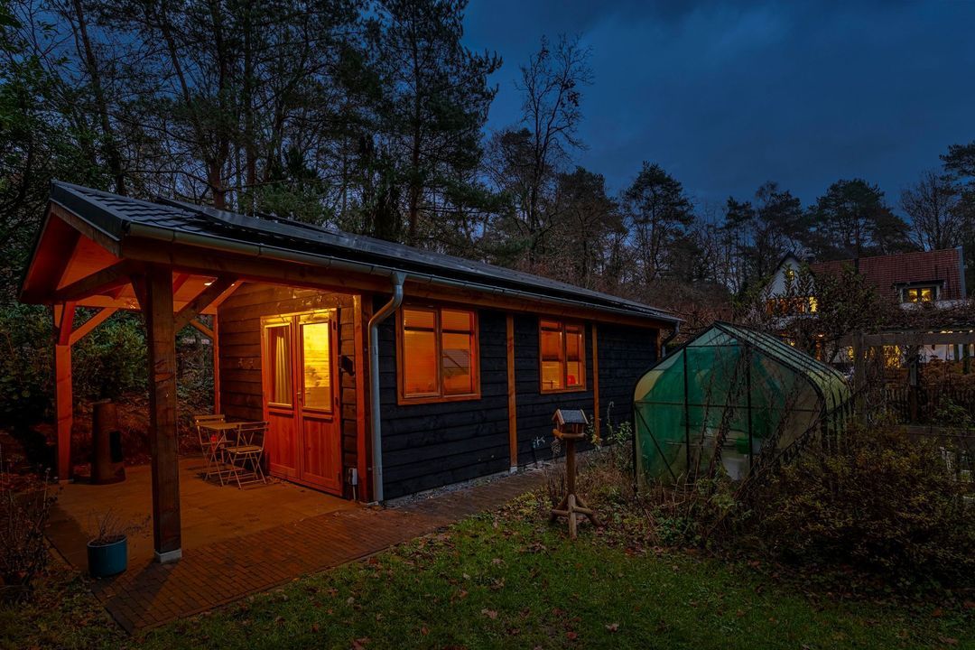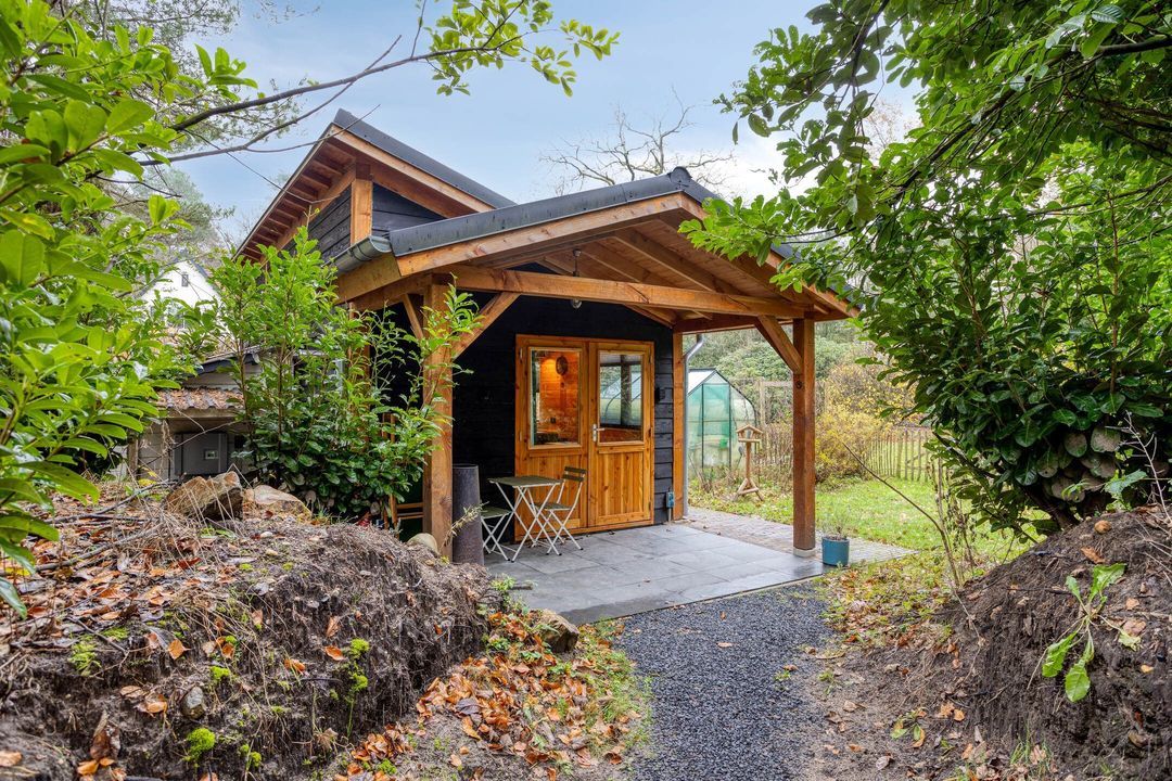 Op het perceel bevindt zich tevens een volledig ingericht gastenverblijf van circa 25 m² met woonkamer, open keuken, slaap- en badkamer. Ideaal voor logee, maar multifunctioneel voor gebruik. Het overdekte terras, de extra berging en houtopslag maken het geheel compleet. De vrijstaande garage biedt plaats aan vier auto’s en beschikt aan de achterzijde over een royale overkapping, geschikt voor fietsen of extra opslagruimte.