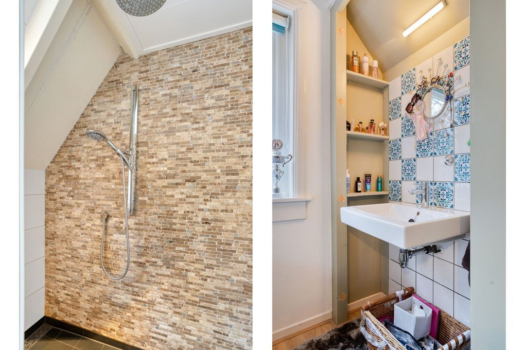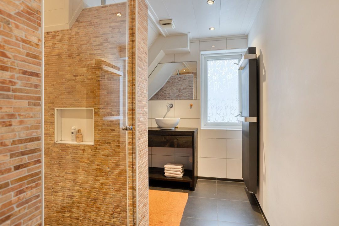 De eerste verdieping telt drie slaapkamers en twee moderne badkamers. De mastersuite beschikt over een inloopkast, dakterras, bergzolder en een royale badkamer met dubbele wastafel, inloopdouche en toilet. De overige slaapkamers zijn eveneens ruim en licht, en delen een tweede moderne badkamer met toilet, wastafel en separate inloopdouche.