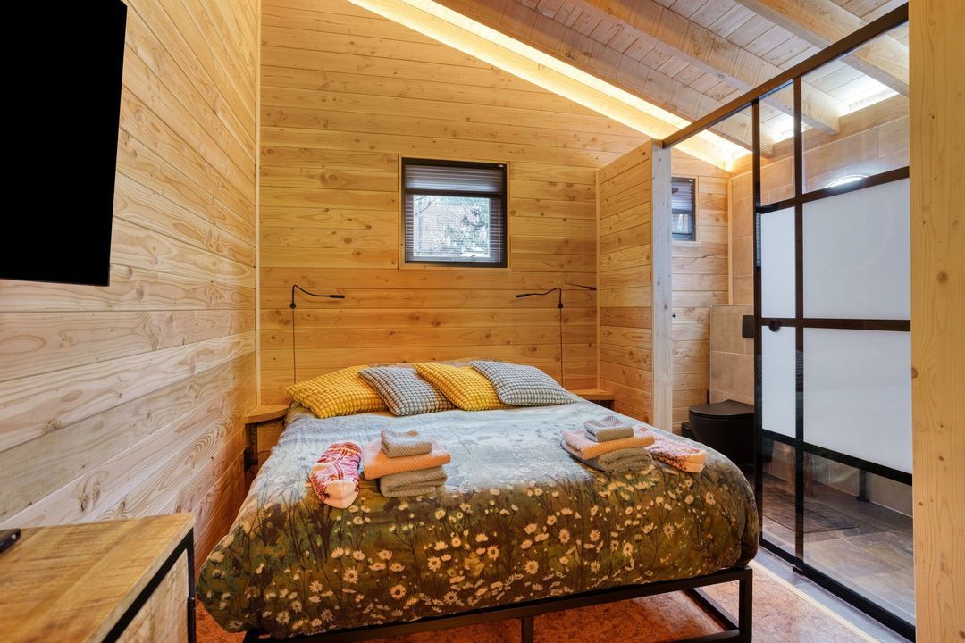 De zolderverdieping is ingericht als riante slaapruimte met ingebouwd tweepersoonsbed, een inloopkast en een eigen wastafel en toilet.