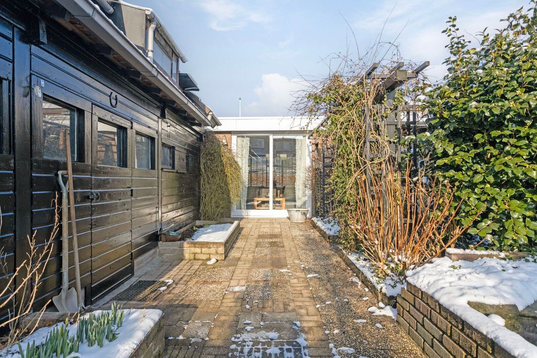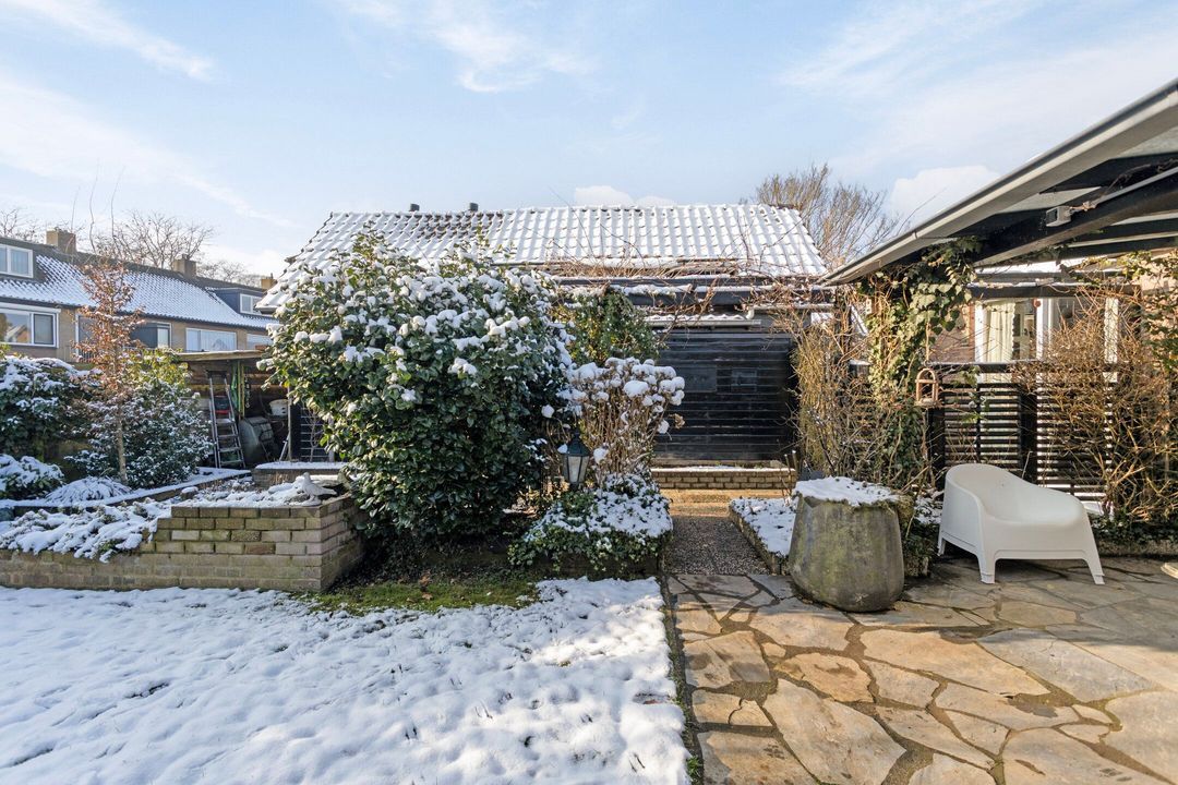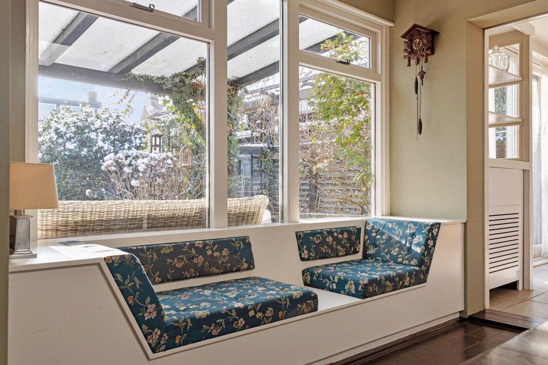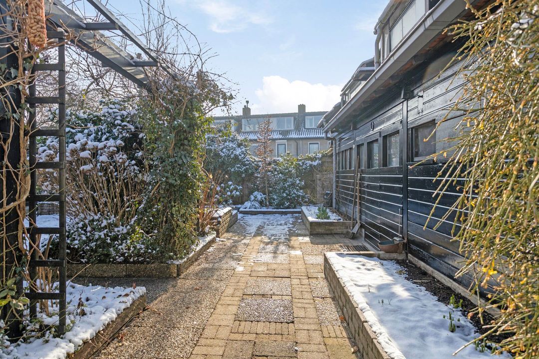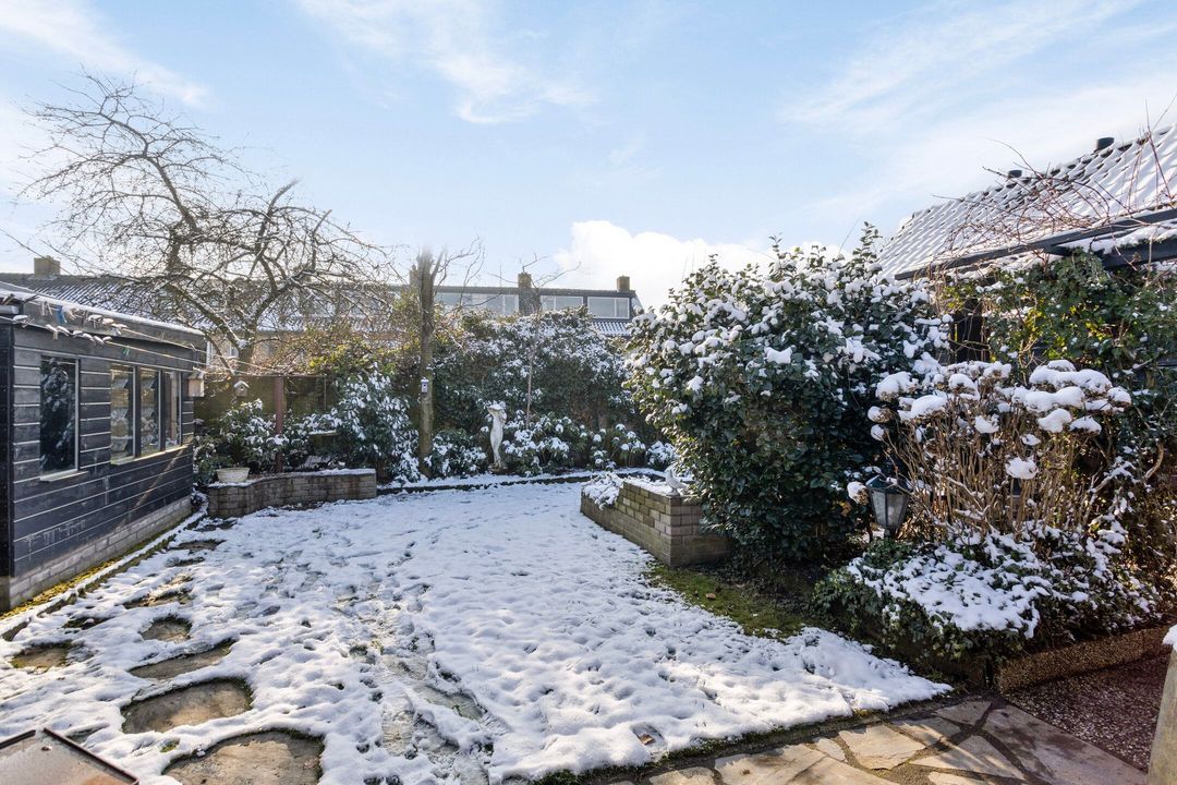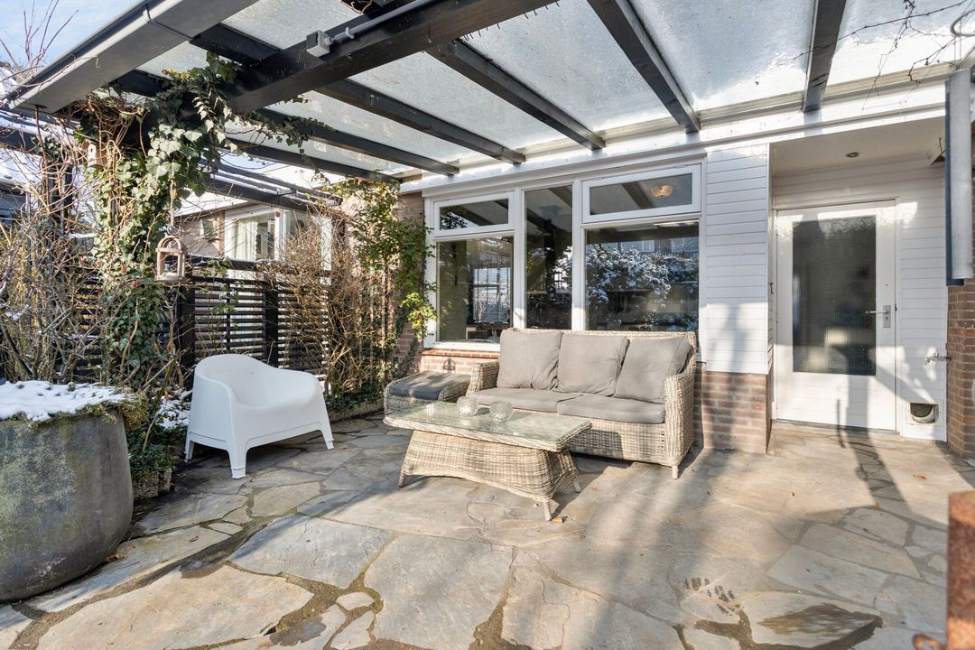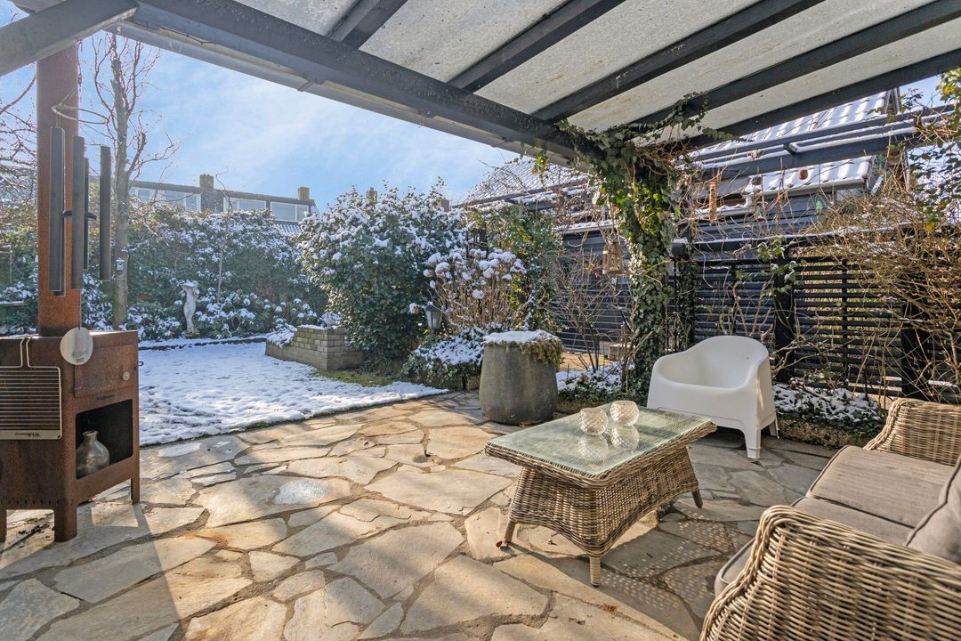 De fraaie, diepe tuin op het zuiden biedt volop privacy en is voorzien van een gezellige veranda. Een heerlijke plek om in alle rust te genieten van het buitenleven.