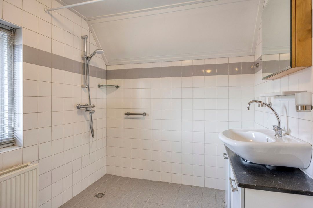 De fraaie bordestrap leidt naar de overloop waar zich twee royale slaapkamers bevinden. Beide kamers zijn licht en bieden volop mogelijkheden qua indeling. De badkamer is keurig afgewerkt en daarnaast is er een aparte cv ruimte aanwezig.