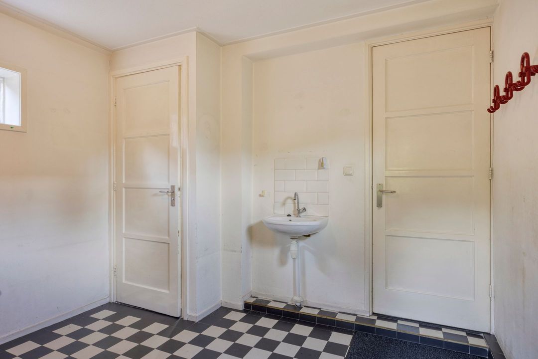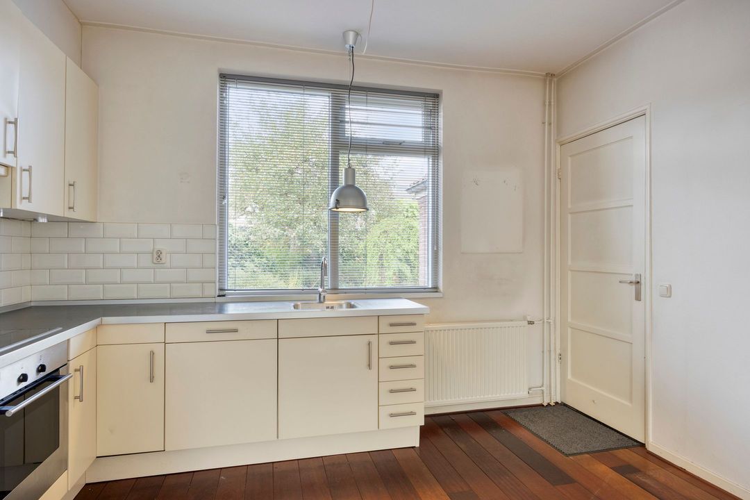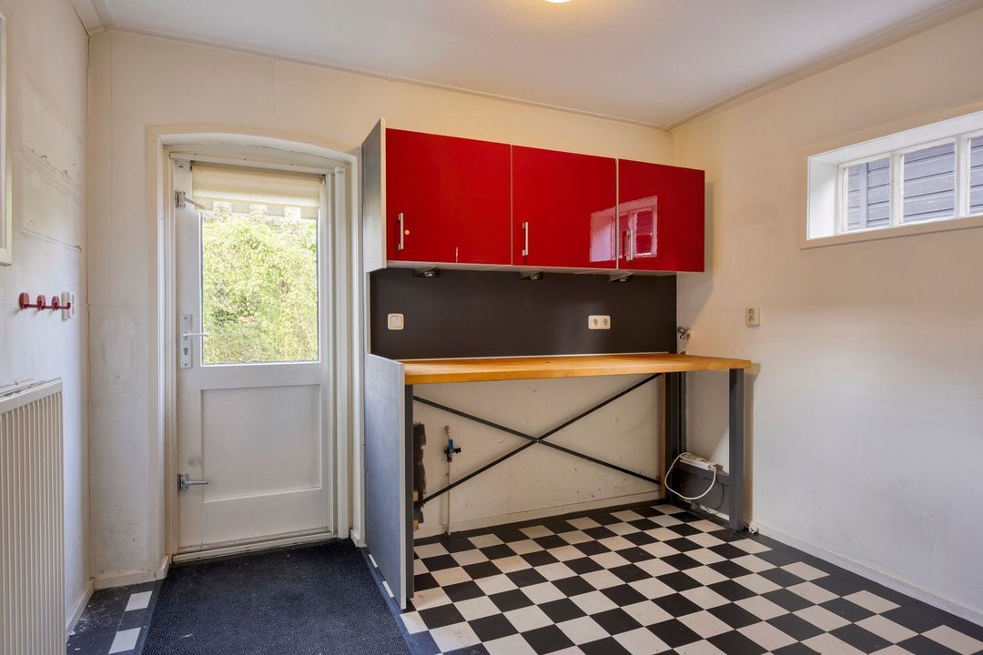 Via de entree bereikt u de hal met kelderkast, een praktische plek voor voorraad of proviand. De royale woonkamer valt direct op door de mooie houten vloer en de fijne lichtinval. De keuken in hoekopstelling is uitgerust met diverse inbouwapparatuur en biedt zicht op de achtertuin. Aangrenzend bevindt zich de bijkeuken met een separaat toilet en toegang tot buiten.