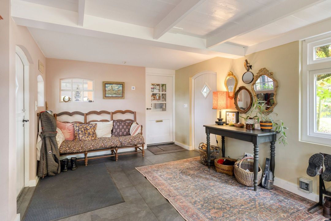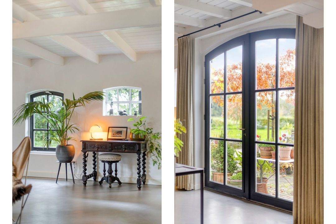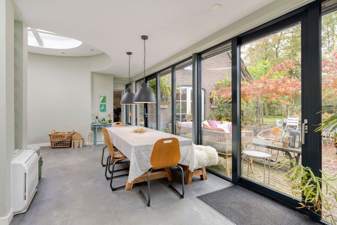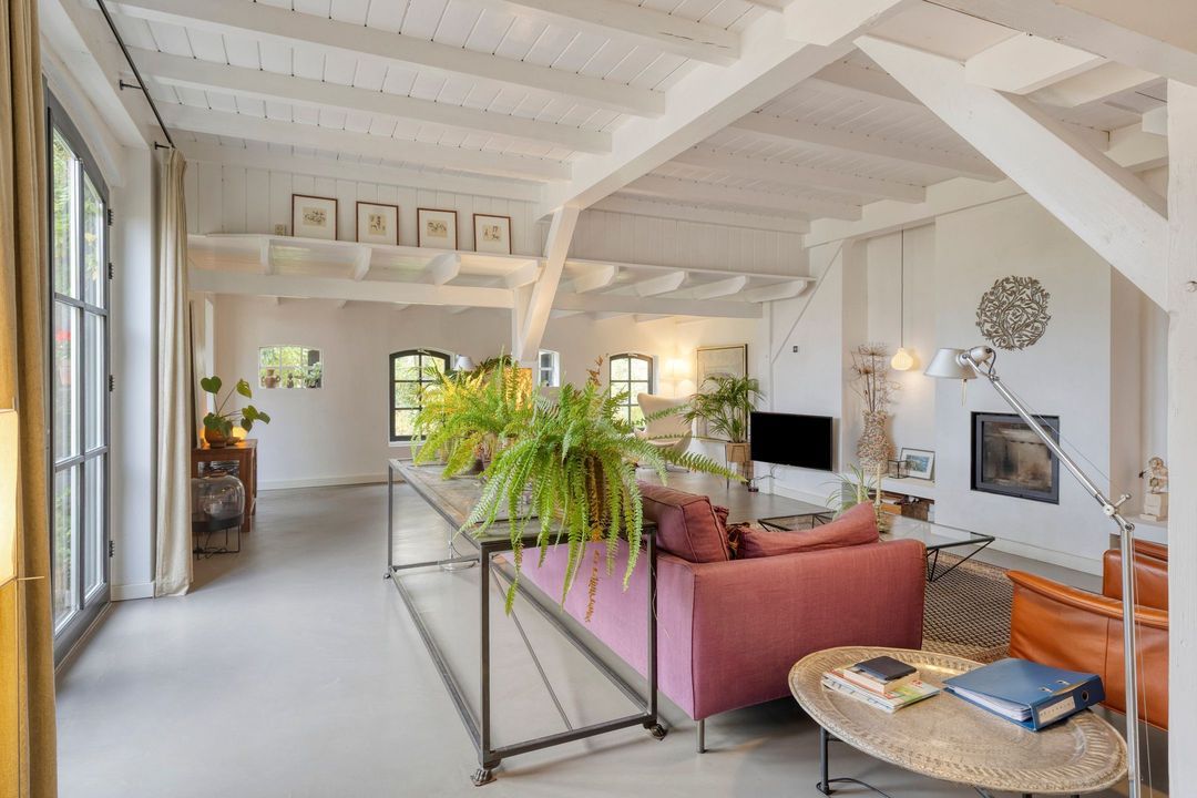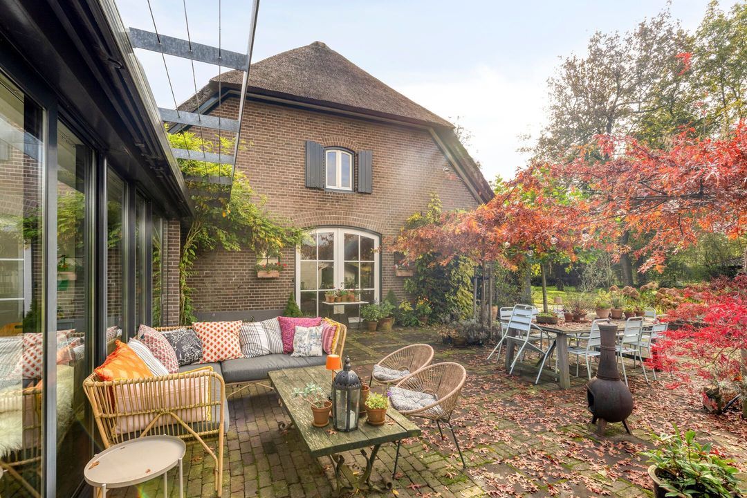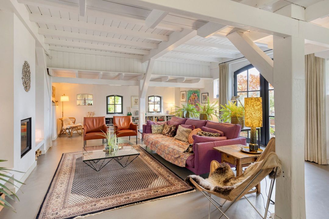 Bij aankomst betreedt u de woning via het voormalige bakhuis met hal en doorgang naar de boerderij. De sfeervolle woonkamer bevindt zich op de oude deel en ademt karakter dankzij de authentieke gebinten en het balkenplafond. De ruimte is voorzien van vloerverwarming, een inbouwhaard en openslaande deuren naar het terras. Vanuit hier bereikt u de moderne uitbouw, waar een lichte tuinkamer met prachtig uitzicht over de tuin is gerealiseerd.