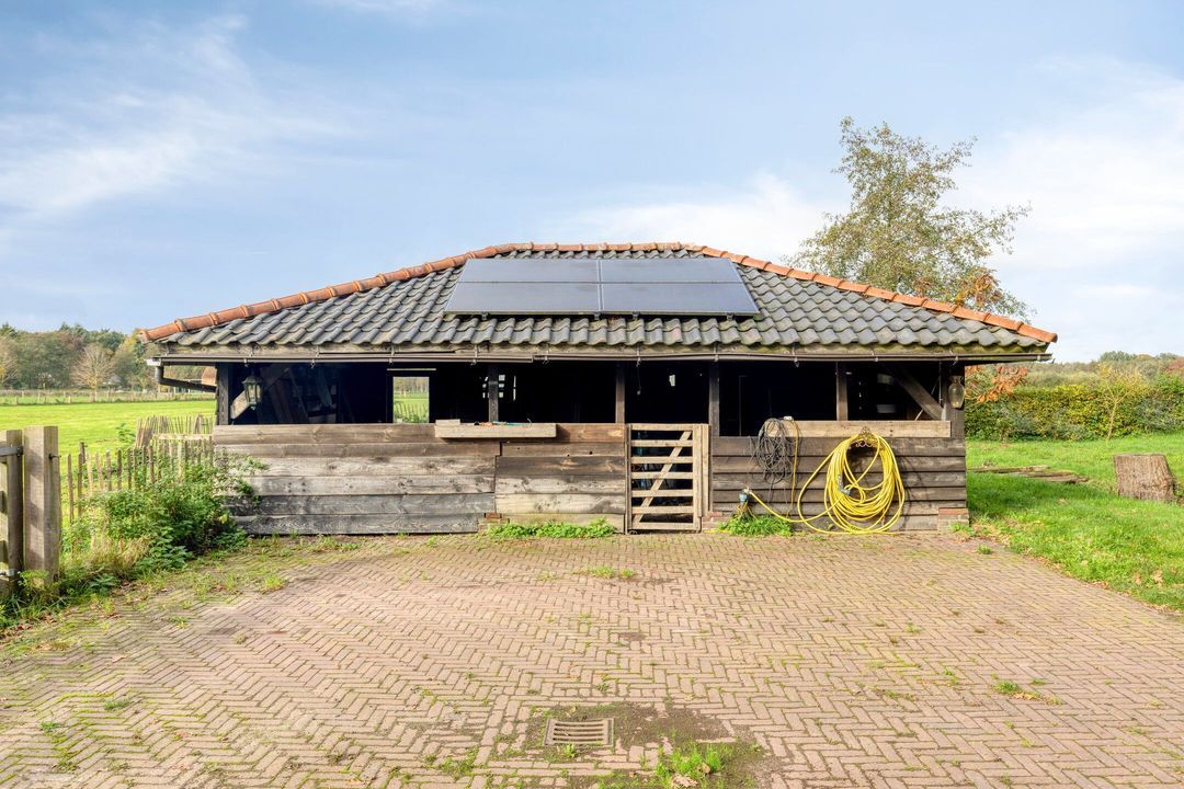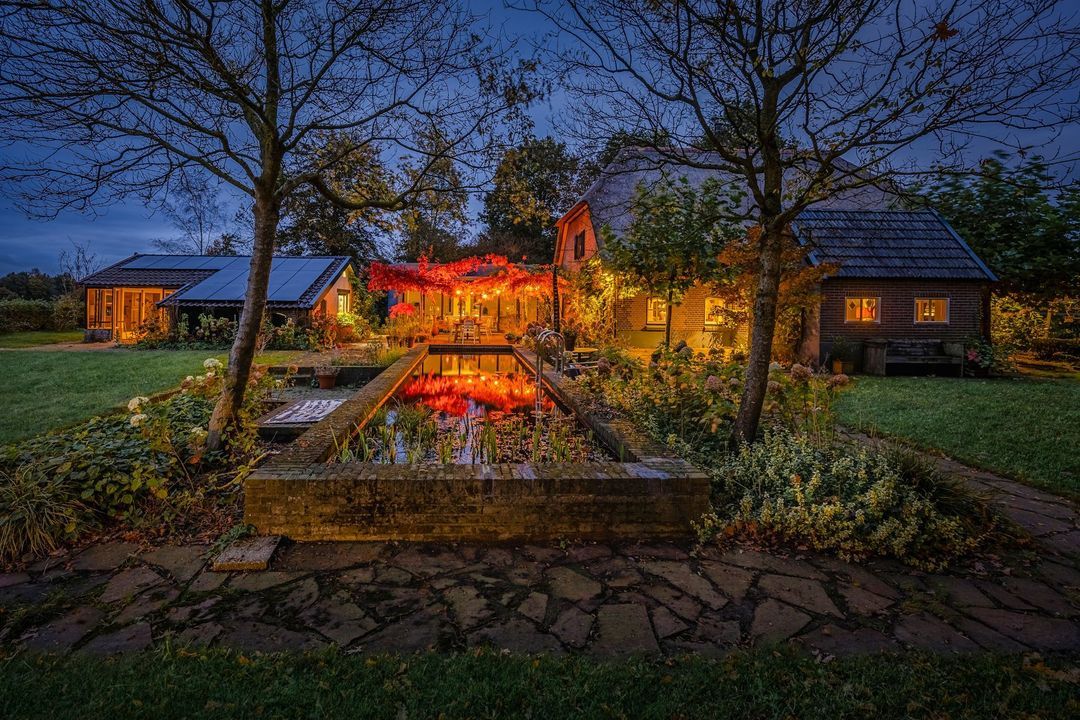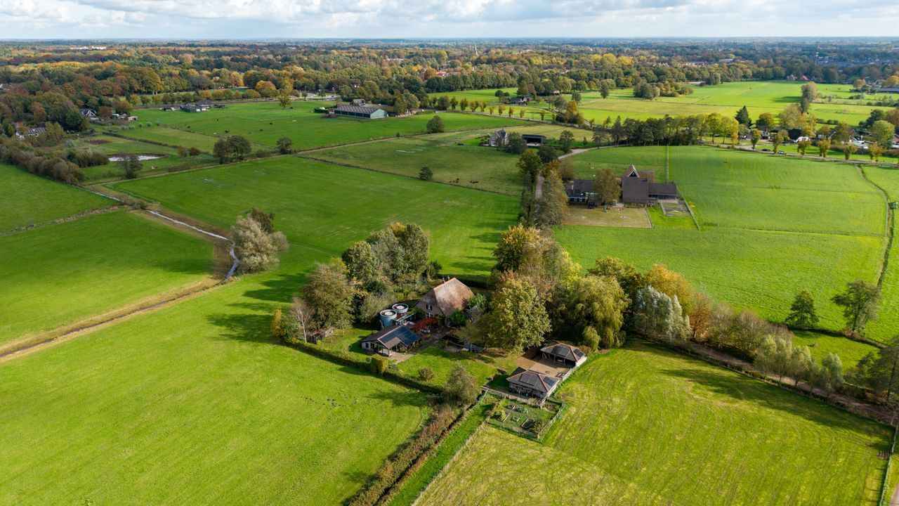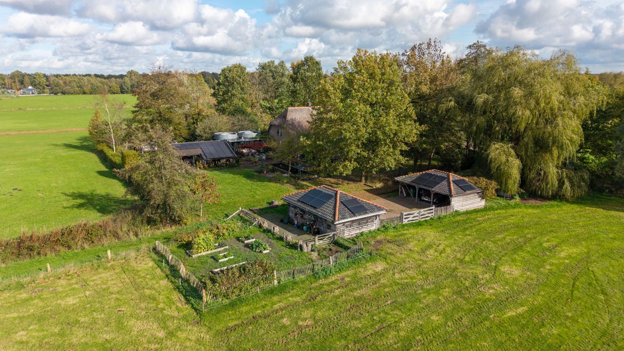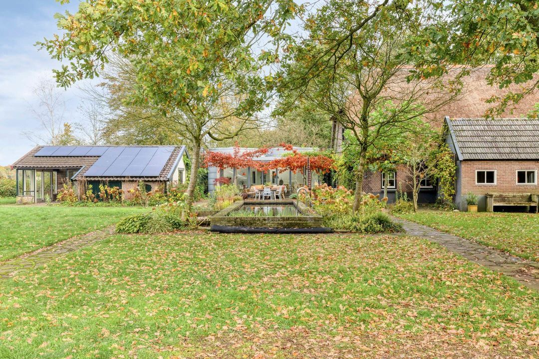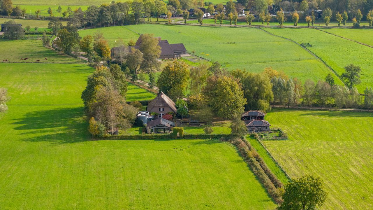 Buiten is het minstens zo indrukwekkend. Op het terrein staan diverse bijgebouwen, waaronder een stenen schuur van circa 40 m² met veranda en berging, en twee kapschuren van ieder ongeveer 40 m² die in gebruik zijn als carport, berging en dierenverblijf. Daarnaast is er een fraaie zwemvijver en zijn er meerdere terrassen met panoramisch uitzicht over de omliggende weilanden.