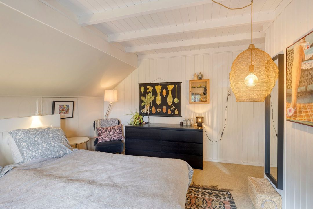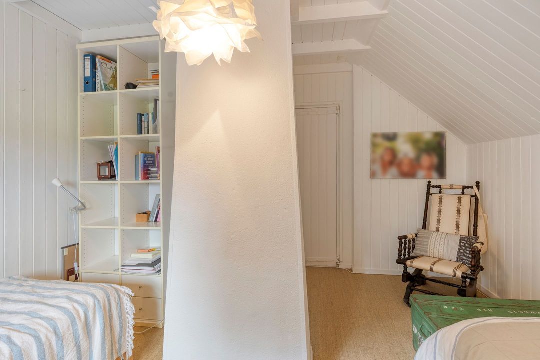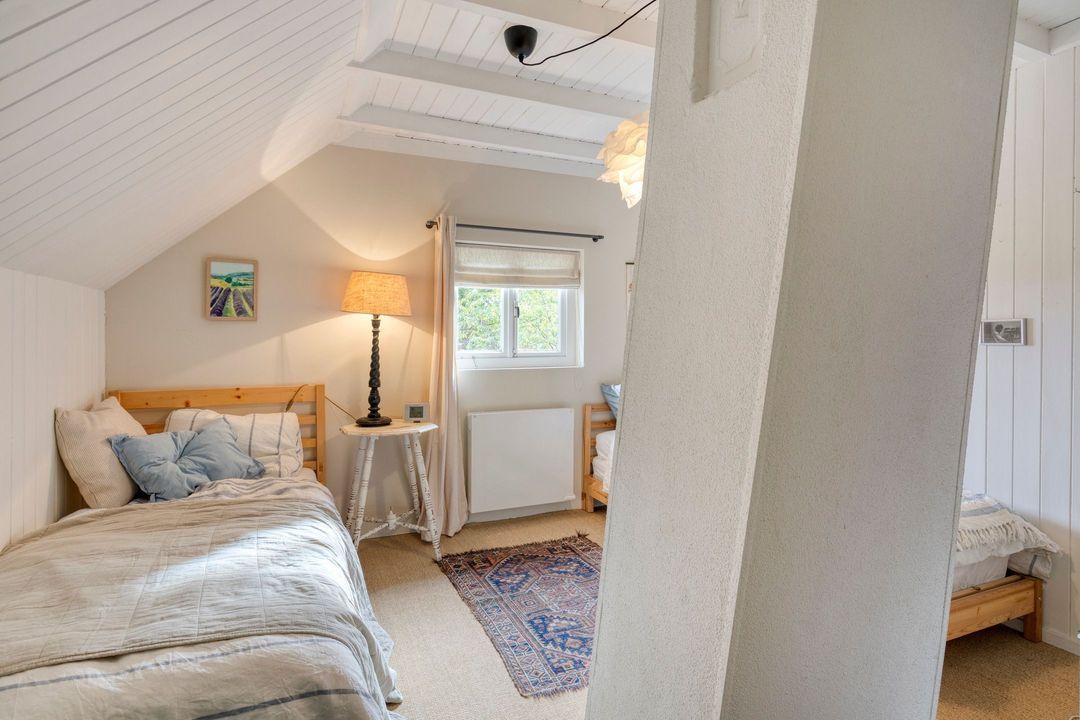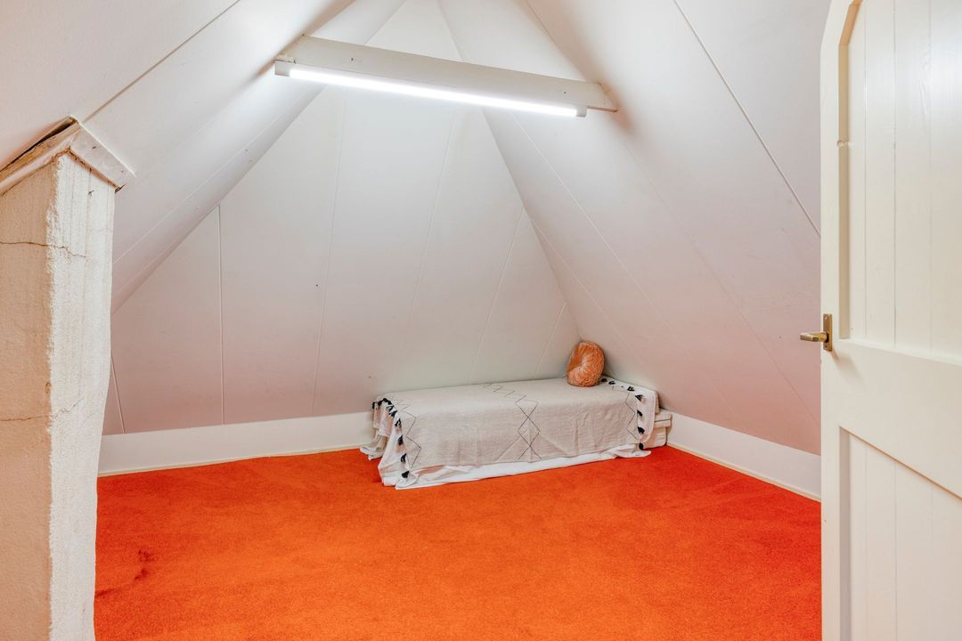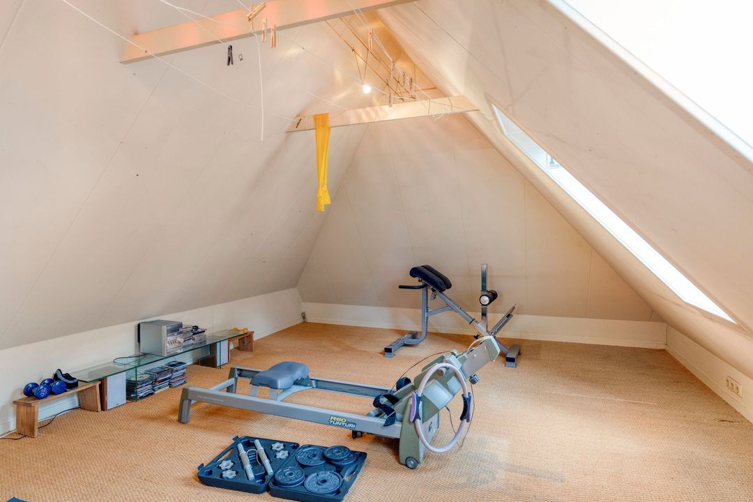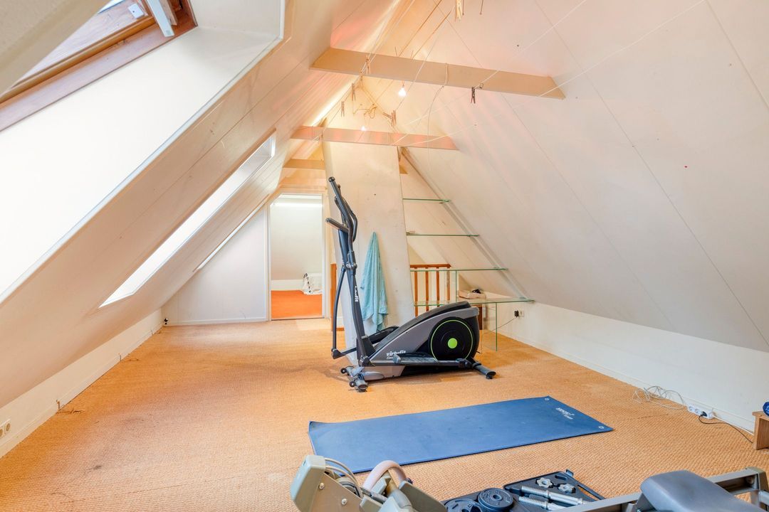 De tweede verdieping is bereikbaar via een vaste trap en beschikt over een extra slaapkamer en een open ruimte die momenteel wordt gebruikt als fitnessruimte.