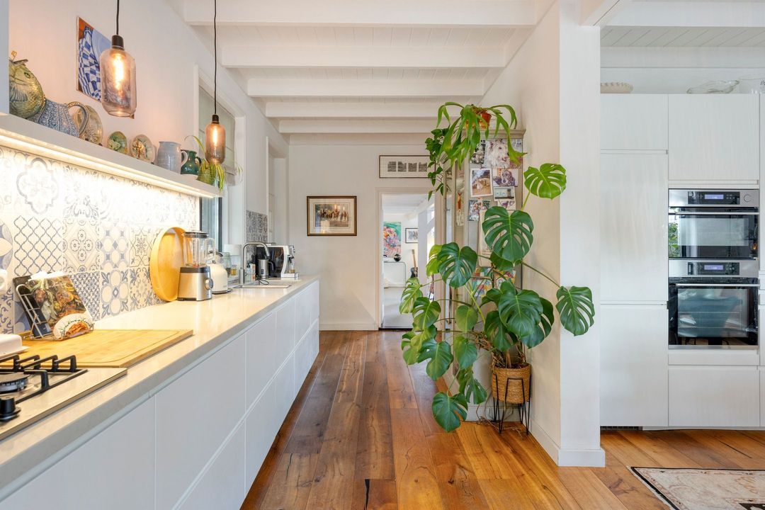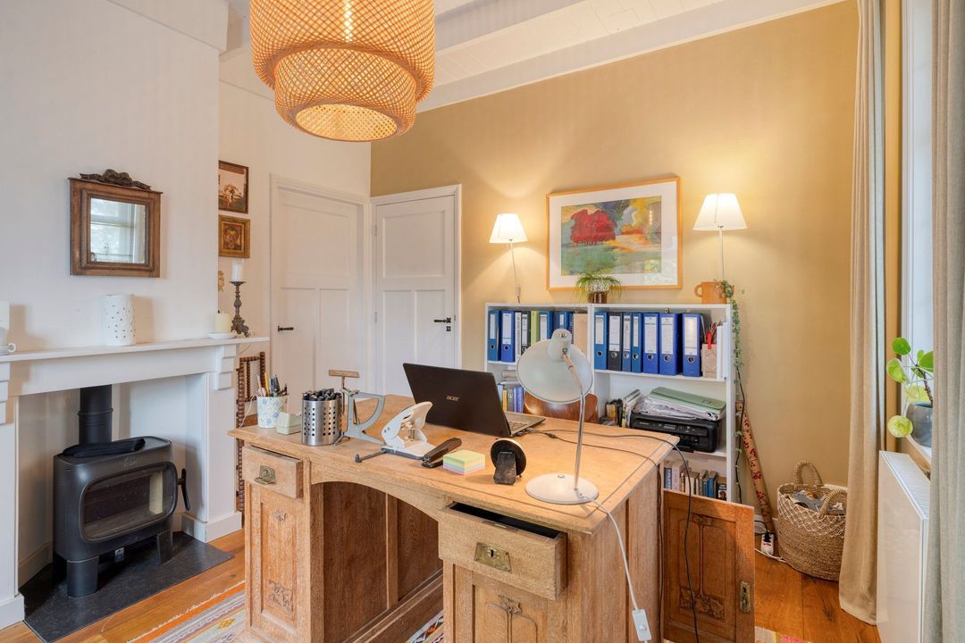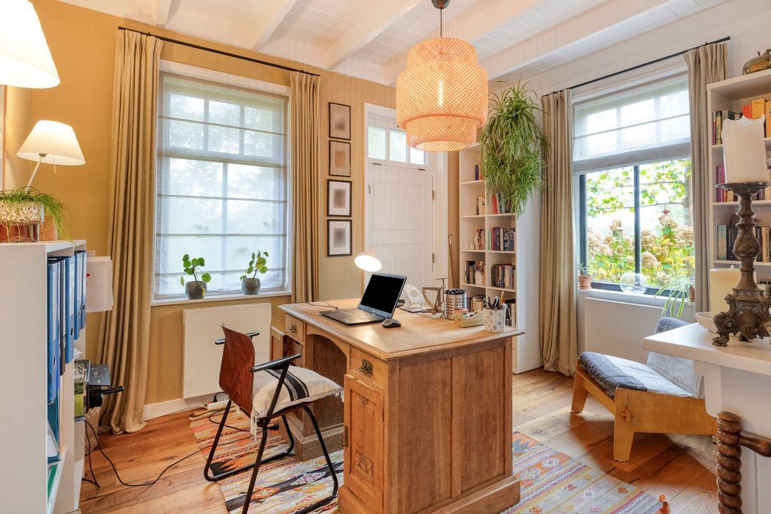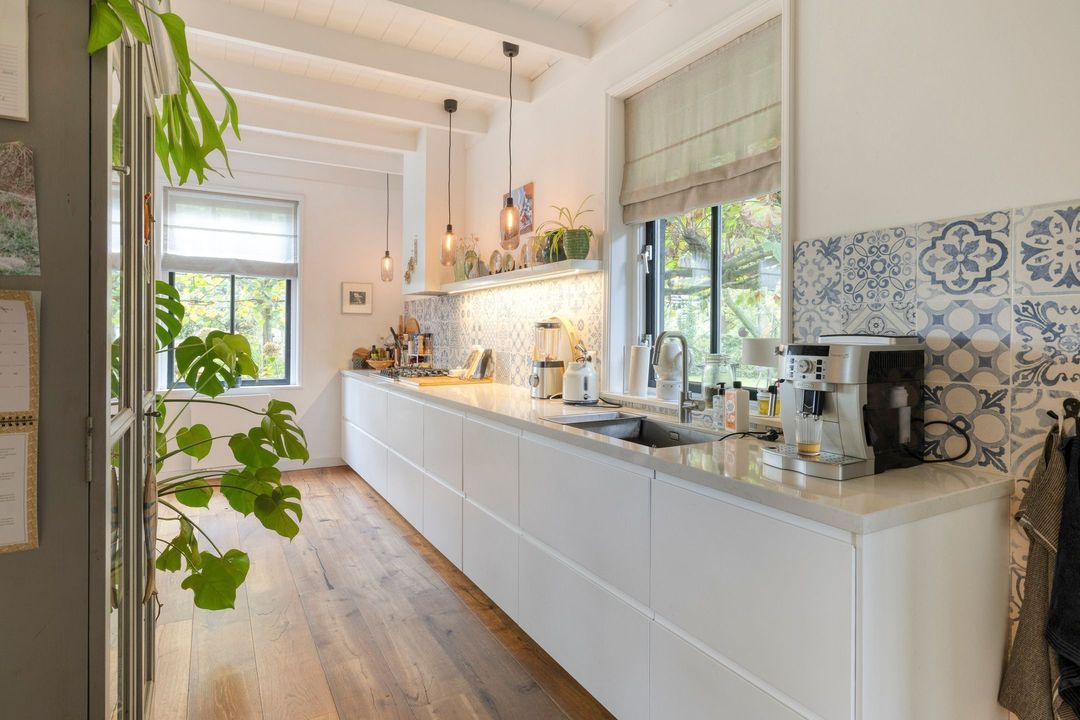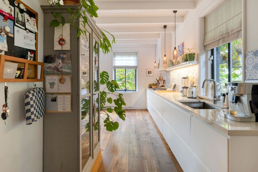 Aan de voorzijde bevindt zich de royale woonkeuken met moderne opstelling en hoogwaardige inbouwapparatuur, waaronder een koelkast, vriezer, vaatwasser, oven, afzuigkap, kookplaat en combimagnetron. Verder vindt u op de begane grond een kelder, een bijkeuken/badkamer met inloopdouche, dubbele wastafel en aansluitingen voor wasapparatuur. Aansluitend is er een werk- of slaapkamer, ideaal voor thuiswerken of slapen op de begane grond.