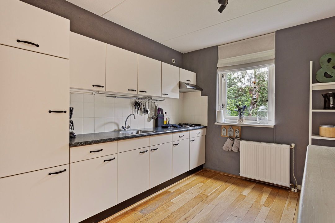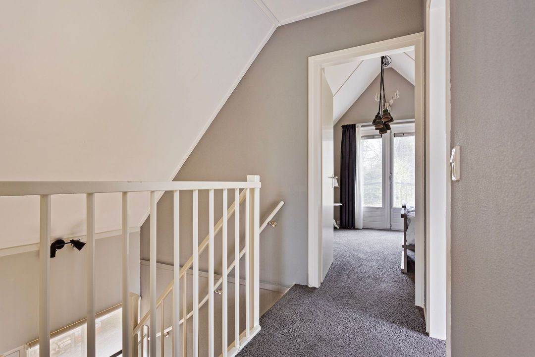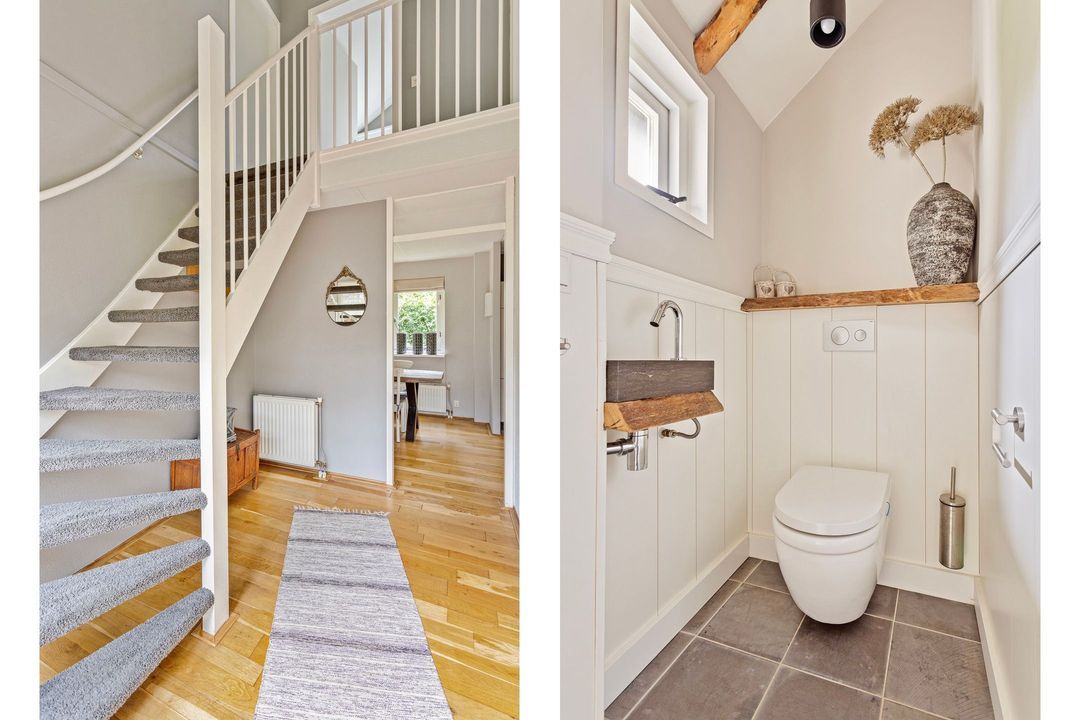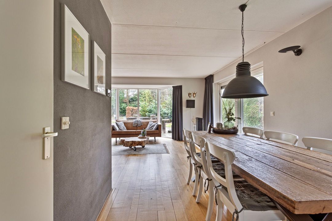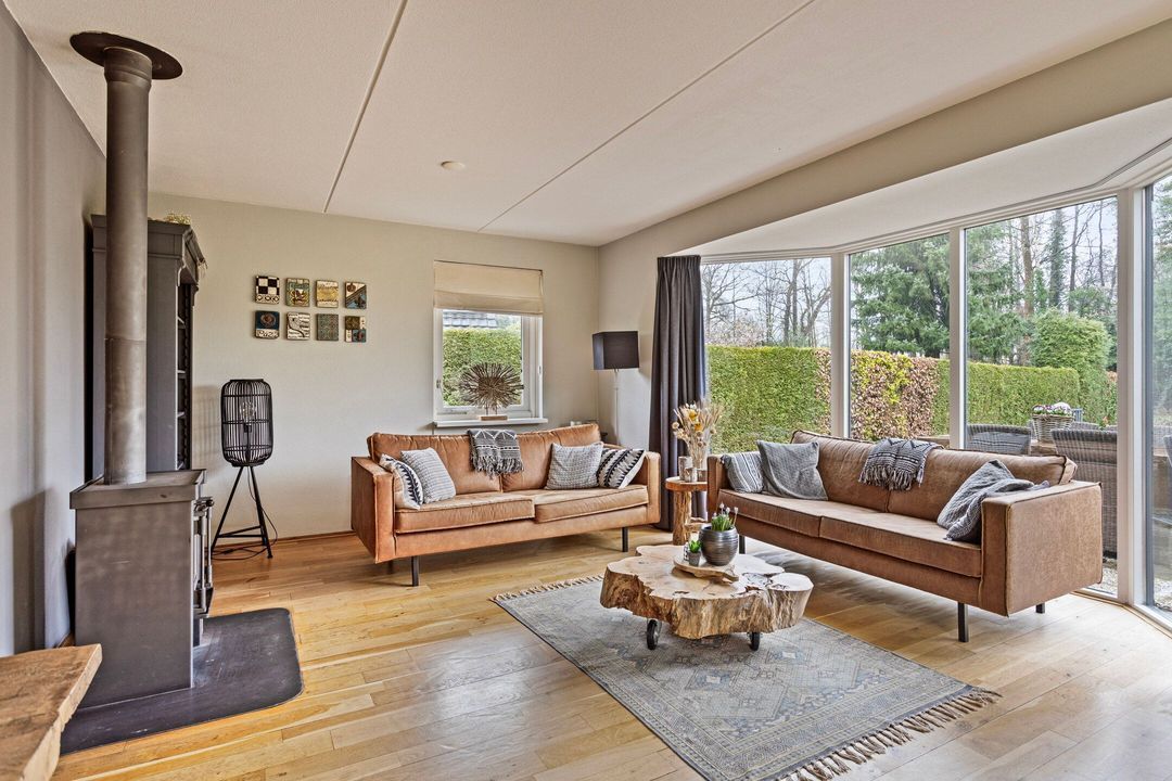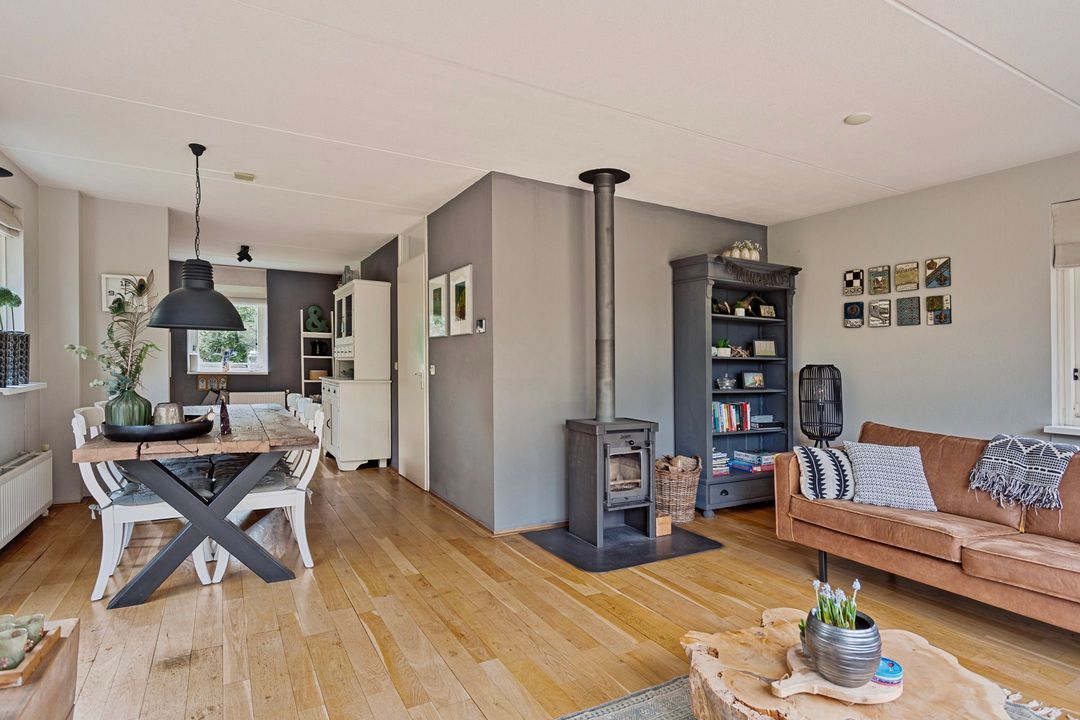 Bij binnenkomst wordt u begroet door een sfeervolle hal met vide, die direct de ruimtelijkheid van de woning benadrukt. De royale woonkamer is een knusse plek waar het hele jaar door genoten kan worden: in de zomer zet u de schuifpui open naar het zonnige terras op het zuiden, en in de winter zorgt de houtkachel voor een warme, gezellige sfeer. De open keuken, voorzien van inbouwapparatuur, nodigt uit om heerlijke maaltijden te bereiden, terwijl de eethoek uitkijkt op de prachtige tuin.