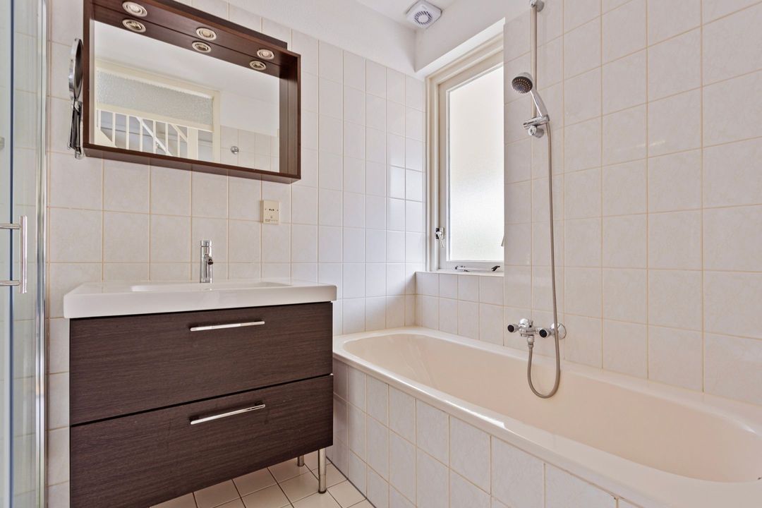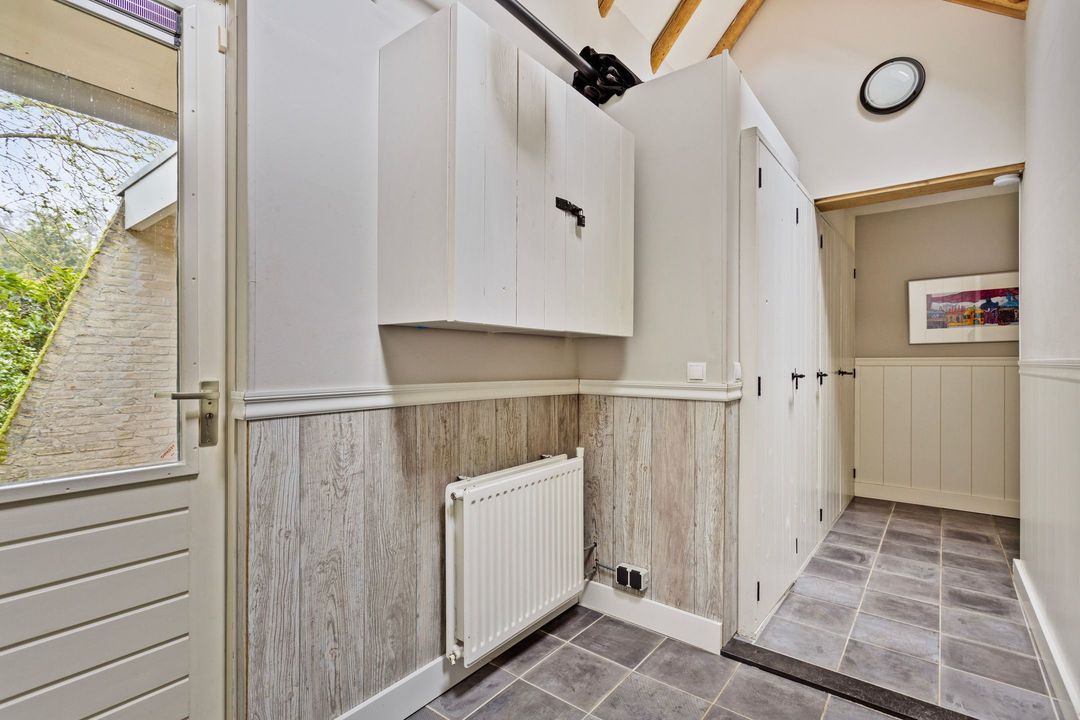 Op de begane grond bevindt zich tevens een moderne badkamer, uitgevoerd in lichte tinten en voorzien van een ligbad, douche, wastafelmeubel en toilet. Aan de achterzijde vindt u een praktische royale bijkeuken met extra bergruimte, vloerverwarming, 2e toilet, aansluiting voor wasmachine en vaatwasser, elektrische boiler en een eigen ingang.
