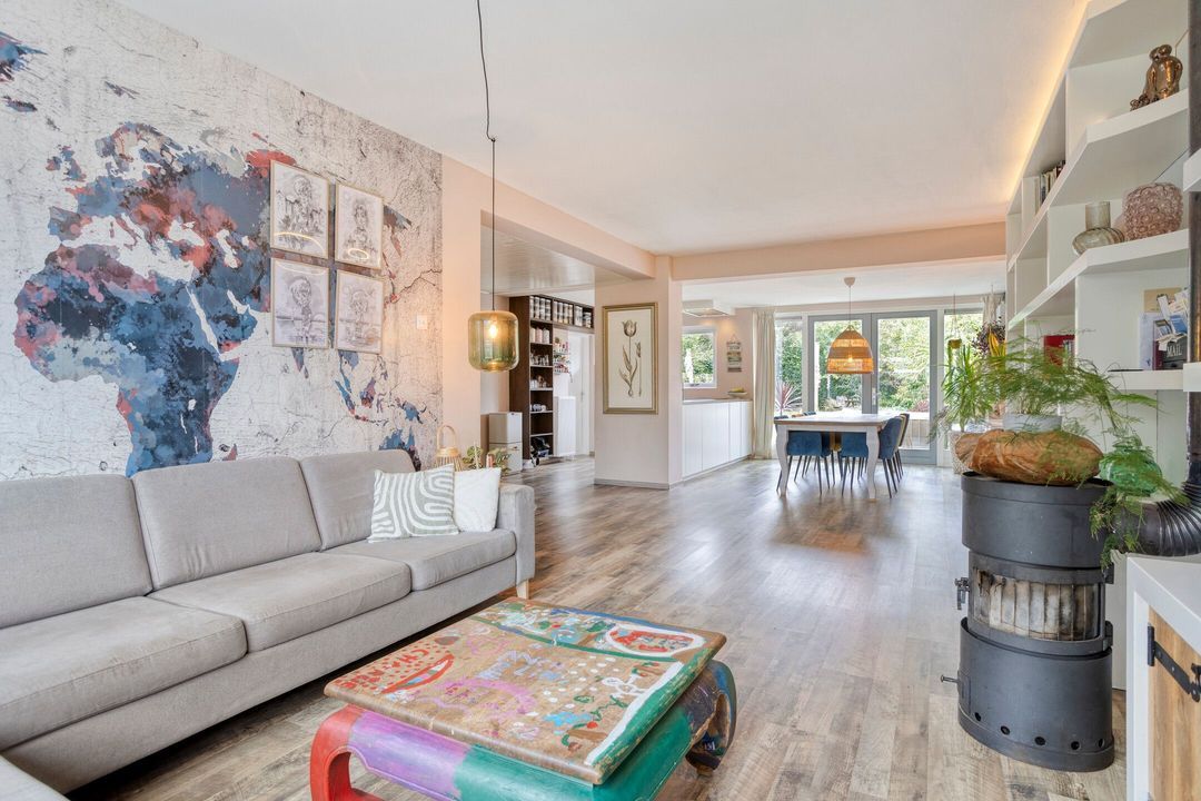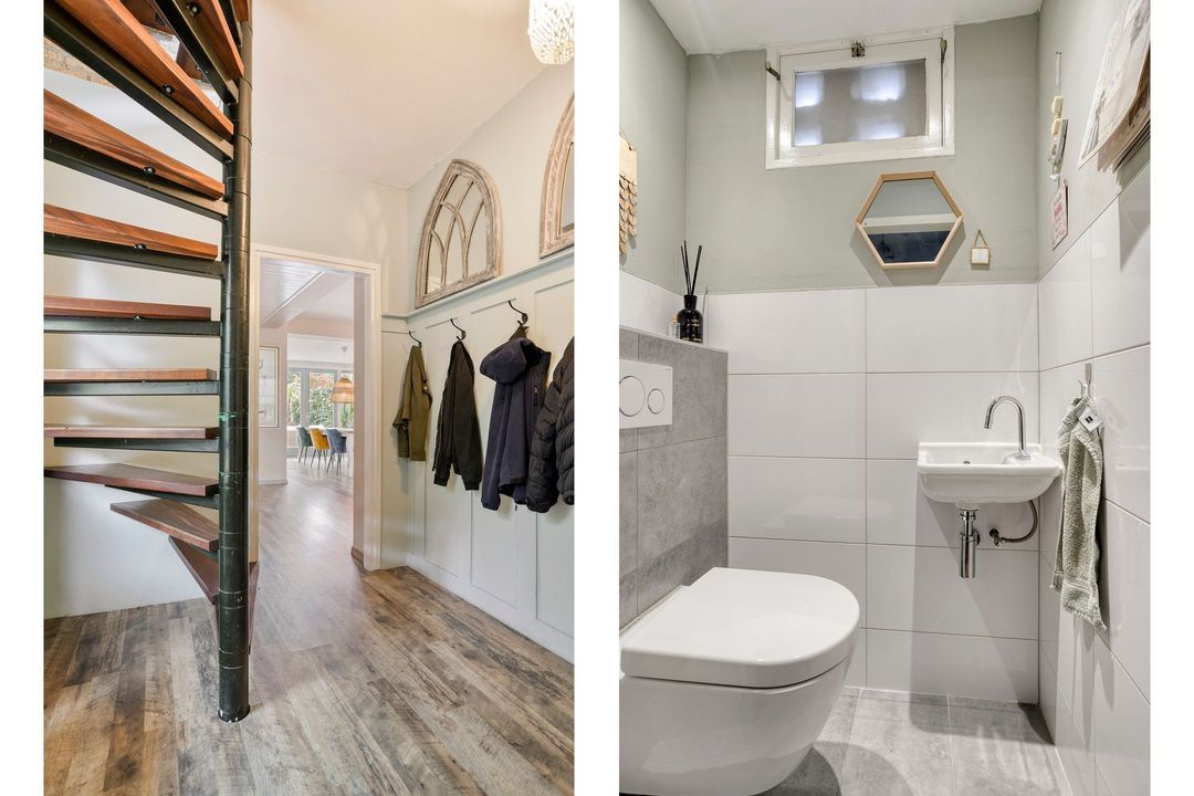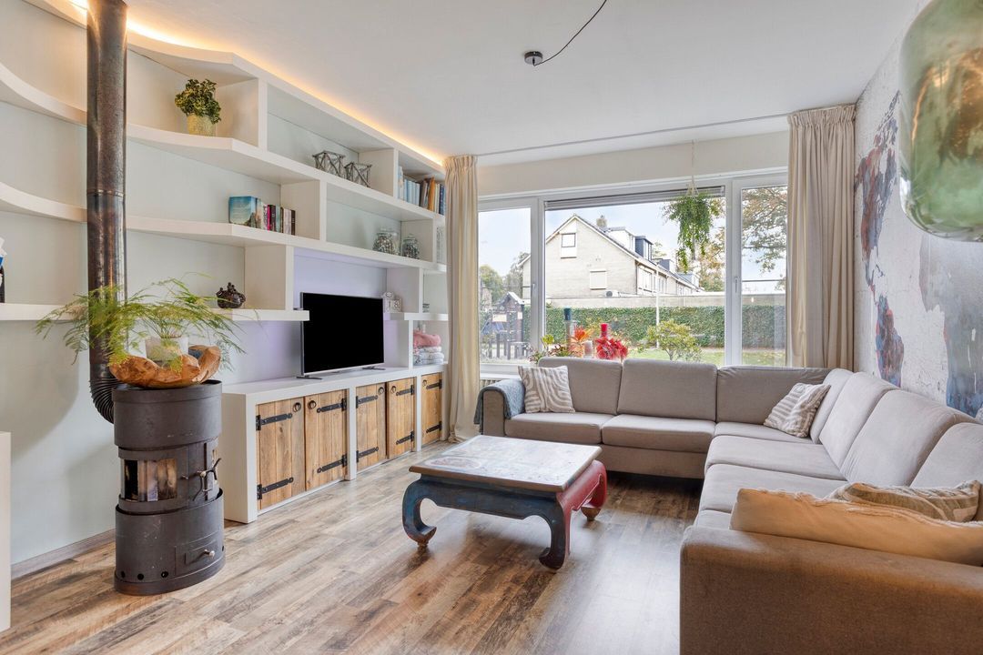 Op de begane grond bevindt zich een overdekte entree, hal met meterkast en modern toilet. De zeer ruime woonkamer is verdeeld in een zitkamer, eetkamer en tv-kamer en beschikt over een sfeervolle houtkachel, een praktische kastenwand en openslaande deuren naar het terras aan de achterzijde. De open keuken heeft een moderne opstelling met diverse inbouwapparatuur, waaronder een inductiekookplaat, afzuigkap, vaatwasser, combimagnetron en Quooker. Aansluitend bevindt zich een ruime bijkeuken met kastenwand, aansluitingen voor wasapparatuur en een achteringang.