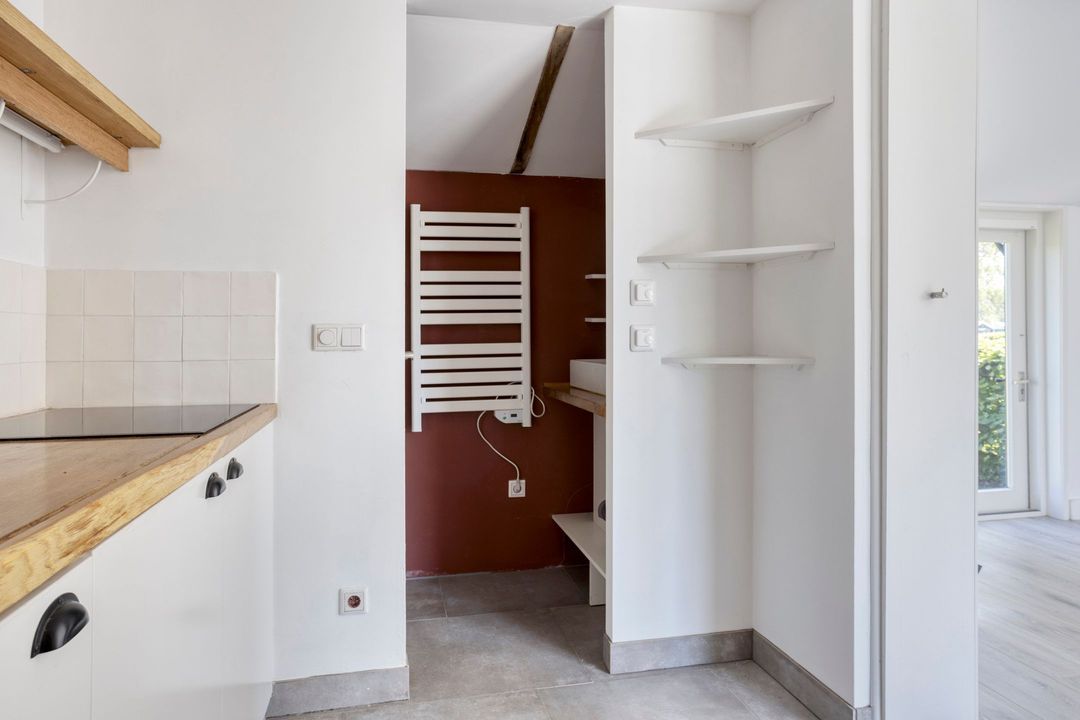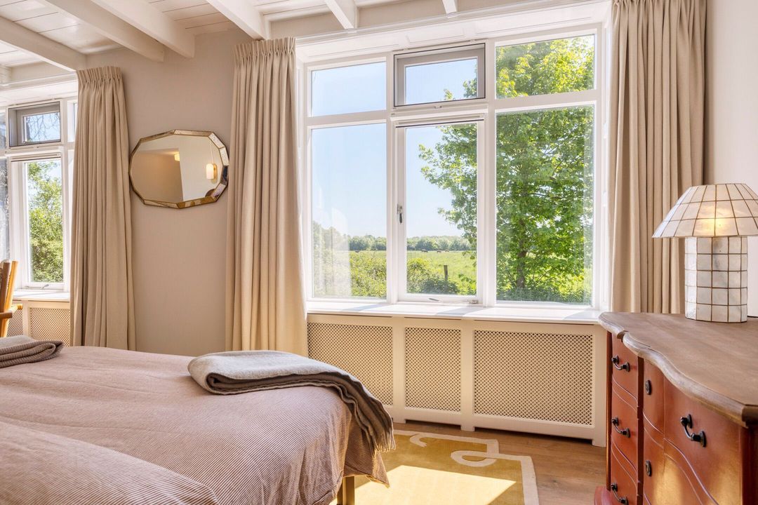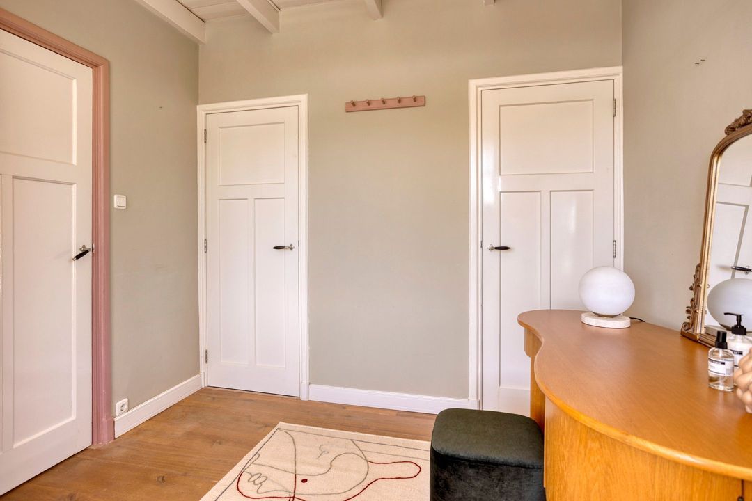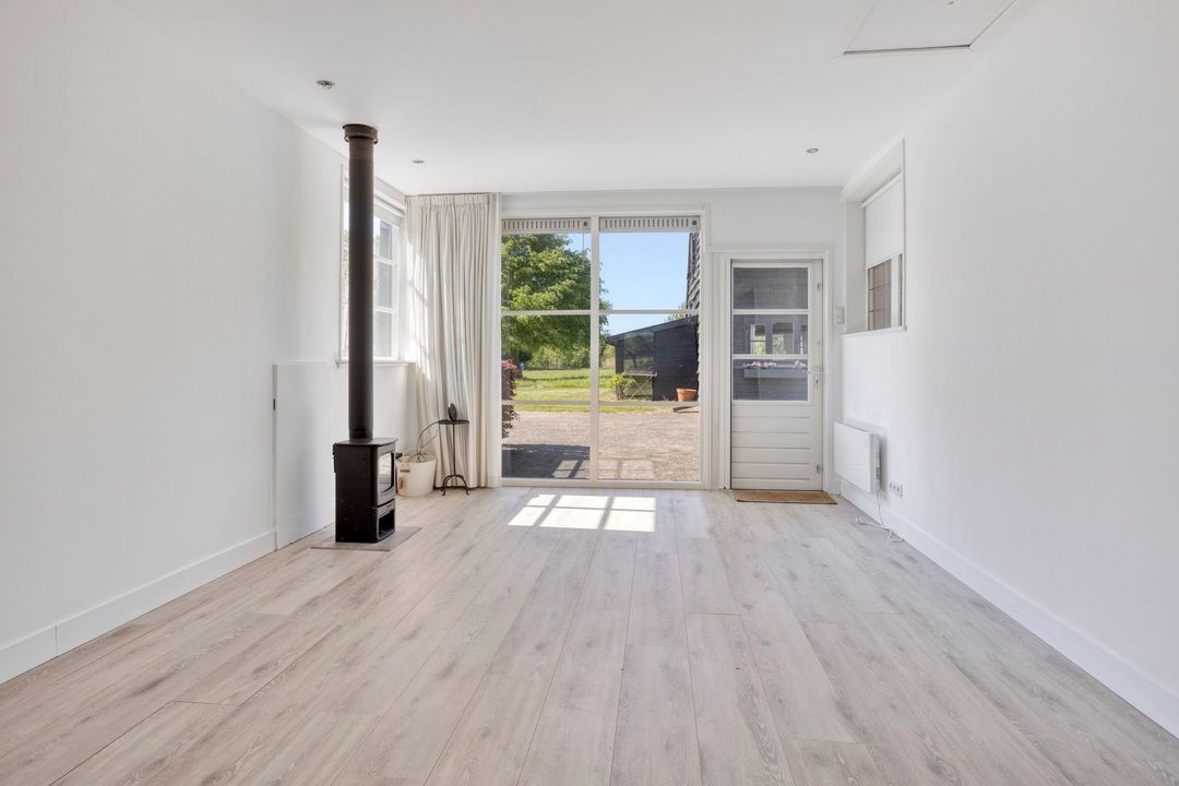 De woning biedt een warme en uitnodigende entree met hal en meterkast. De royale woonkamer ademt sfeer, met zichtbare originele gebinten, een estriken vloer met vloerverwarming, een sfeervolle schouw met houtkachel en openslaande deuren naar het zonnige terras op het zuiden. Aangrenzend vindt u een werkkamer en een ruime woonkeuken in landelijke stijl, voorzien van diverse inbouwapparatuur. Via de achteringang bereikt u een hal met toilet, een royale slaapkamer met airconditioning en een moderne badkamer met ligbad, inloopdouche, dubbele wastafel en toilet. Tevens zijn er een tweede slaapkamer (momenteel in gebruik als kledingruimte met kastenwand), een kantoorruimte en een praktische bijkeuken met keukenblok en aansluitingen voor wasapparatuur aanwezig.