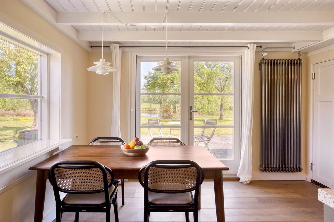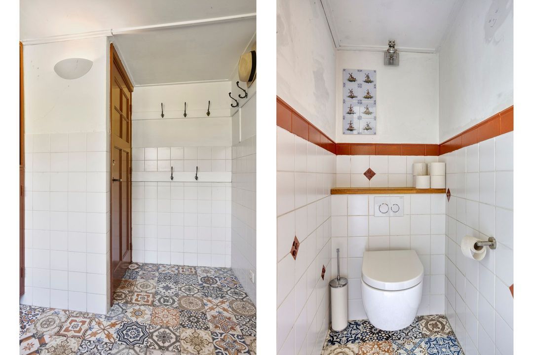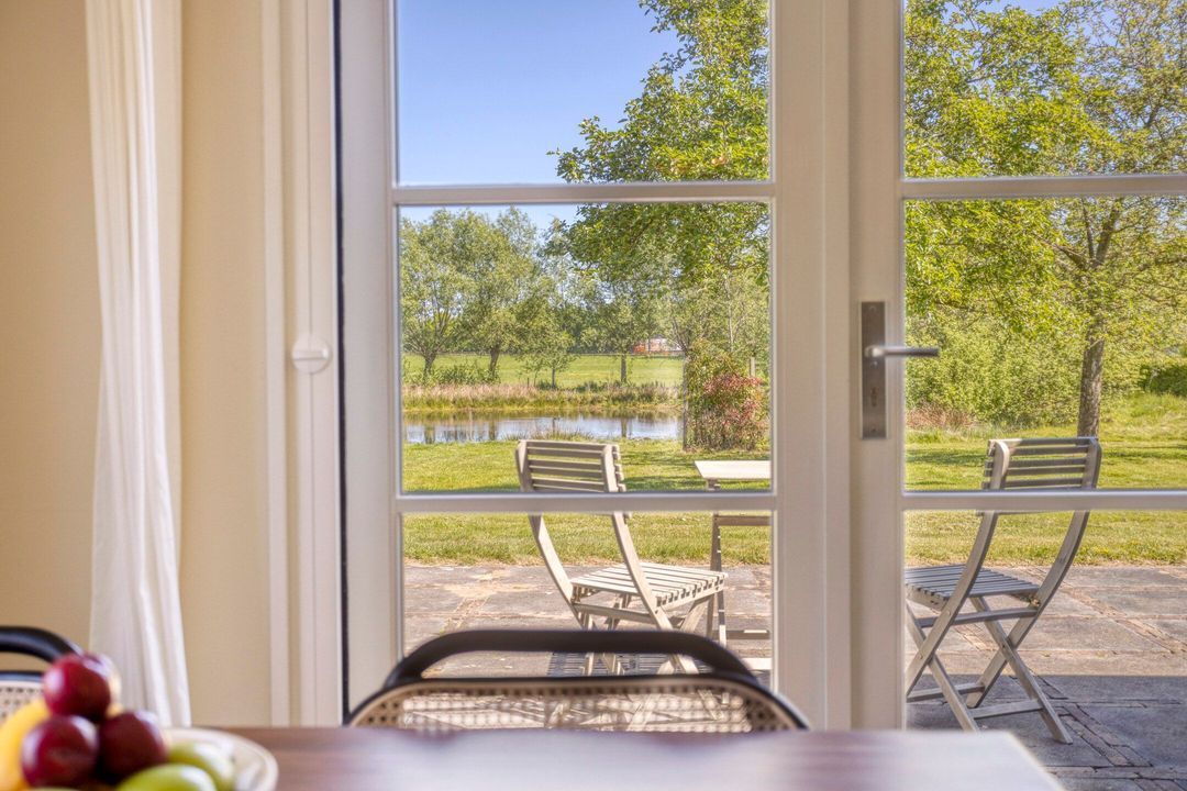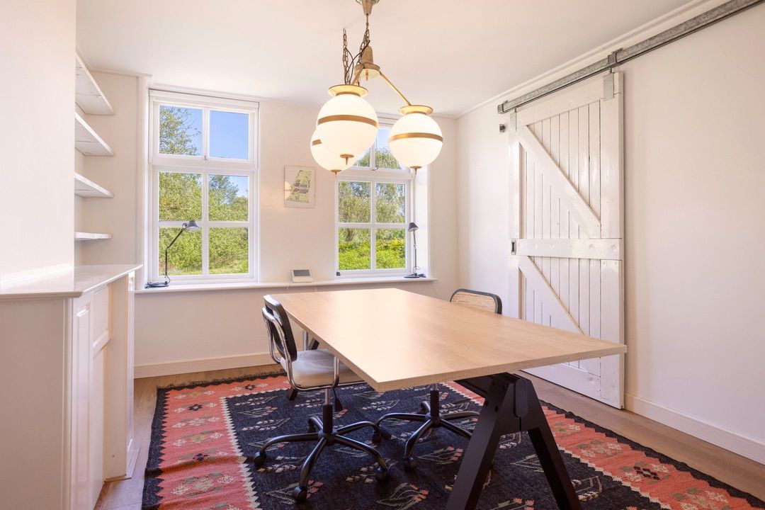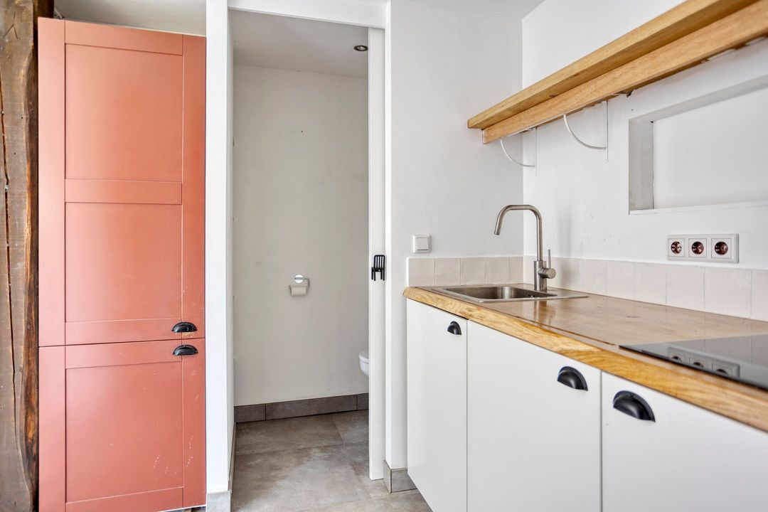 De woning biedt een warme en uitnodigende entree met hal en meterkast. De royale woonkamer ademt sfeer, met zichtbare originele gebinten, een estriken vloer met vloerverwarming, een sfeervolle schouw met houtkachel en openslaande deuren naar het zonnige terras op het zuiden. Aangrenzend vindt u een werkkamer en een ruime woonkeuken in landelijke stijl, voorzien van diverse inbouwapparatuur. Via de achteringang bereikt u een hal met toilet, een royale slaapkamer met airconditioning en een moderne badkamer met ligbad, inloopdouche, dubbele wastafel en toilet. Tevens zijn er een tweede slaapkamer (momenteel in gebruik als kledingruimte met kastenwand), een kantoorruimte en een praktische bijkeuken met keukenblok en aansluitingen voor wasapparatuur aanwezig.