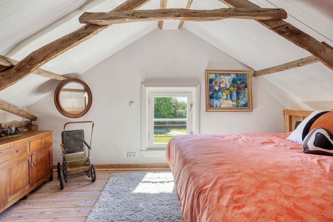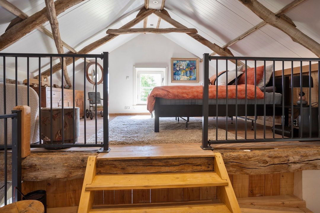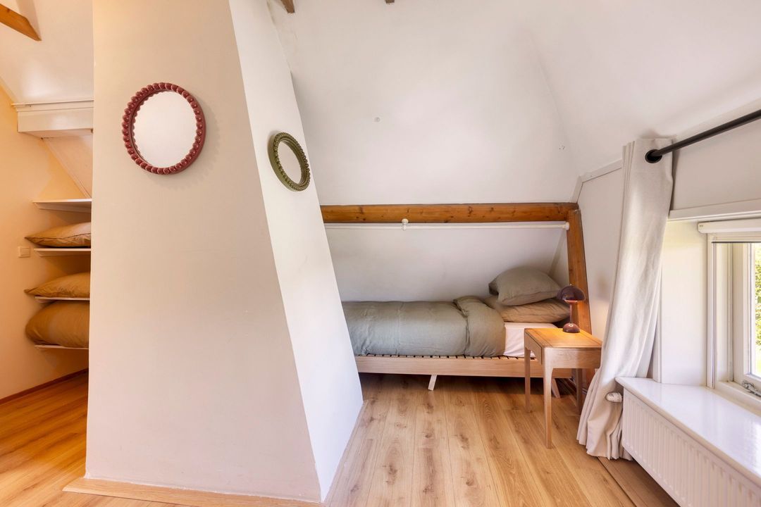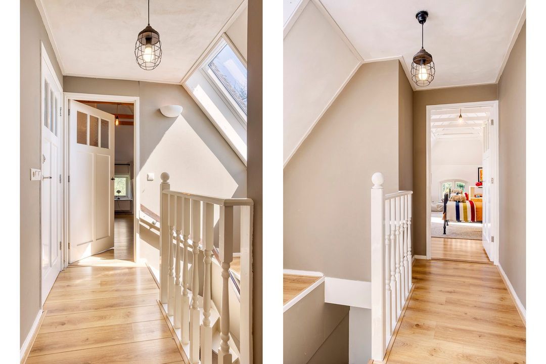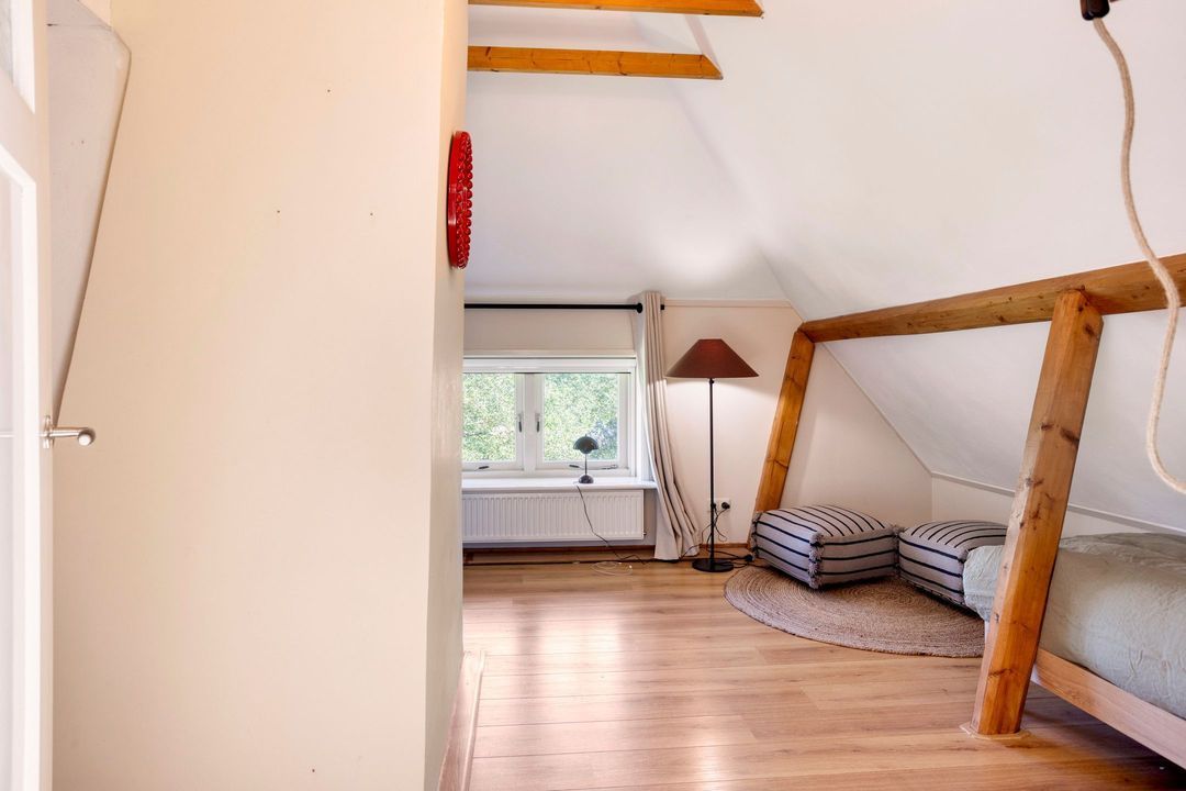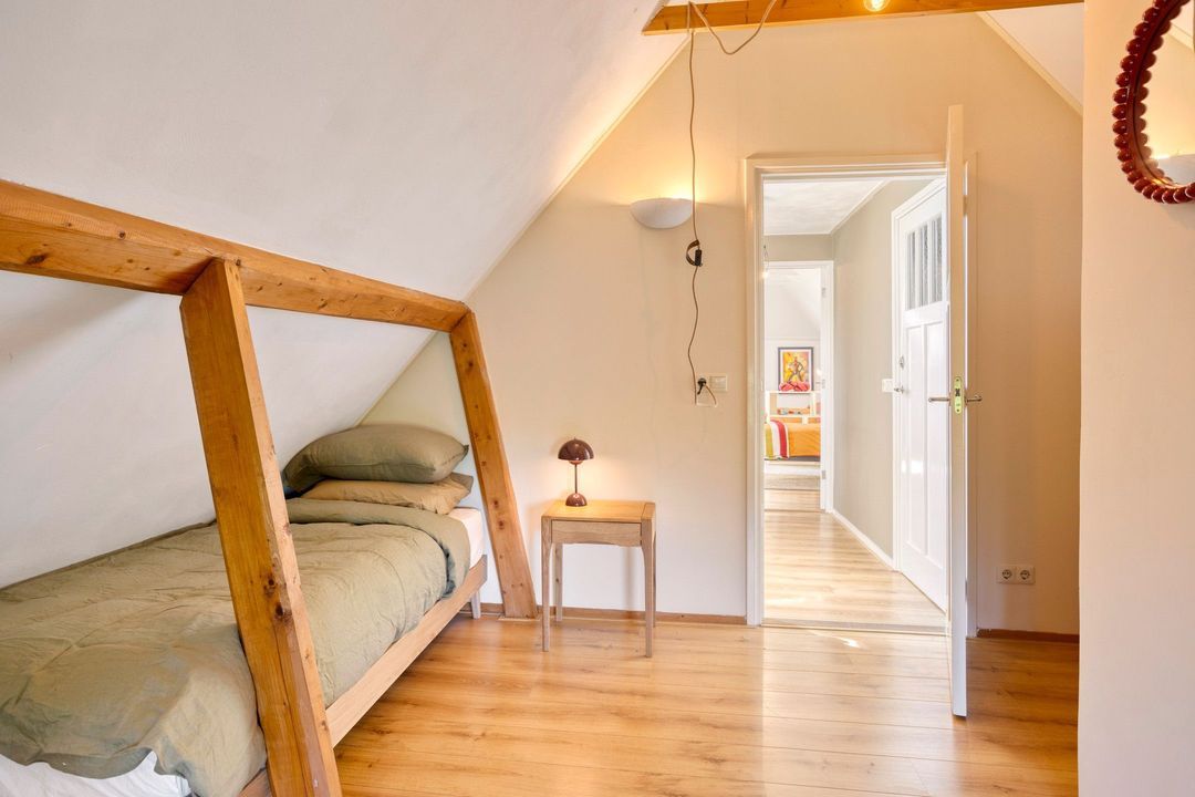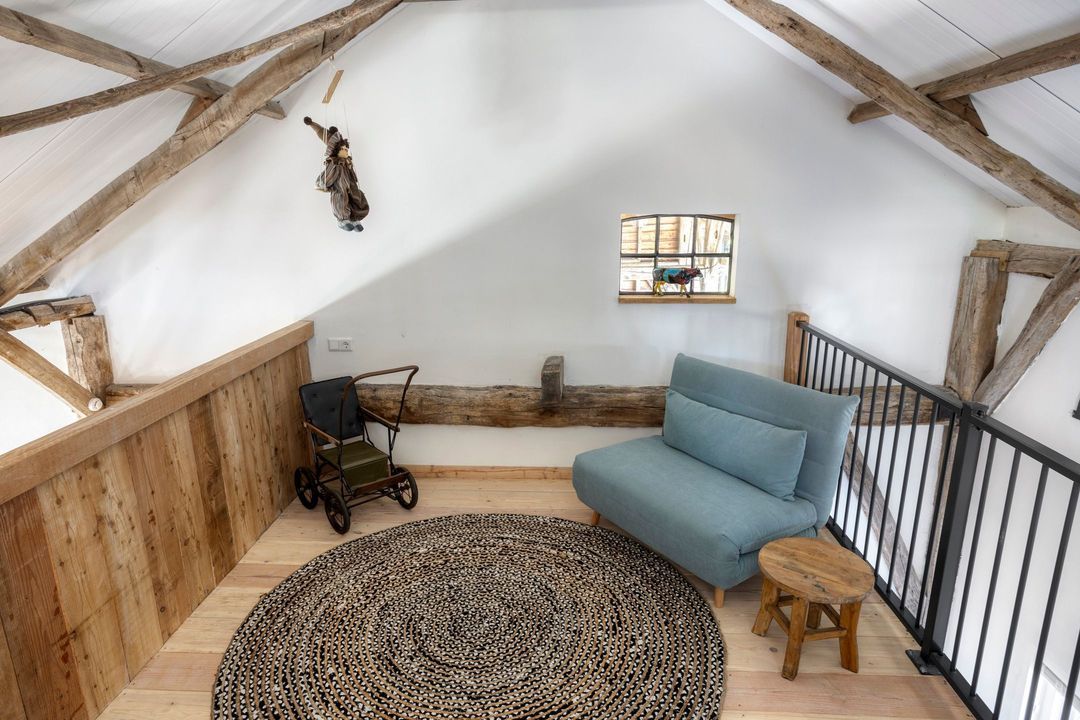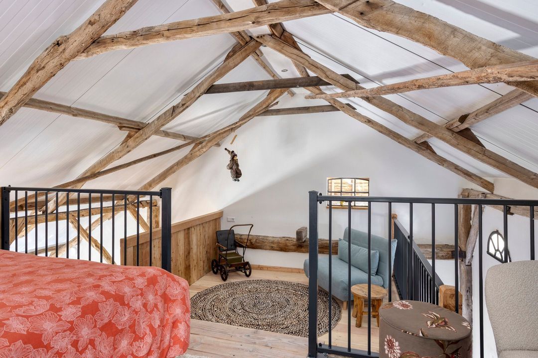 De bovenverdieping bestaat uit een overloop, een tweede badkamer met douche, toilet en wastafel, en twee sfeervolle slaapkamers met prachtige zichtbare gebinten.