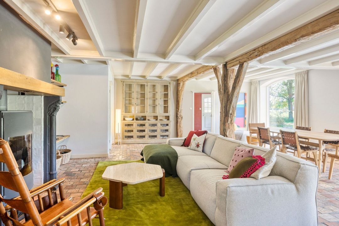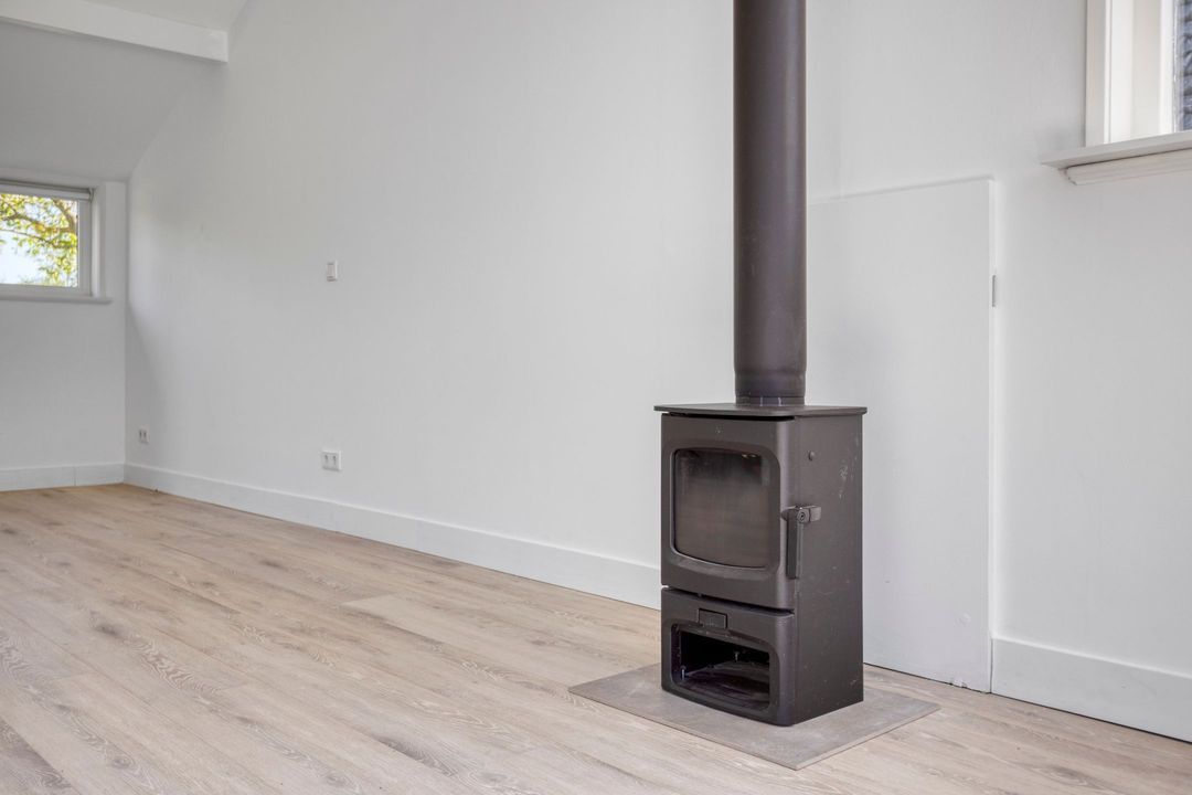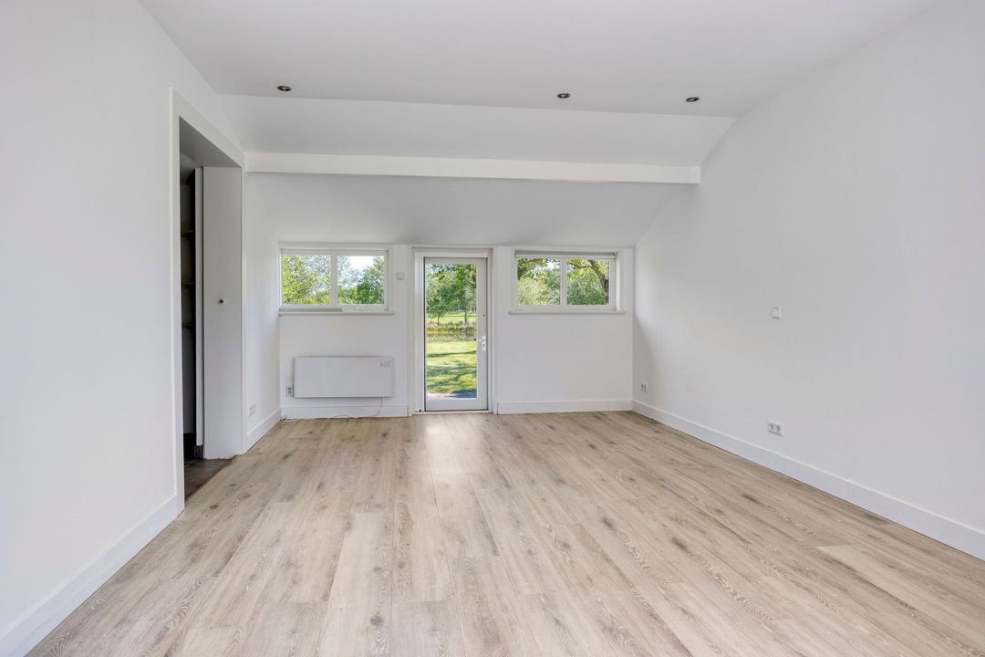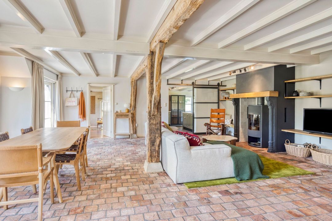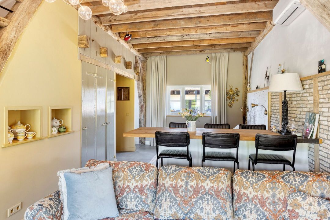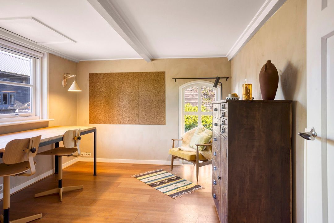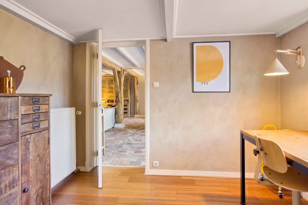 De woning biedt een warme en uitnodigende entree met hal en meterkast. De royale woonkamer ademt sfeer, met zichtbare originele gebinten, een estriken vloer met vloerverwarming, een sfeervolle schouw met houtkachel en openslaande deuren naar het zonnige terras op het zuiden. Aangrenzend vindt u een werkkamer en een ruime woonkeuken in landelijke stijl, voorzien van diverse inbouwapparatuur. Via de achteringang bereikt u een hal met toilet, een royale slaapkamer met airconditioning en een moderne badkamer met ligbad, inloopdouche, dubbele wastafel en toilet. Tevens zijn er een tweede slaapkamer (momenteel in gebruik als kledingruimte met kastenwand), een kantoorruimte en een praktische bijkeuken met keukenblok en aansluitingen voor wasapparatuur aanwezig.